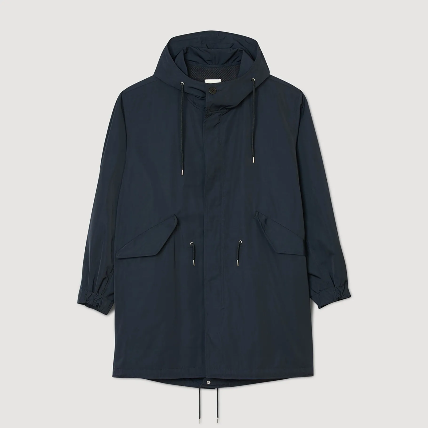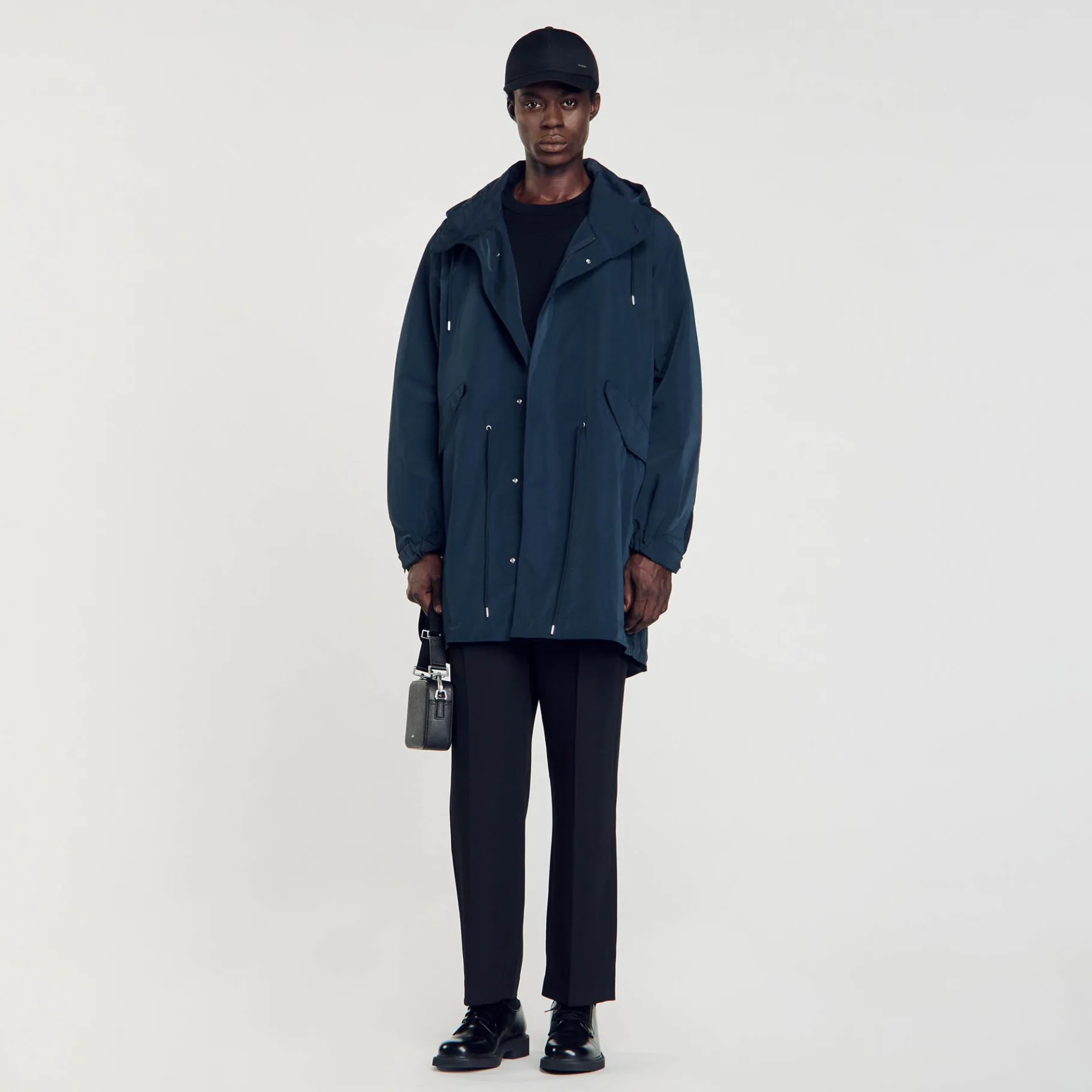 Parka Larga De Tejido Técnico Con Capucha, Manga Larga, Cierre De Botones Con Tapeta Recubierta, Bolsillos Con Solapas En Los Laterales Y Cordón Ajustable En El Bajo.