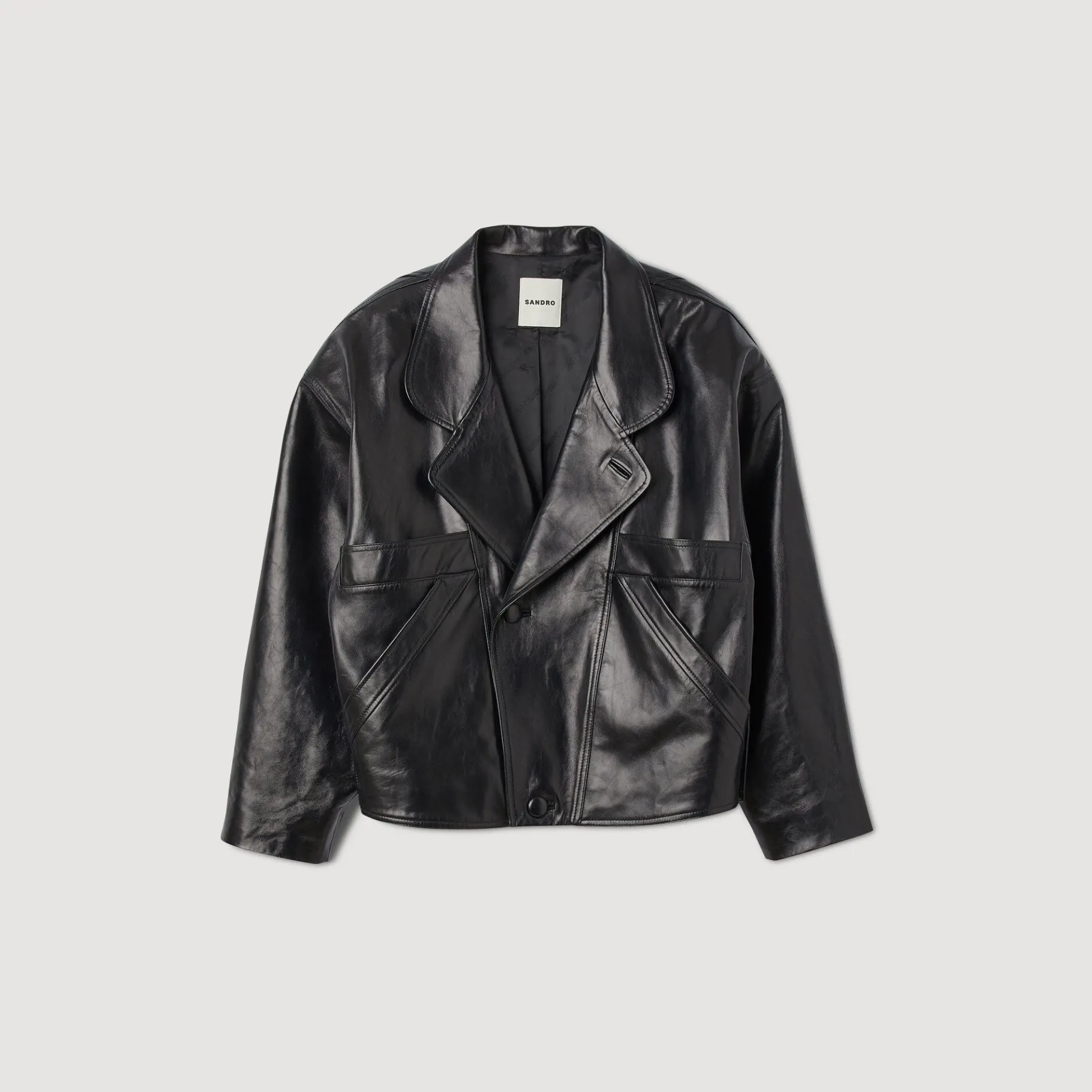 Cazadora De Cuero Sobredimensionada Con Cuello Con Dobladillo Estilo Sastre, Mangas Largas, Un Cierre Con Botones Cruzado Y Un Juego De Cortes En La Parte Delantera.