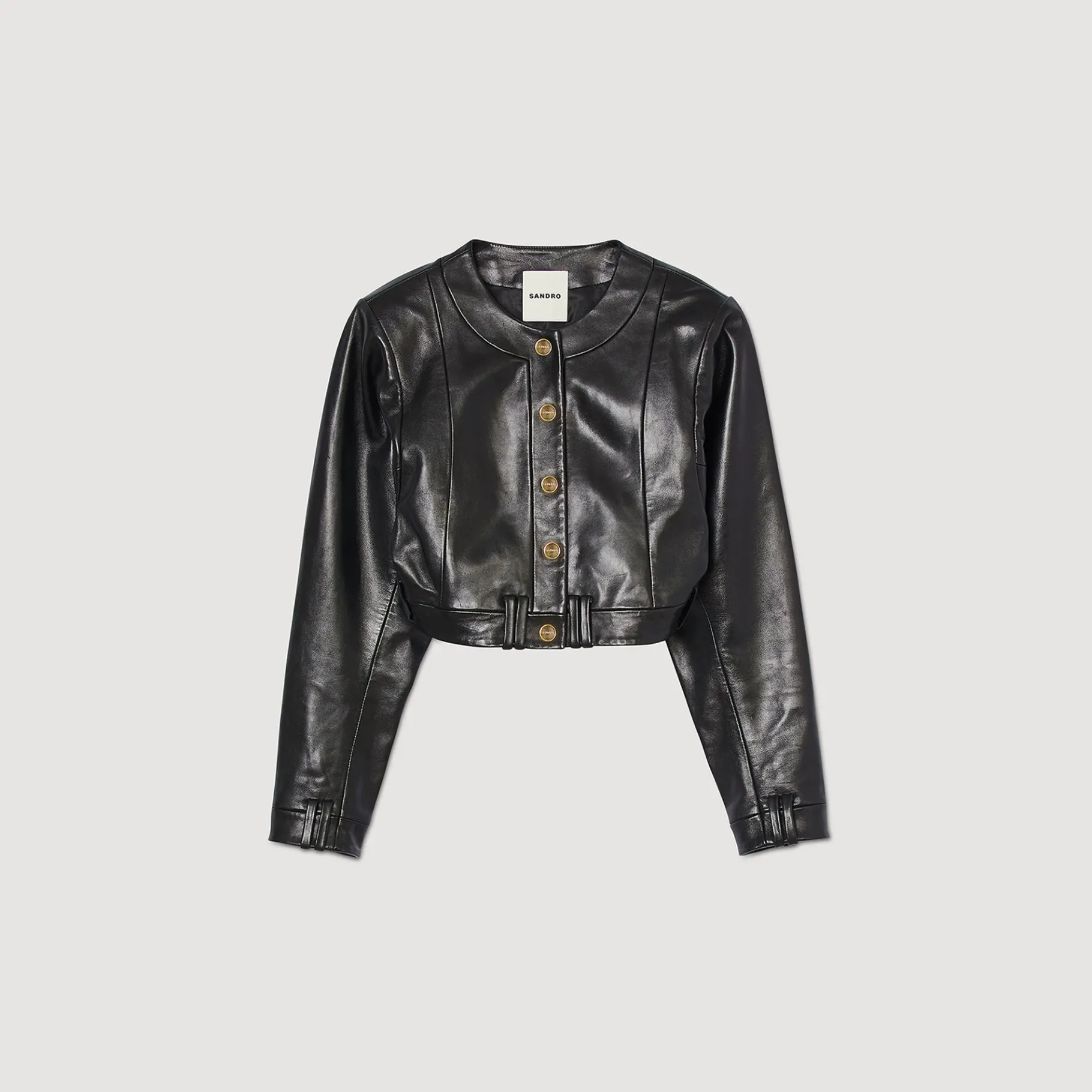 Cazadora Corta De Piel Con Aberturas, Con Escote Redondo, Manga Larga, Cierre Con Botones A Presión Y Juego De Trabillas En Cinturón Y Puños.