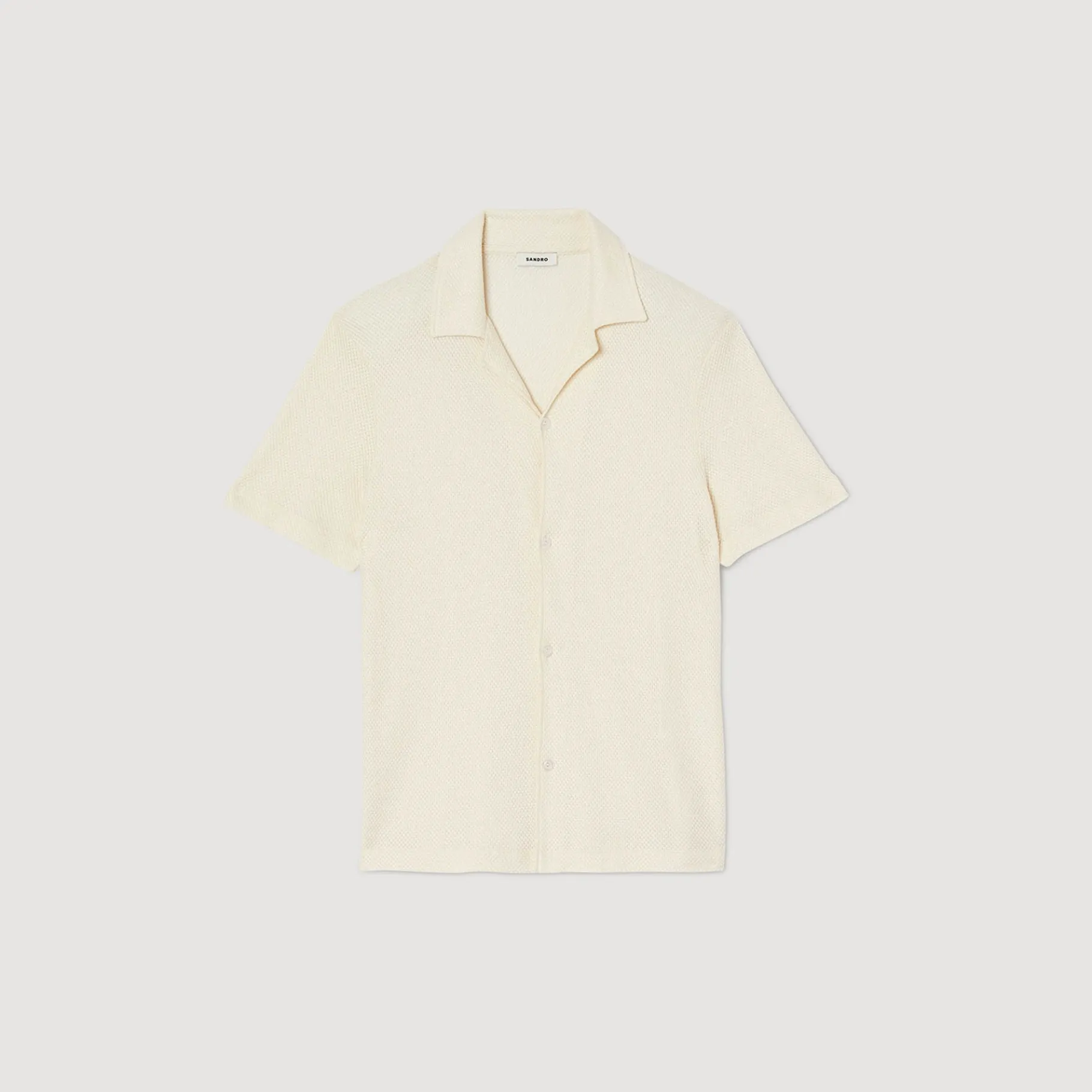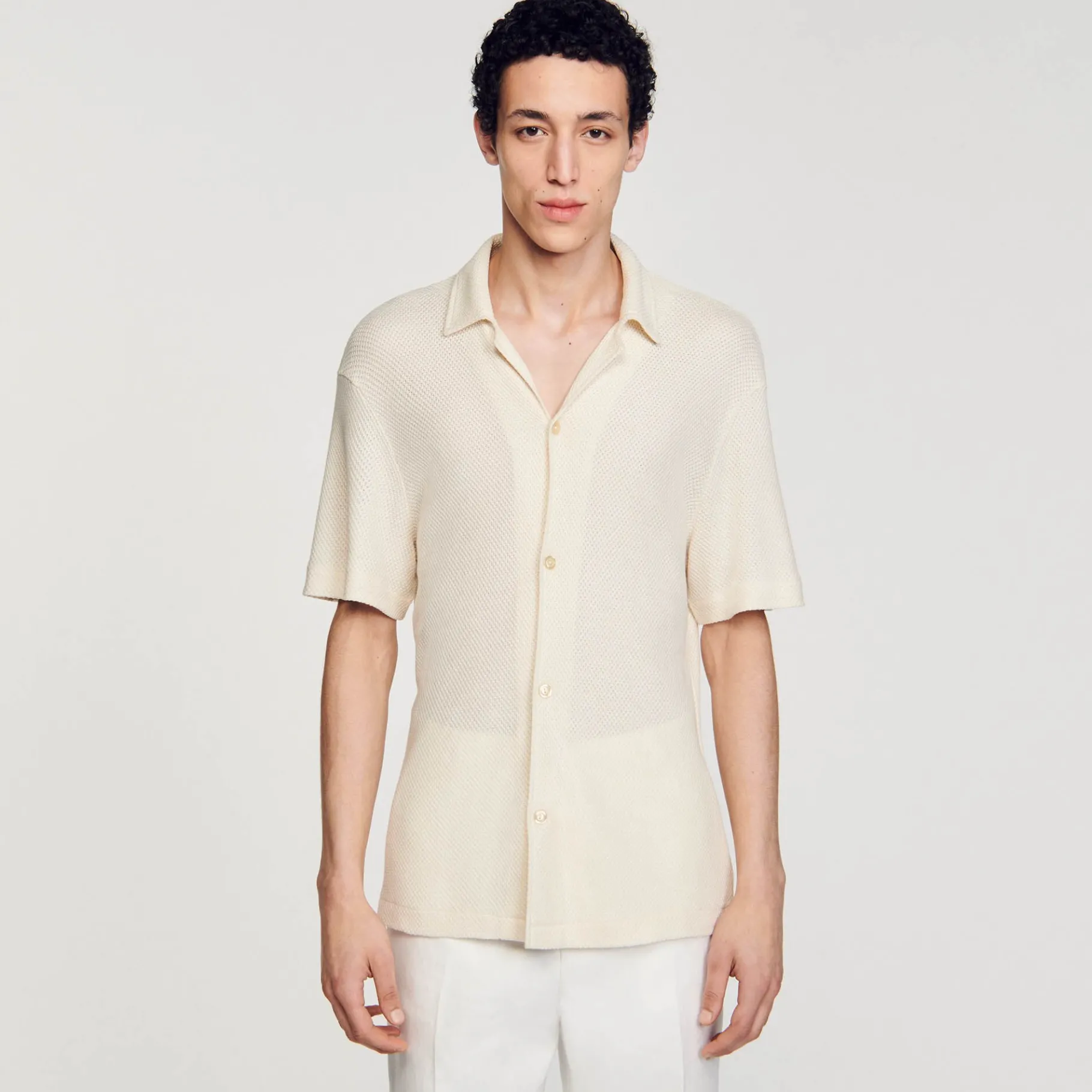 Camisa De Punto Calado Con Cuello Italiano, Manga Corta Y Cierre De Botones.