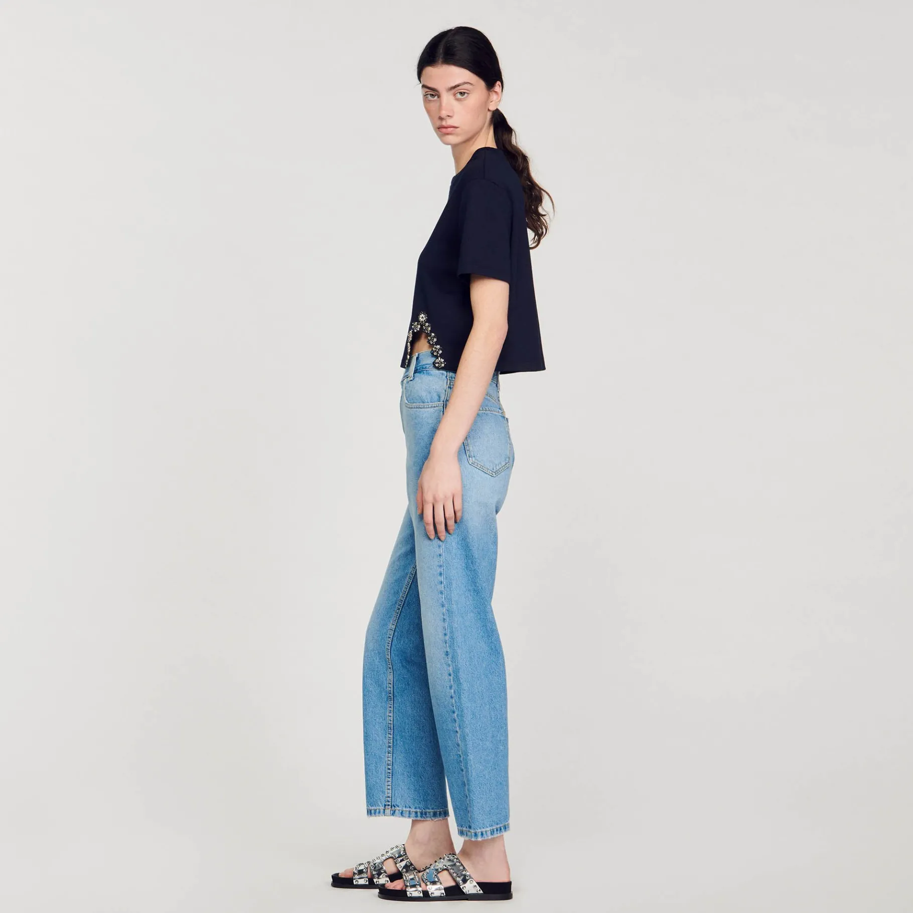 Camiseta Corta Con Cuello Redondo, Manga Larga, Pequeñas Aberturas Delanteras Y Detalle De Cristales En Forma De Flores.