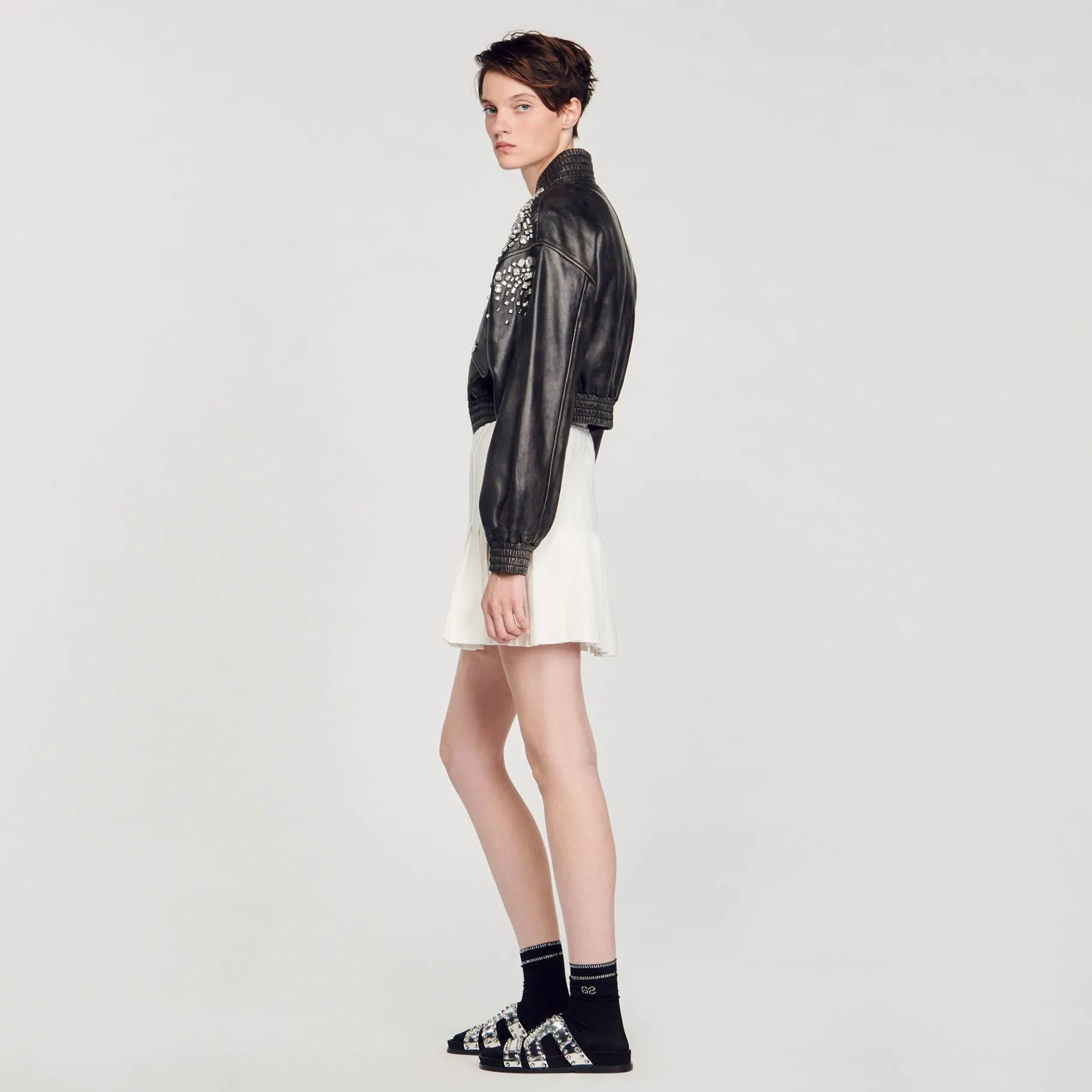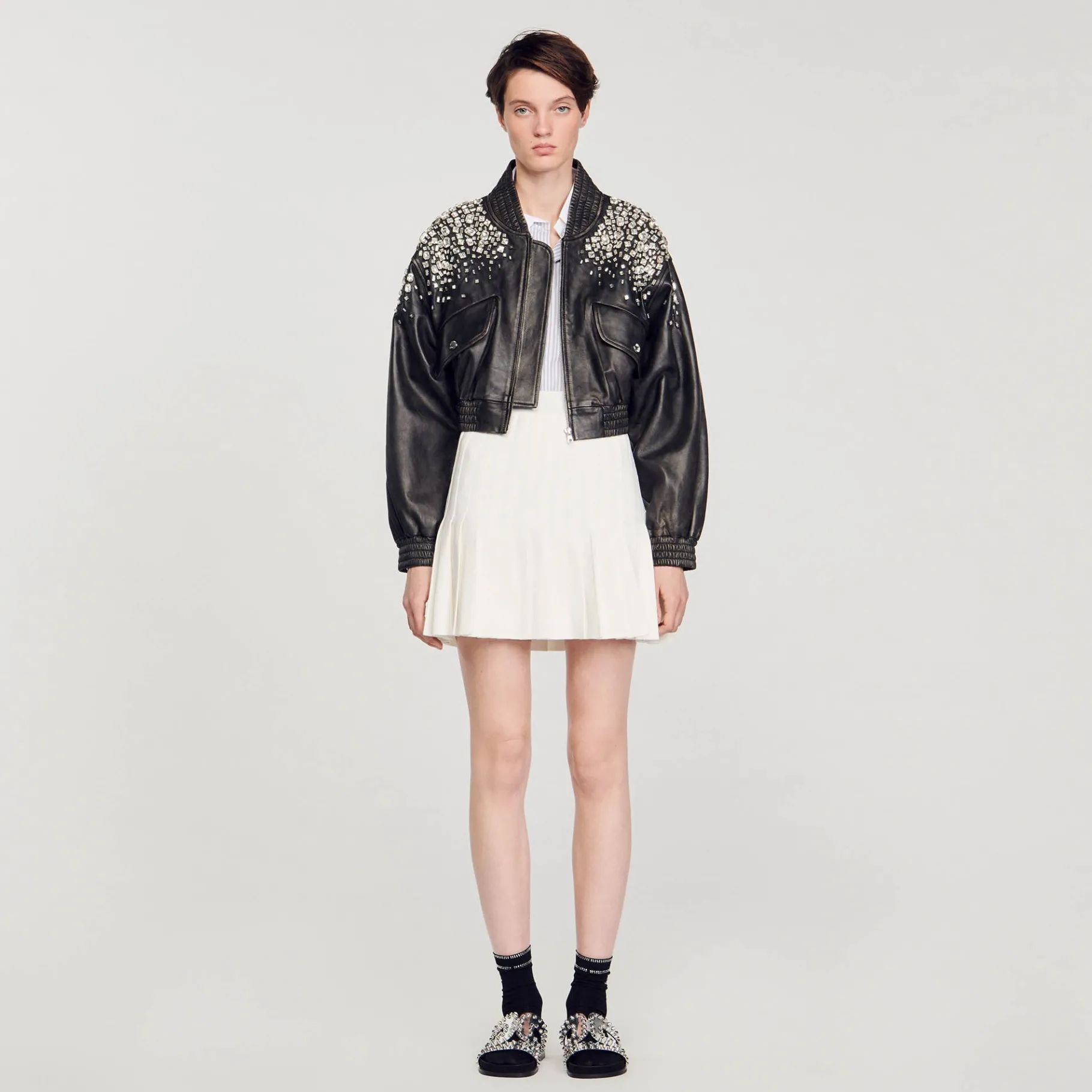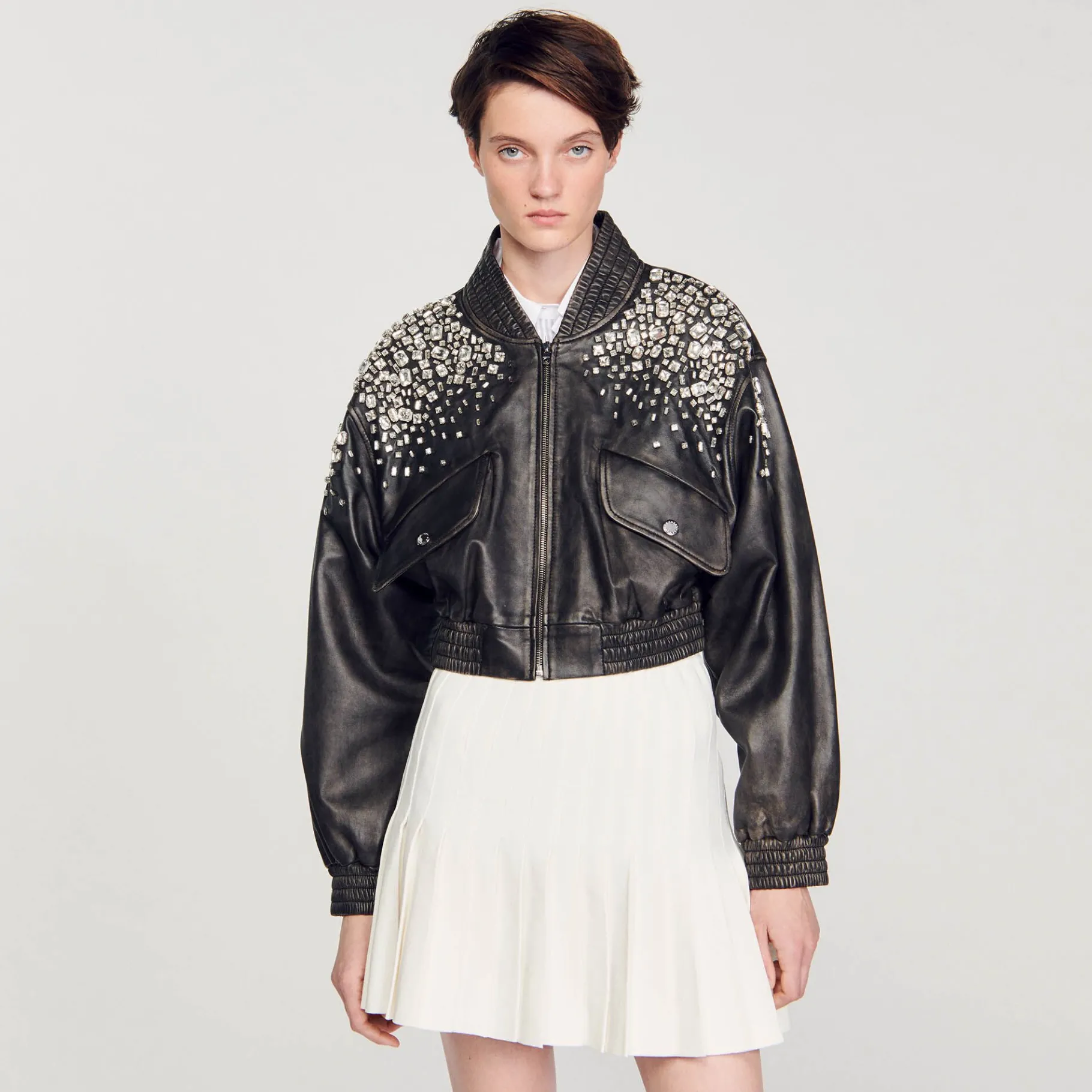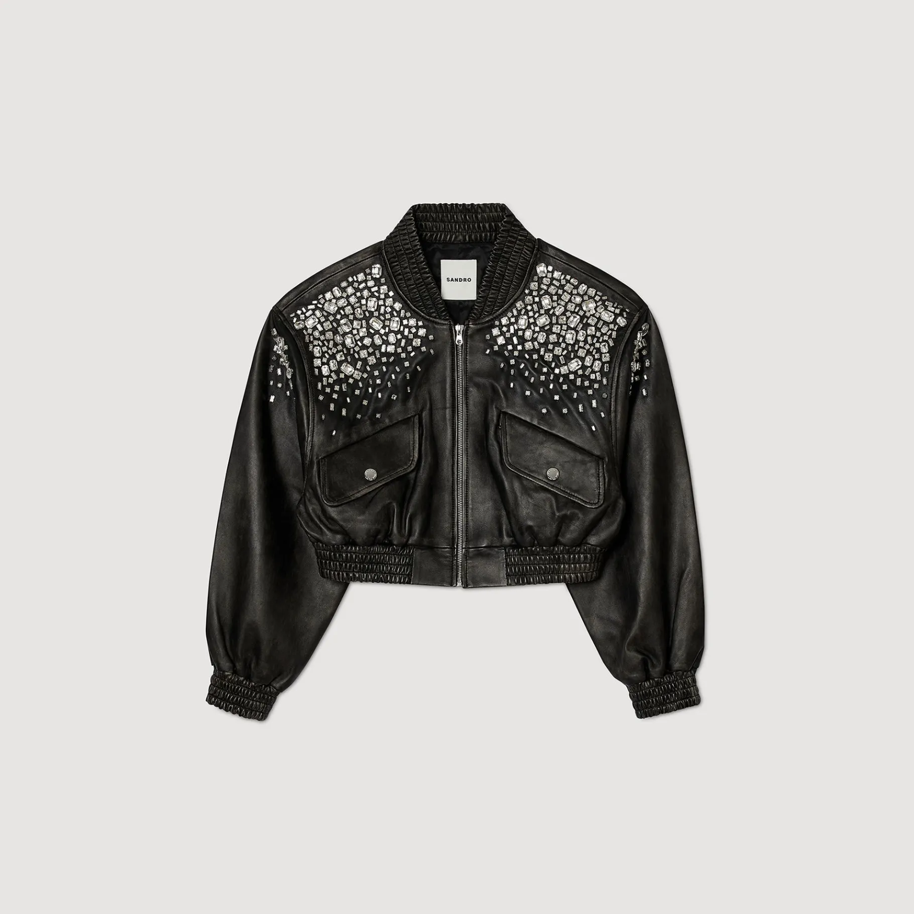 Cazadora Bomber Corta De Cuero Vintage Con Detalle De Cristales De Distintos Tamaños En Los Hombros Y Por Delante, Manga Larga, Bolsillos Grandes Con Solapa Y Detalle De Frunces En El Cuello, La Cintura Y Los Puños.