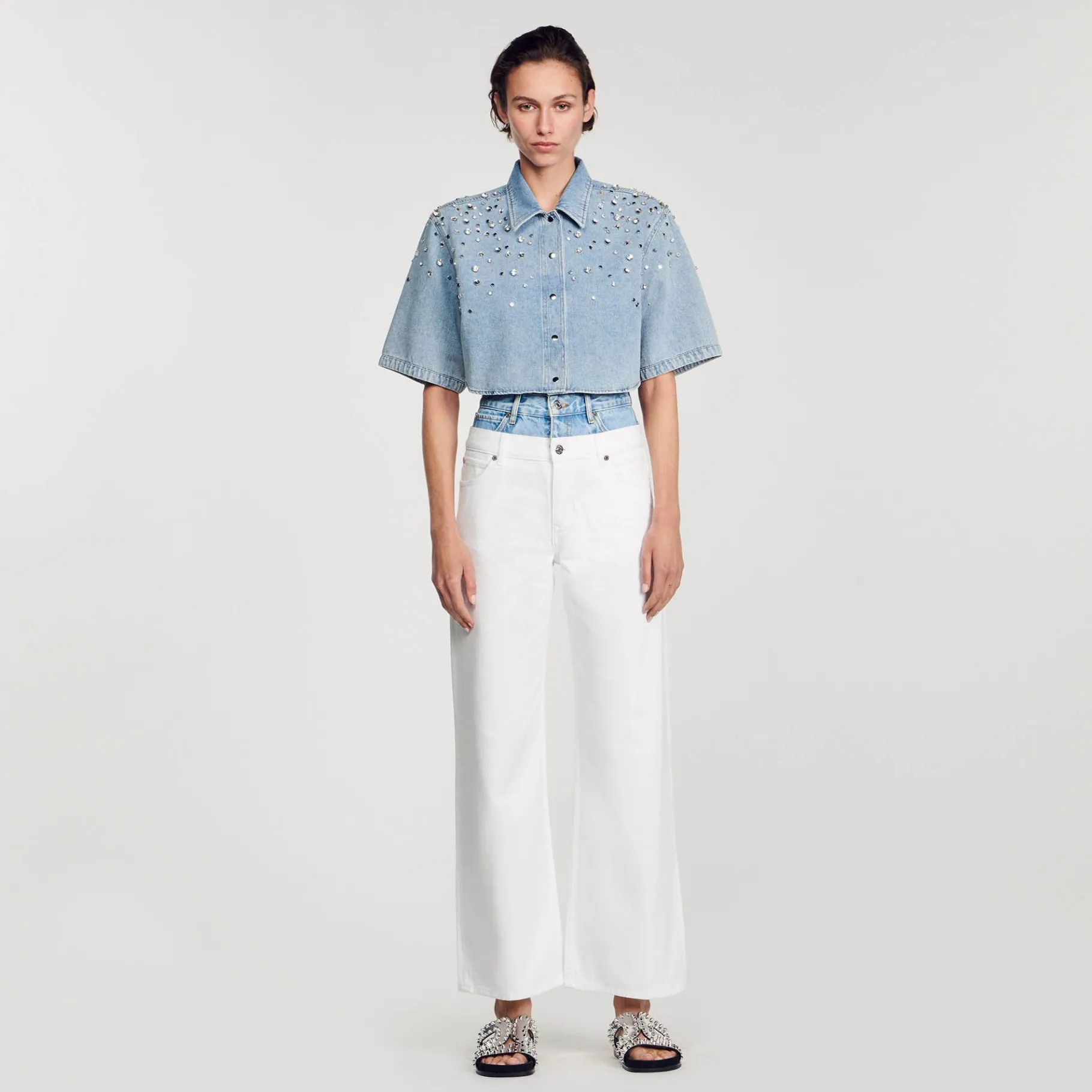 Camisa Vaquera Corta Con Manga Corta, Cuello De Camisa, Cierre De Botones Y Detalle De Tachuelas Y Strass De Color Plateado.