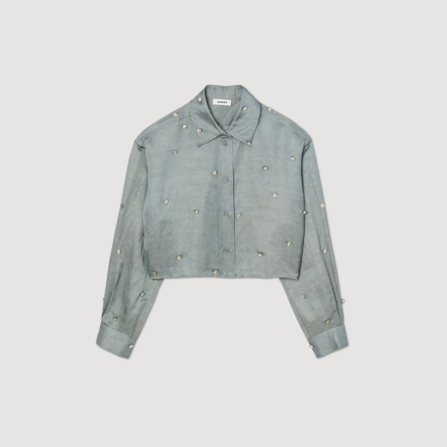 Camisa Corta Fluida Y Satinada De Viscosa Y Lino, Con Manga Larga, Cierre De Botones Y Detalle De Bordados De Strass All Over.