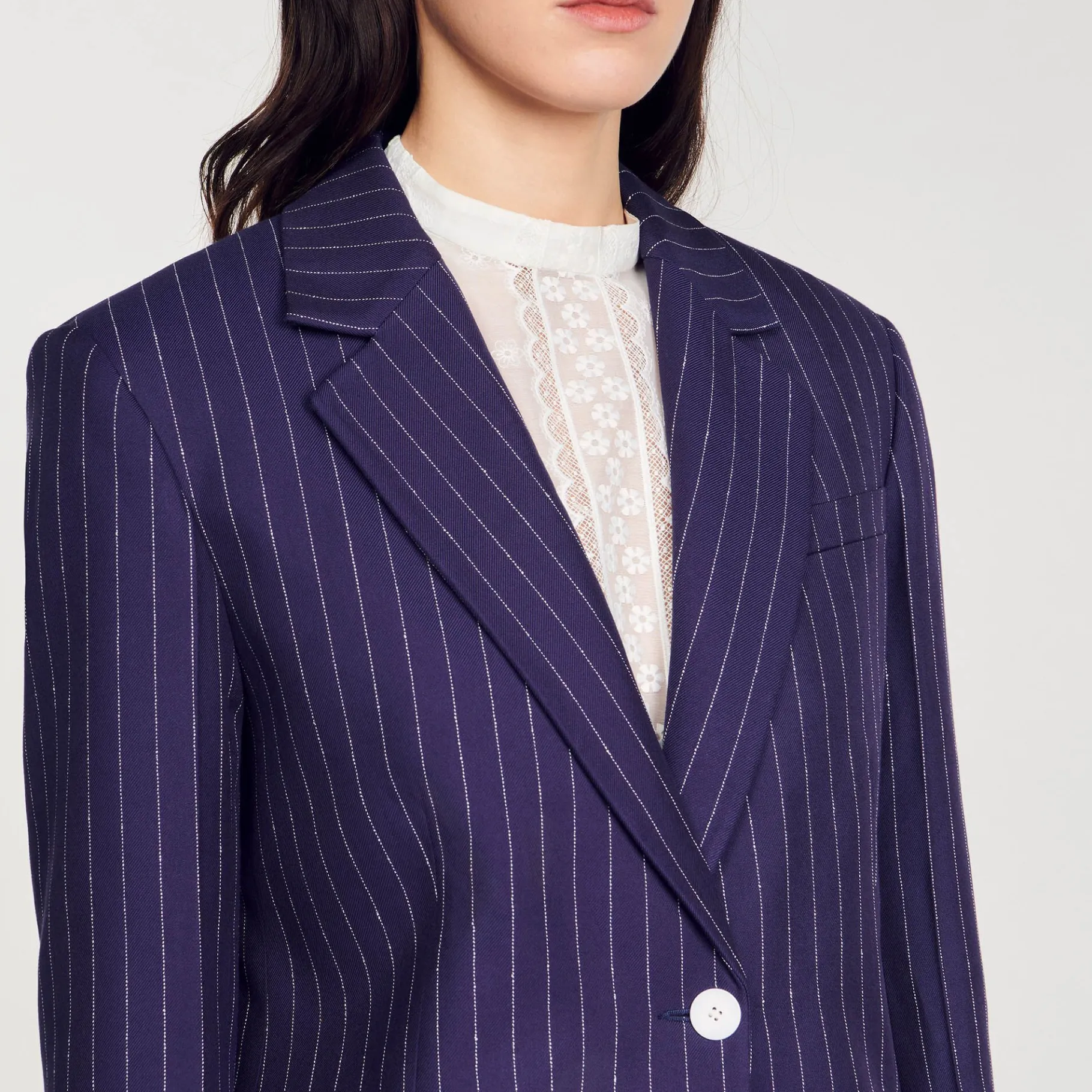 Chaqueta Sastre De Raya Diplomática Con Cuello De Solapa Con Muesca, Manga Larga, Bolsillos Con Solapa Y Cierre De Botón.