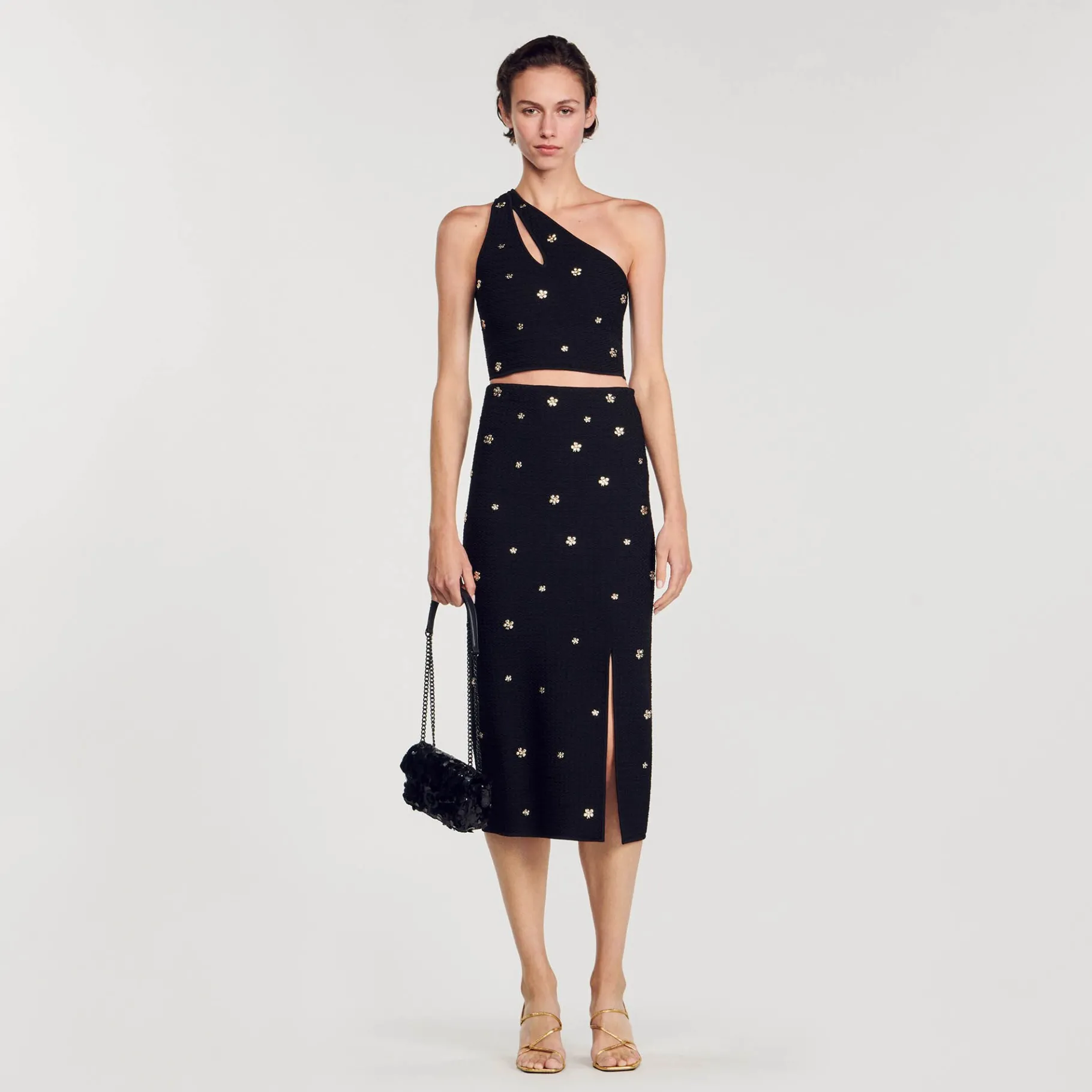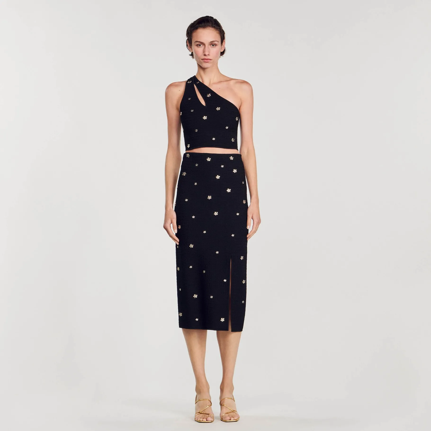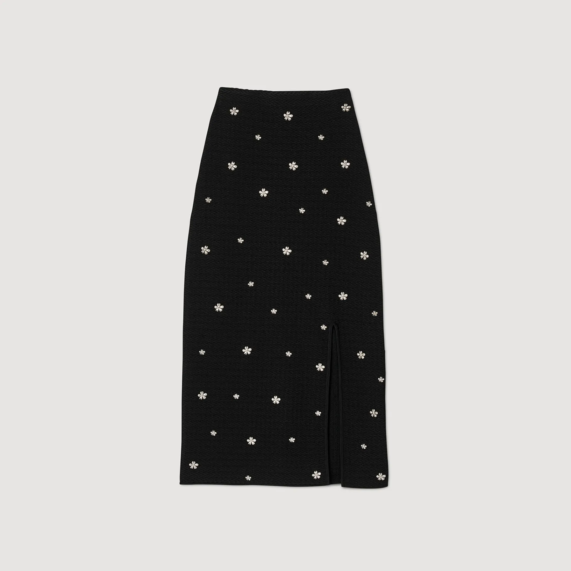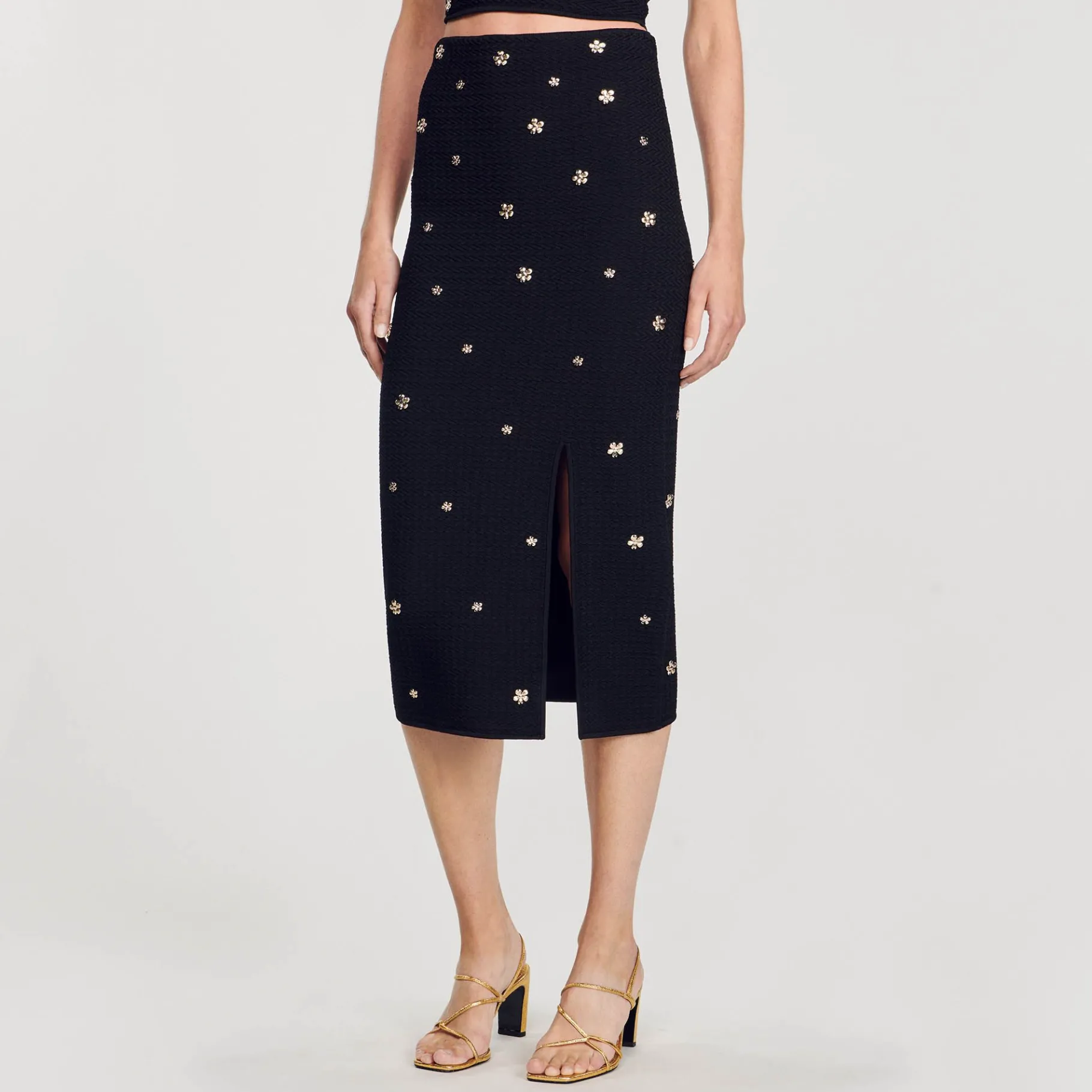 Falda Midi De Punto Texturizado Decorada Con Piezas Metálicas En Forma De Flores, Con Cintura Con Un Borde De Punto «Cocotte» Y Una Raja En El Lateral.