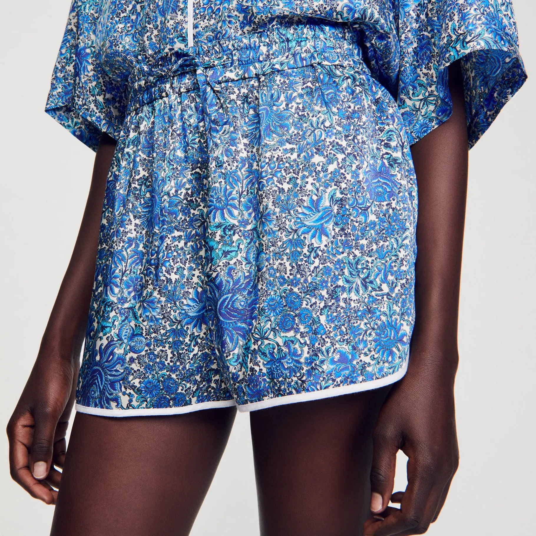 Pantalón Corto Fluido Con Estampado De Flores, Franja En Contraste, Cintura Fruncida Con Tiras Y Bolsillos Italianos.