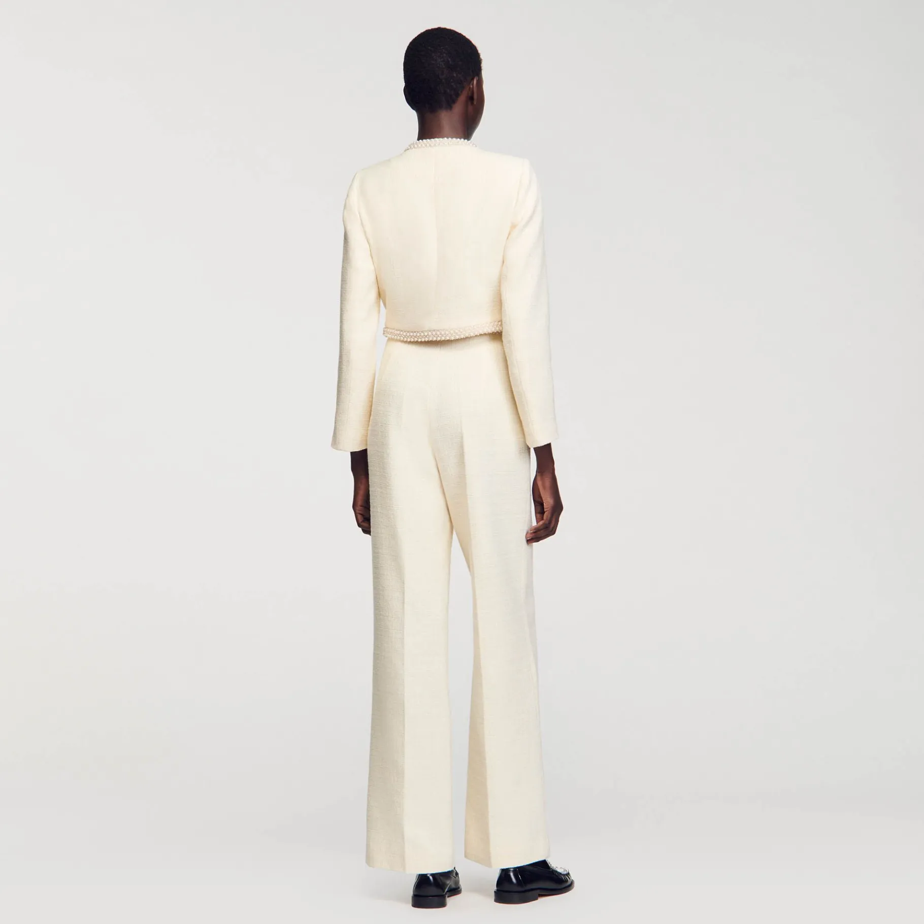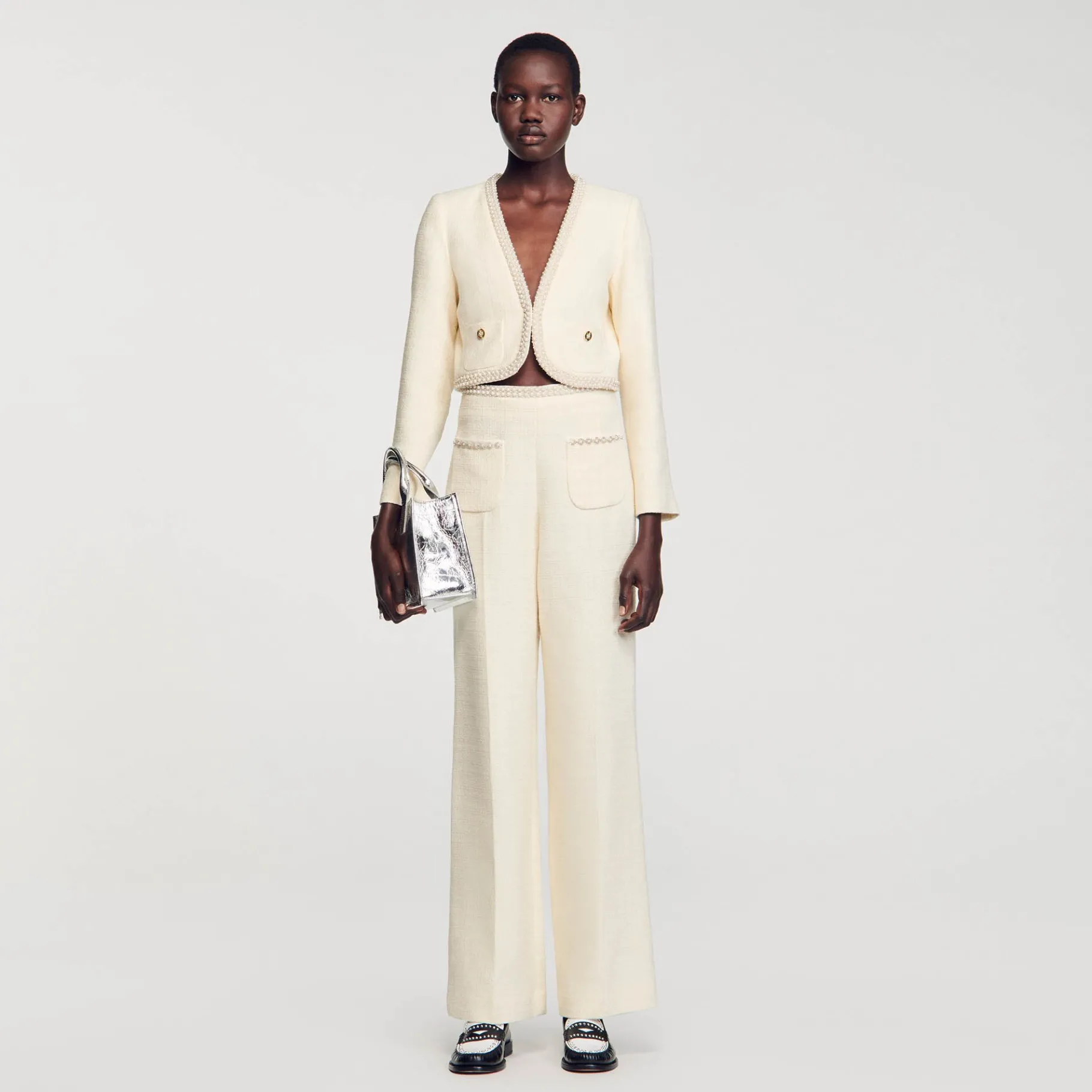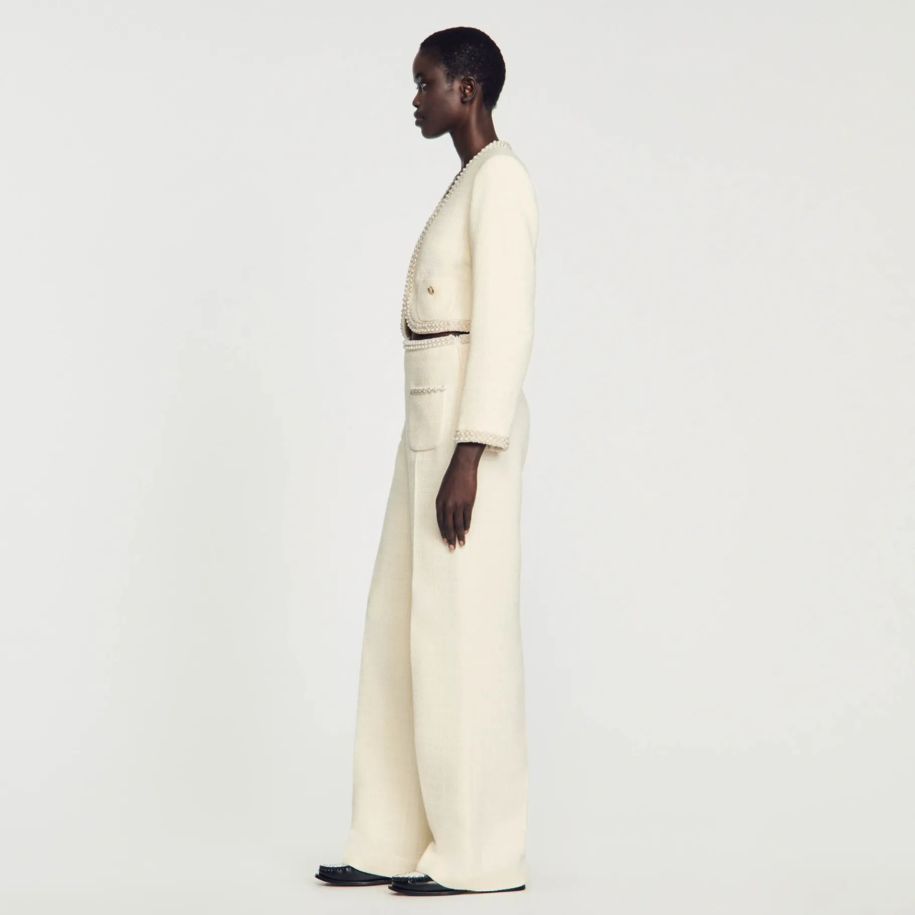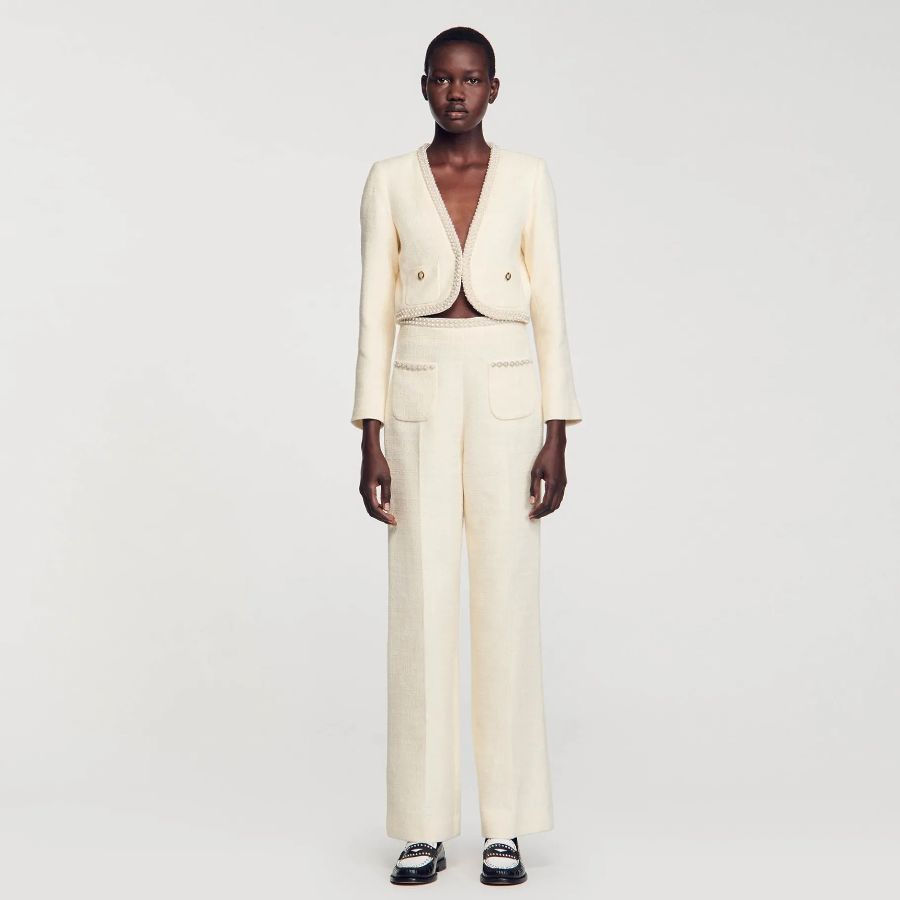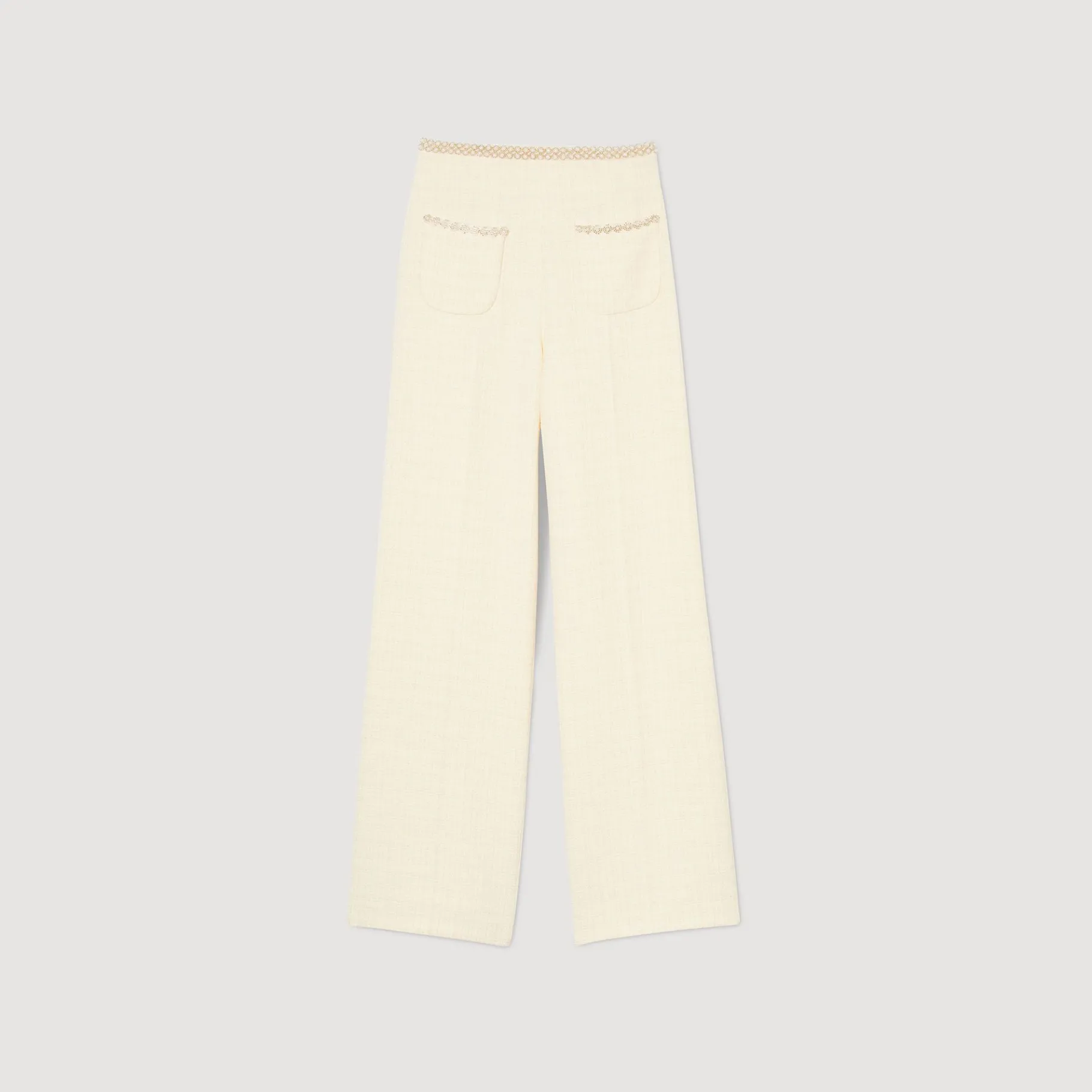 Pantalón De Sarga De Talle Alto Decorado Con Trenza De Pedrería Y Bolsillos De Parche En La Cintura.