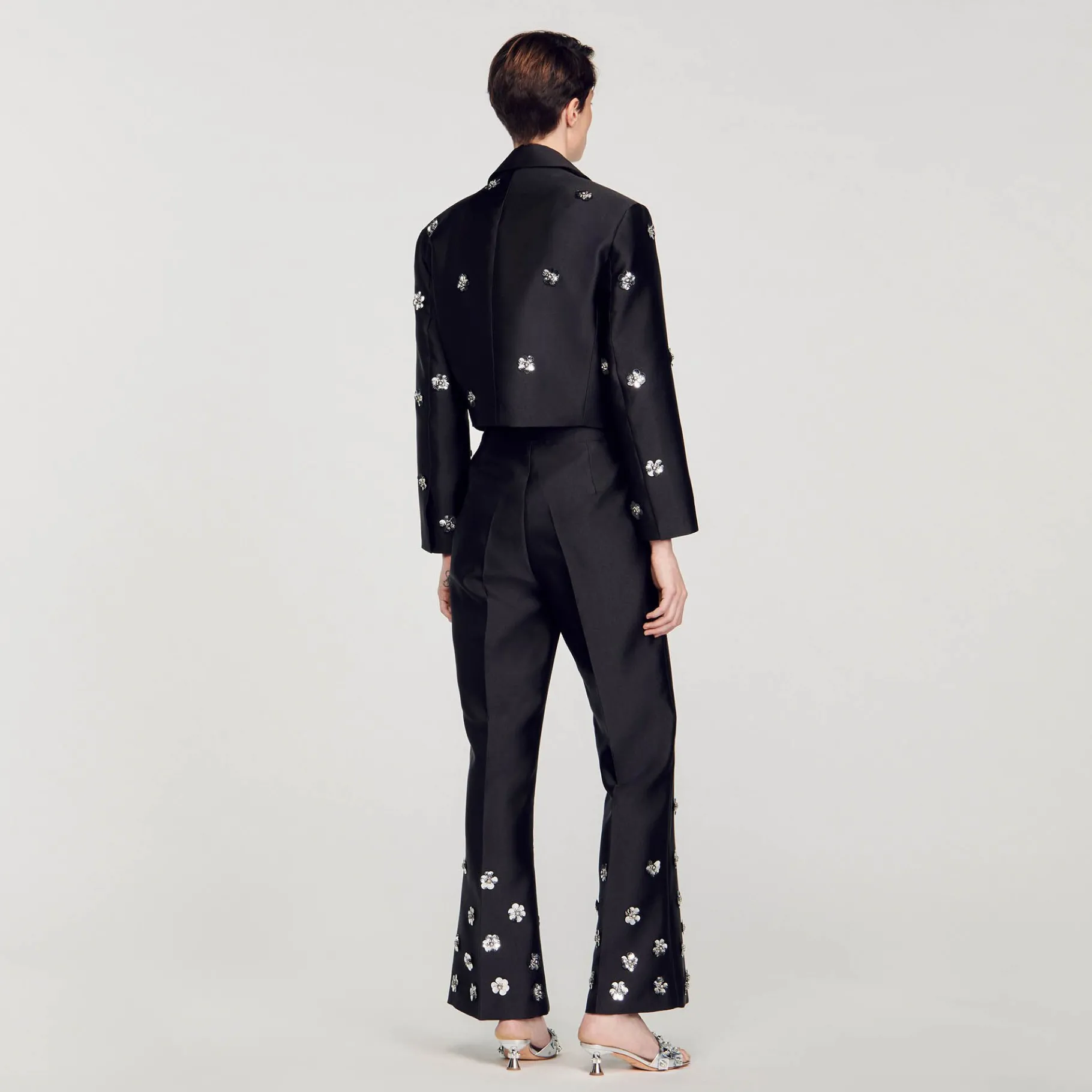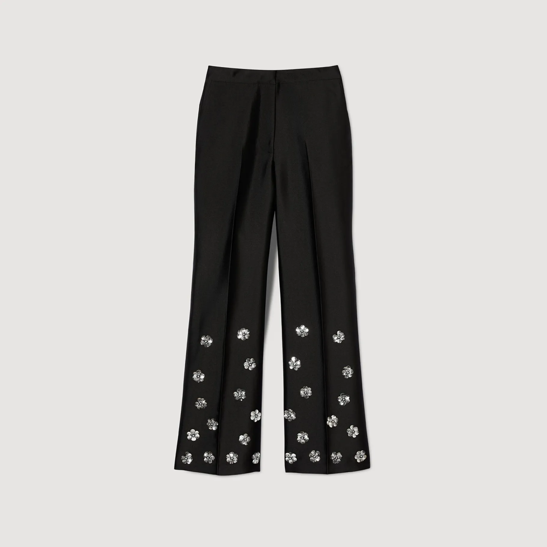 Pantalón Satinado Con Corte Acampanado Decorado Con Flores Metalizadas Bordadas En El Bajo.