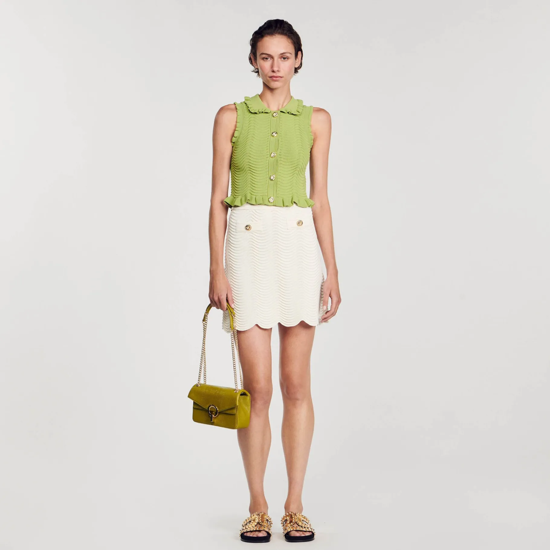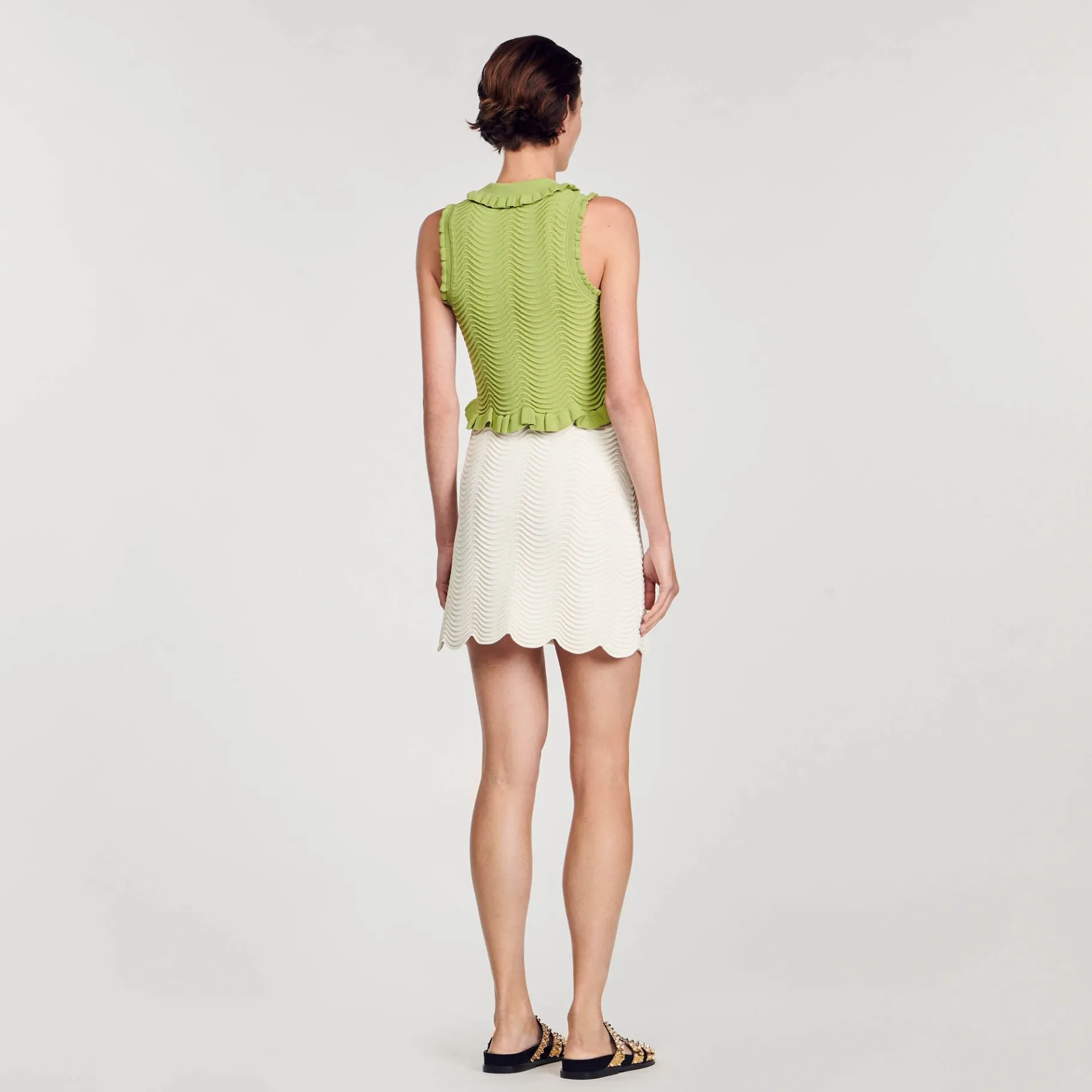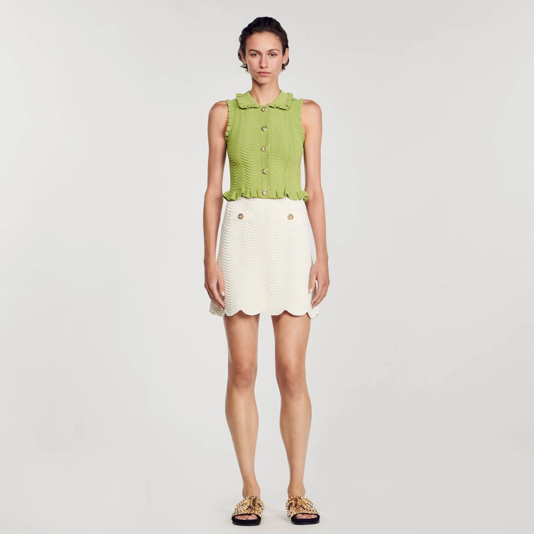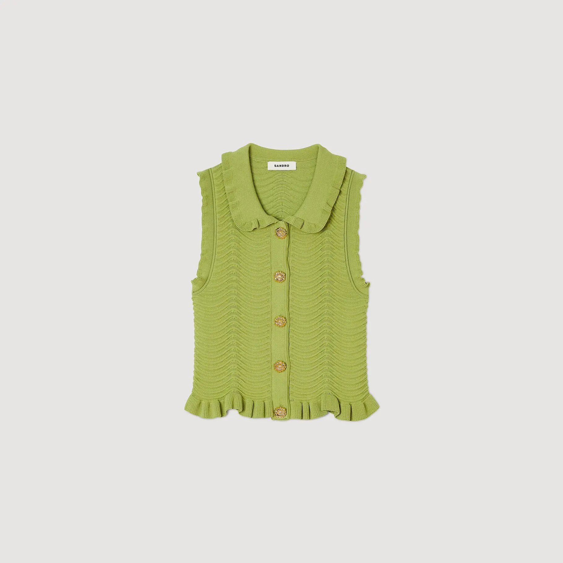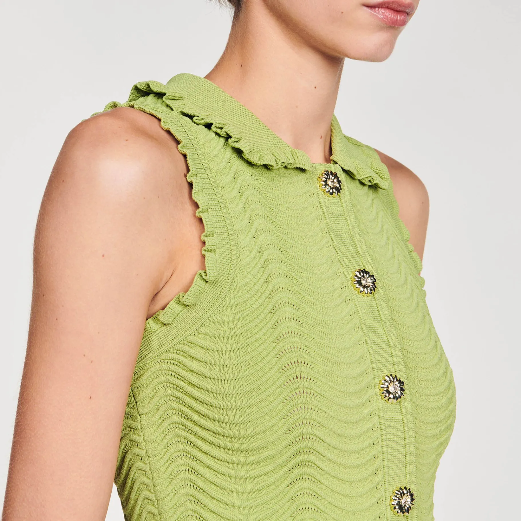Top Sin Mangas De Punto Con Textura, Con Cierre De Botones Joya, Cuello Babero Y Bordes Con Volantes.