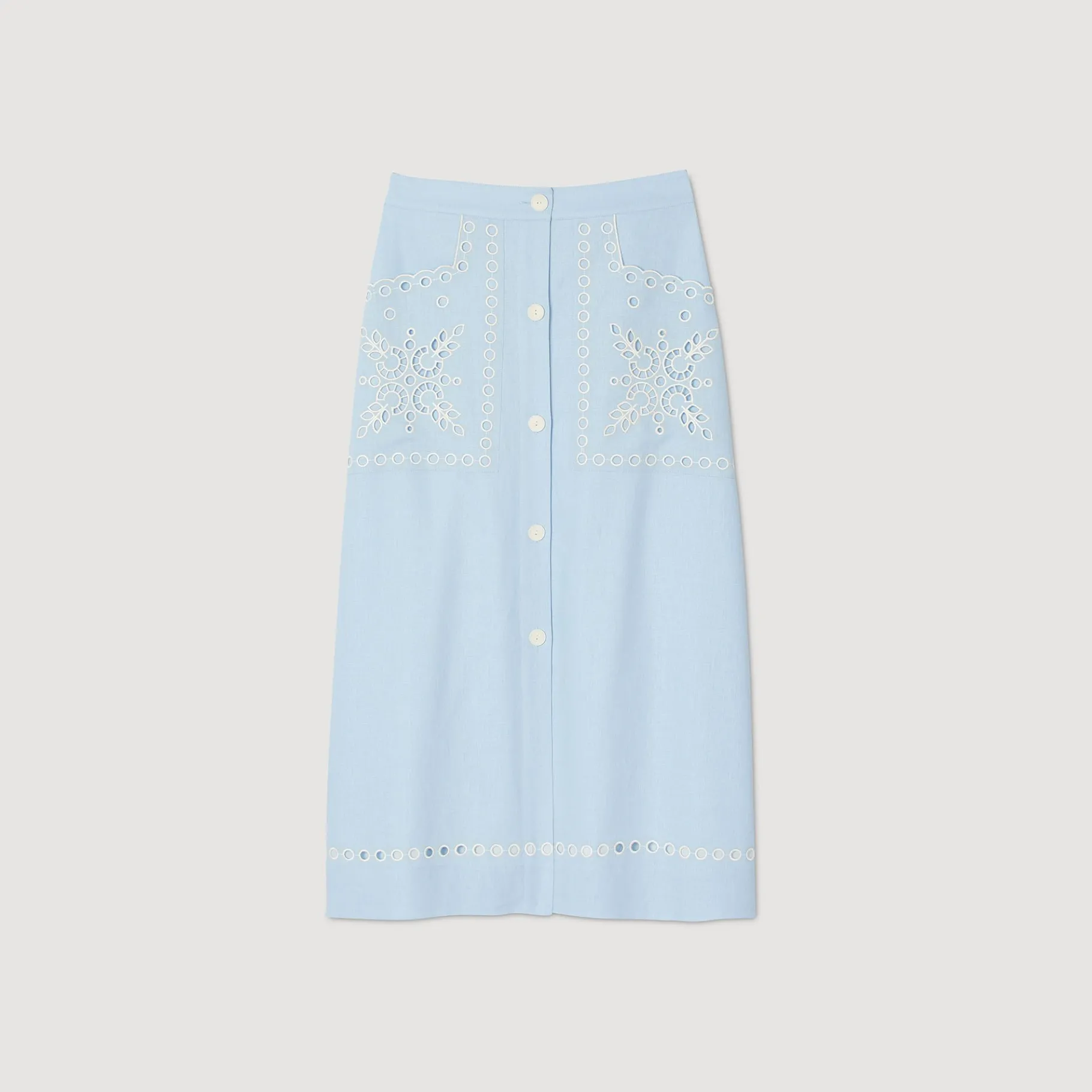 Falda Larga Con Botones Y Detalle De Bordado Inglés Con Flores En Contraste En Los Bolsillos Y El Bajo.