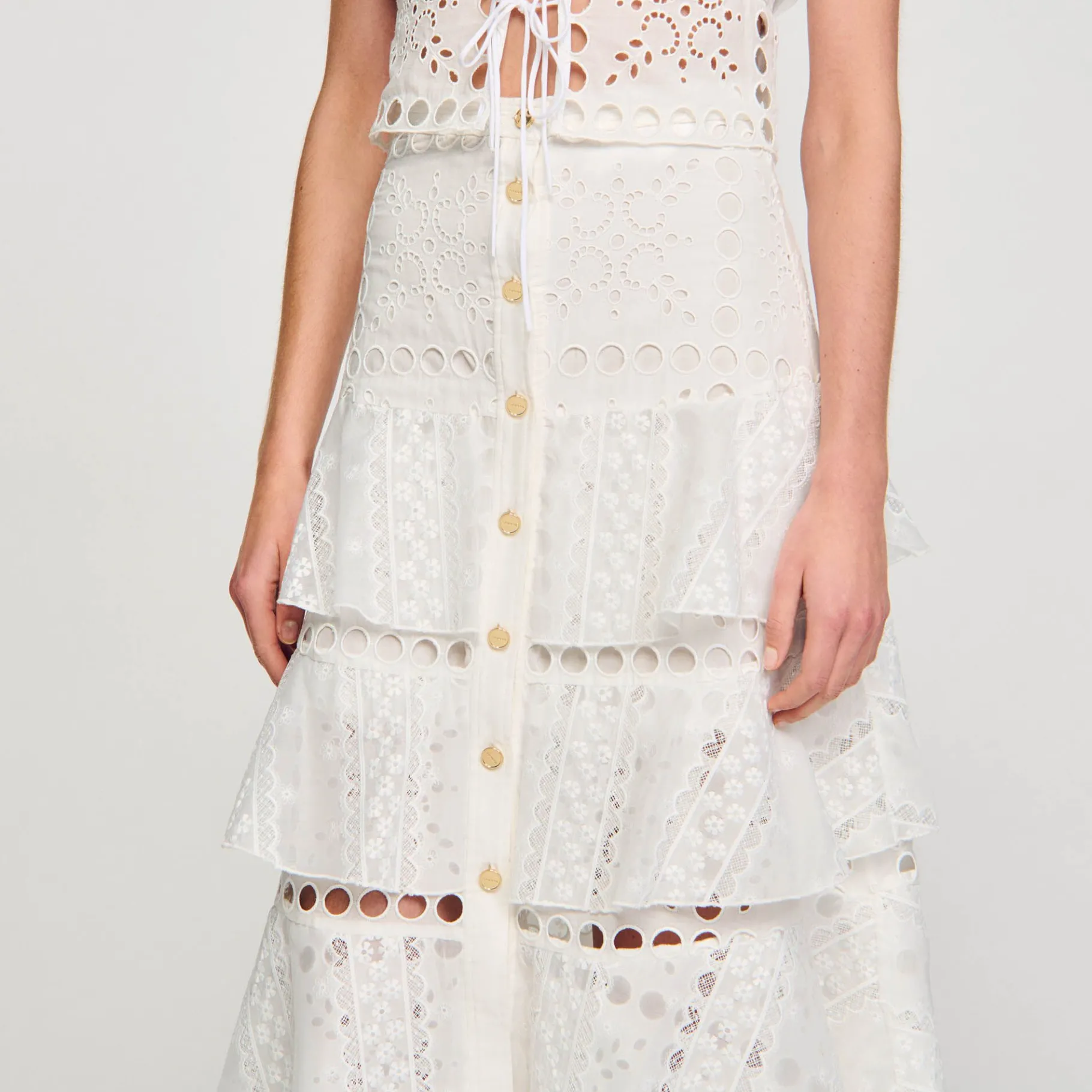 Falda Larga Con Volante, Bordado Inglés Calado, Ribetes De Encaje, Cierre De Botones Y Abertura Delantera.