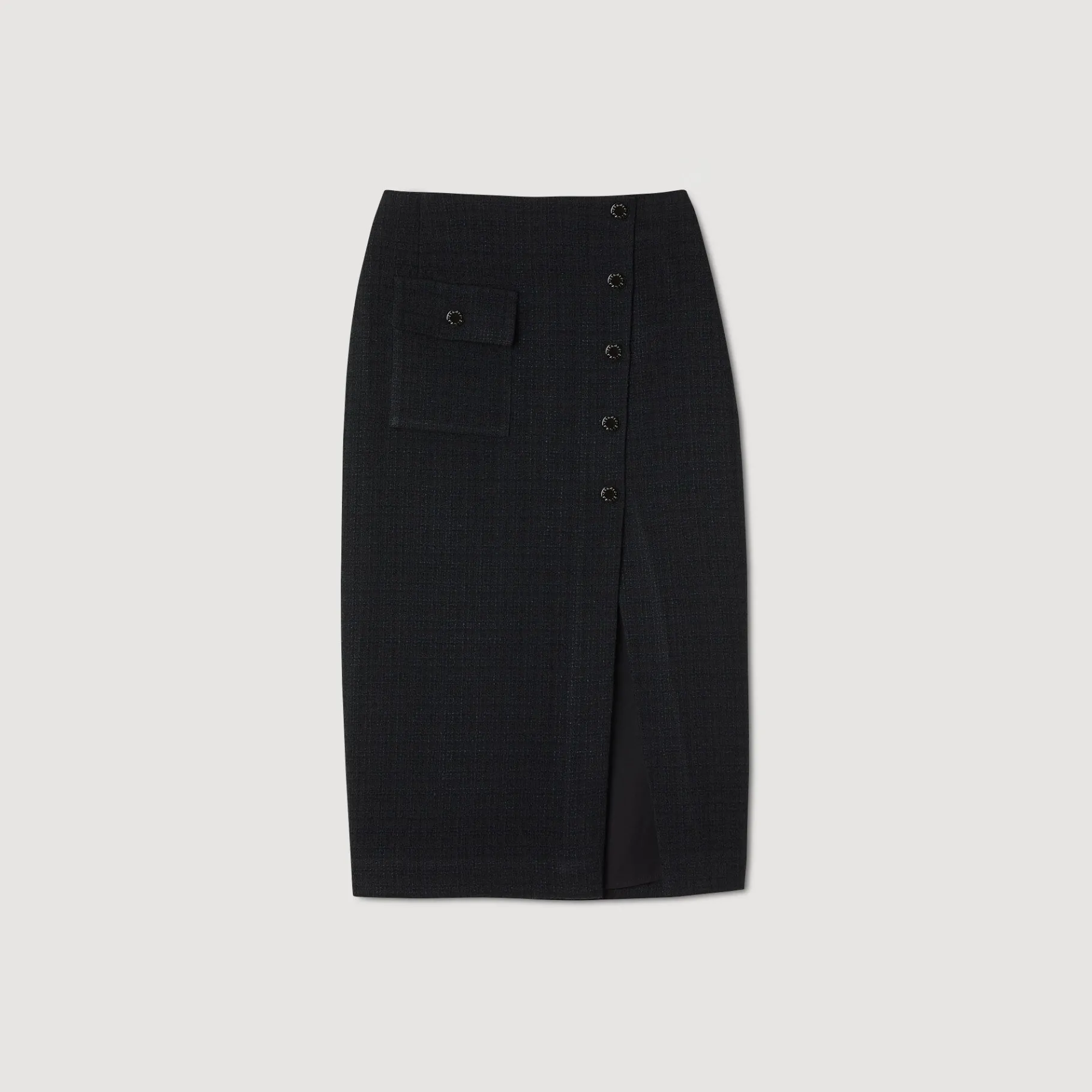 Falda Midi De Tweed Con Abertura En La Parte Delantera, Un Bolsillos De Parche Con Solapa En El Lateral Y Botones Automáticos Con La Firma Sandro.