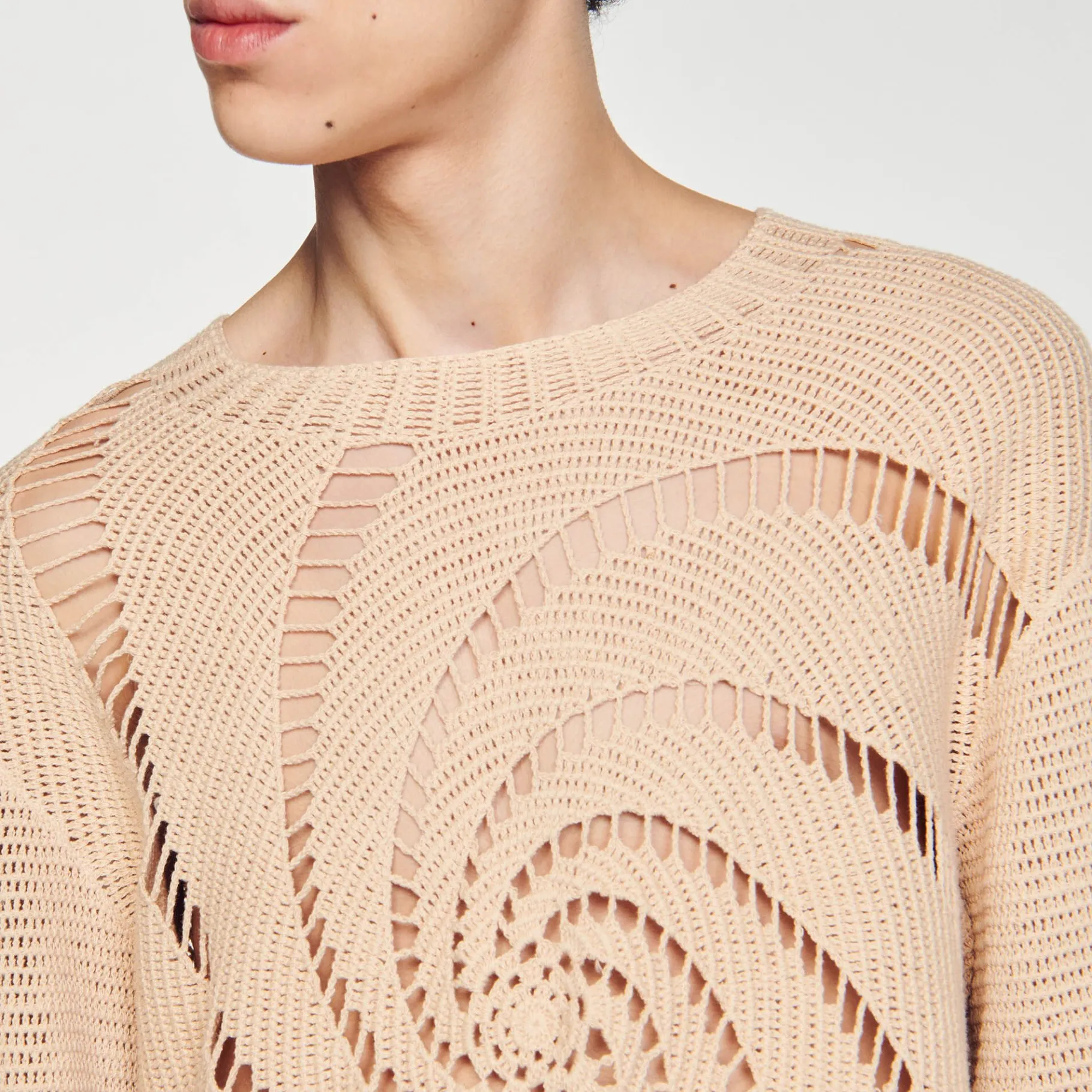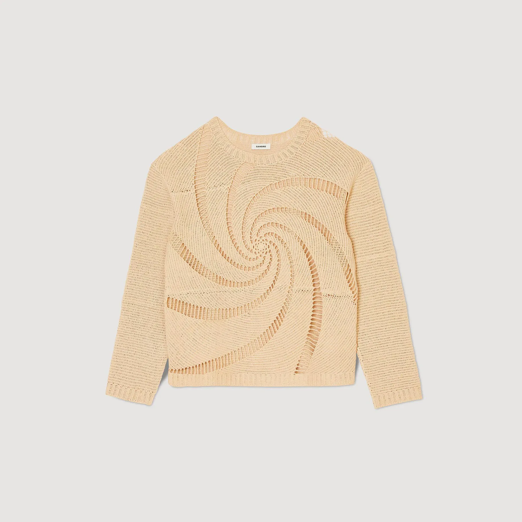 Jersey De Punto De Algodón Con Efecto De Croché, Cuello Redondo Y Manga Larga, Decorado Con Un Efecto De Espiral Calada.