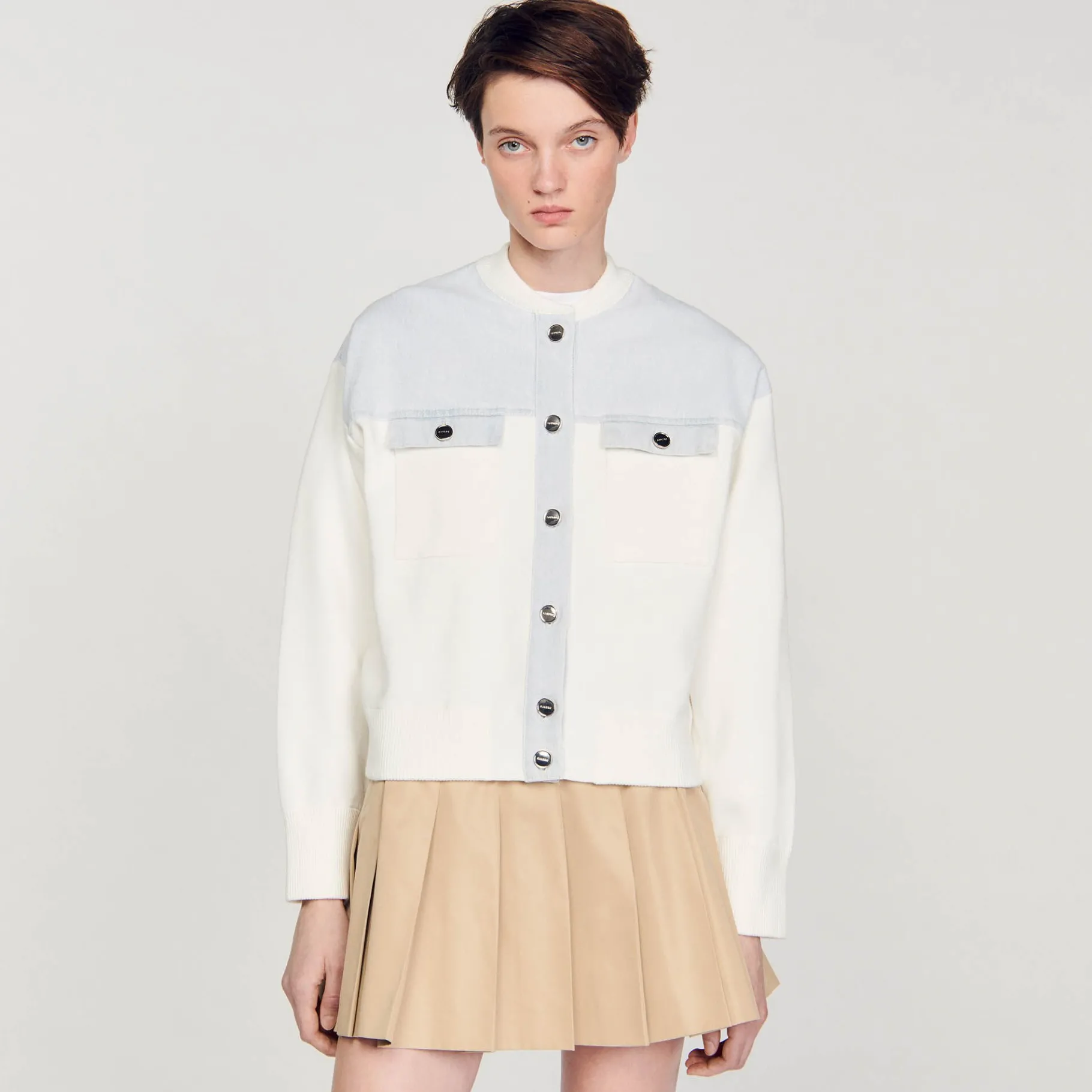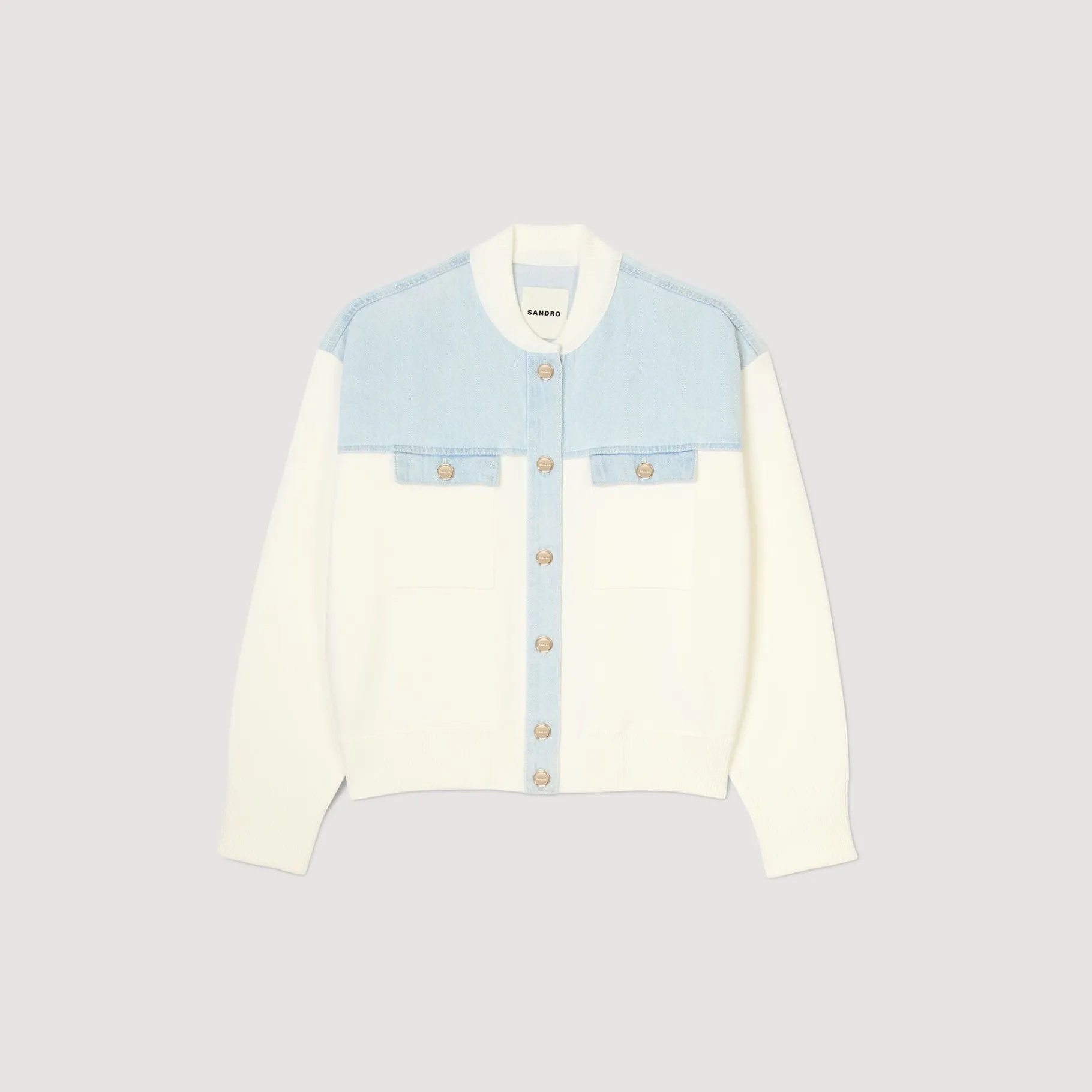 Cardicoat Bimaterial Estilo Chaqueta De Béisbol Con Cuello Redondo, Mangas Largas, Cierre De Botones, Bolsillos De Parche Con Solapa En El Pecho Y Decorado Con Insertos De Tejido Vaquero En Los Hombros Con Pespuntes En Contraste.