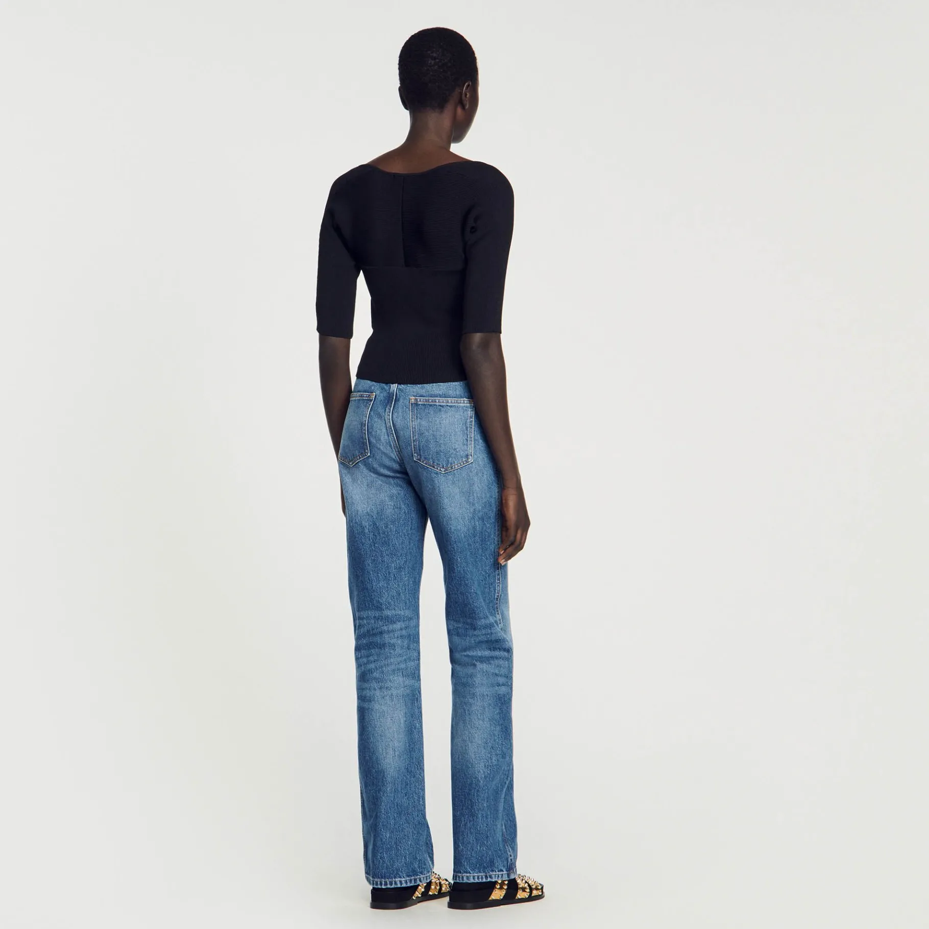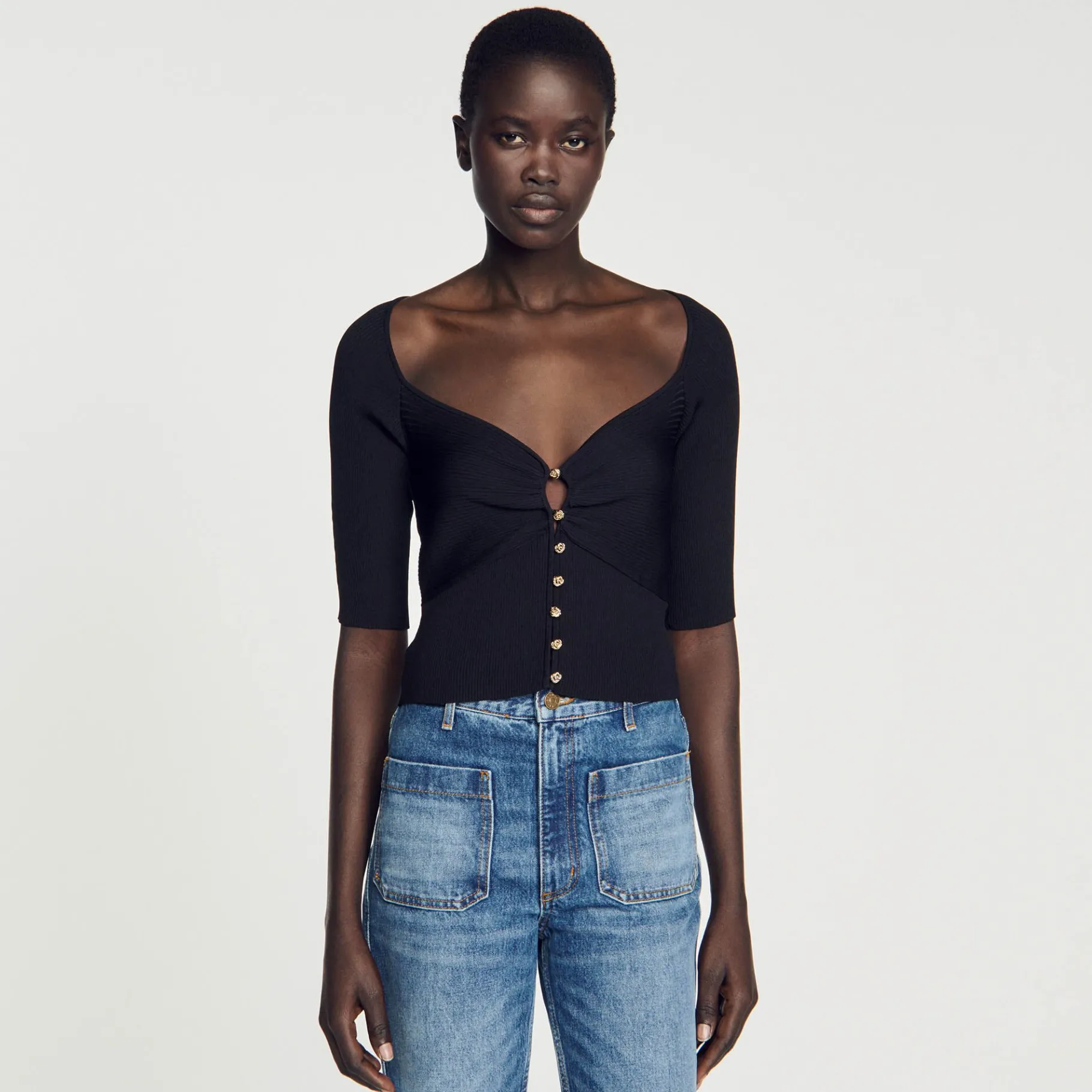 Cárdigan Corto De Punto De Canalé Con Manga Corta, Escote De Pico Amplio Y Fruncido Y Cierre De Botones De Fantasía.