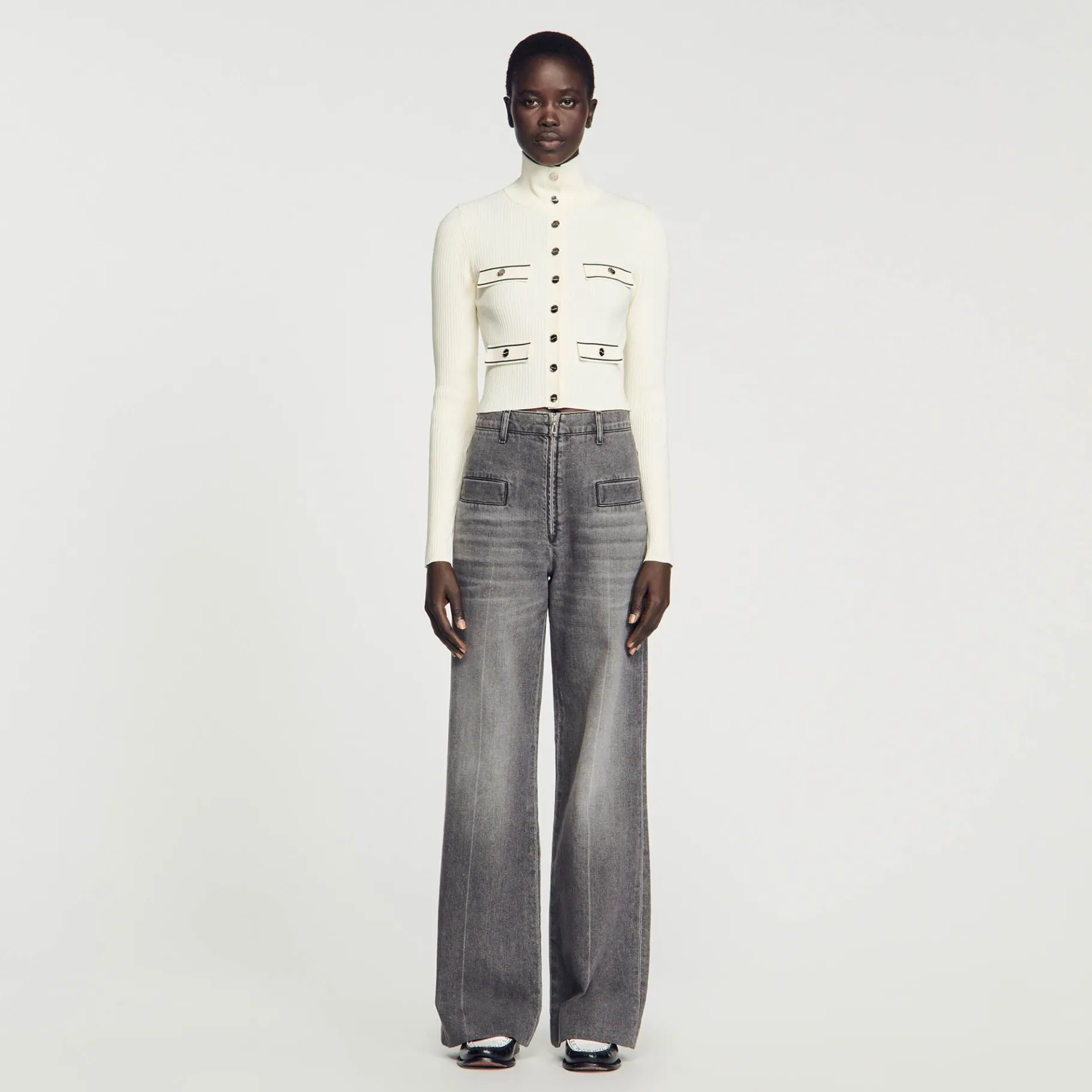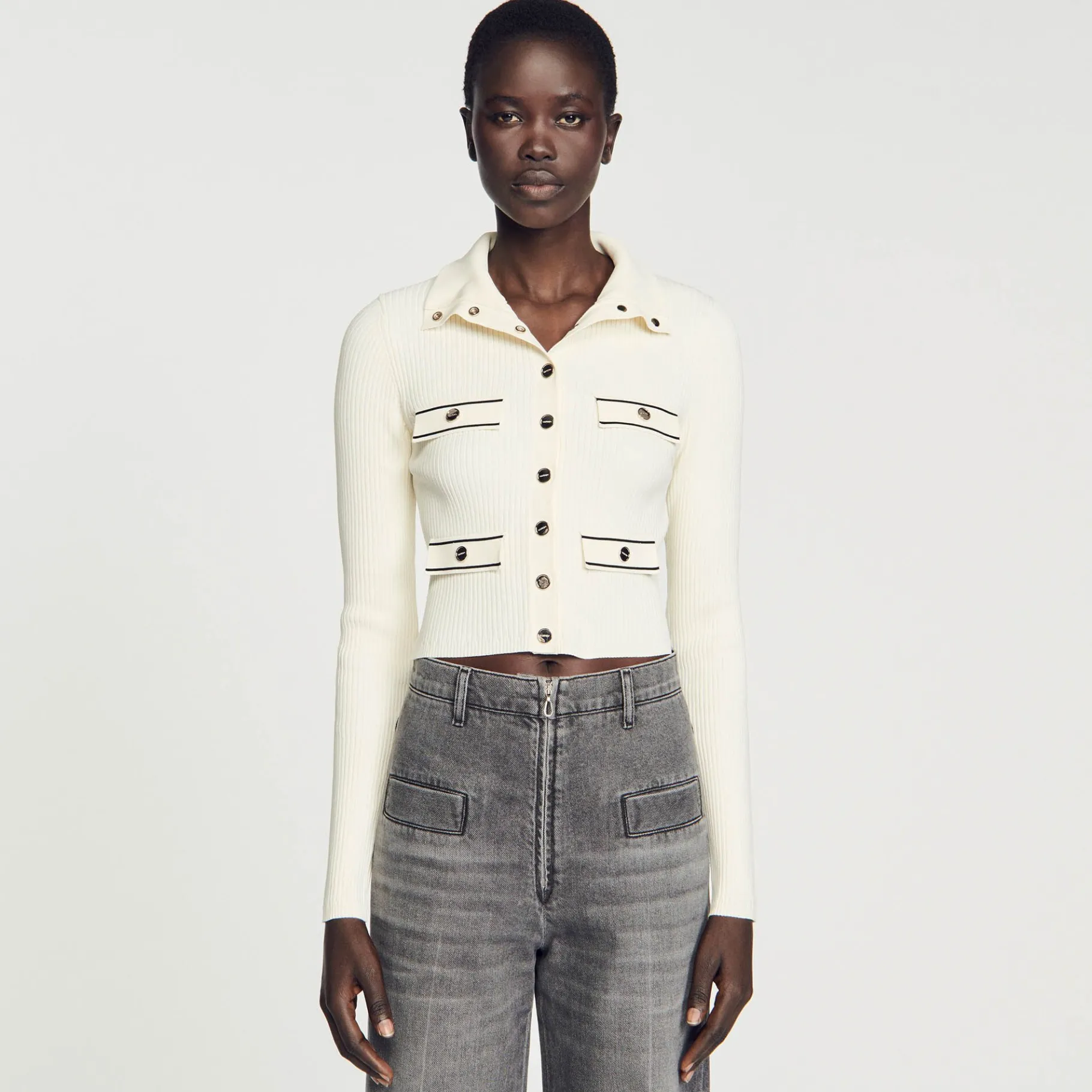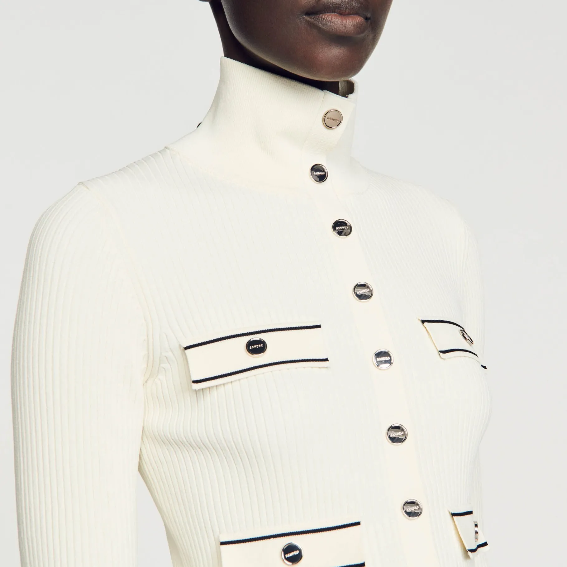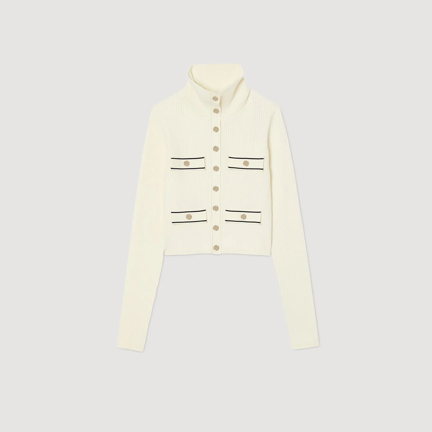 Cárdigan De Punto Acanalado Con Un Cuello Subido, Manga Larga, Un Cierre Con Botones De Presión Y Bolsillos Con Cordoncillo Que Contrasta.