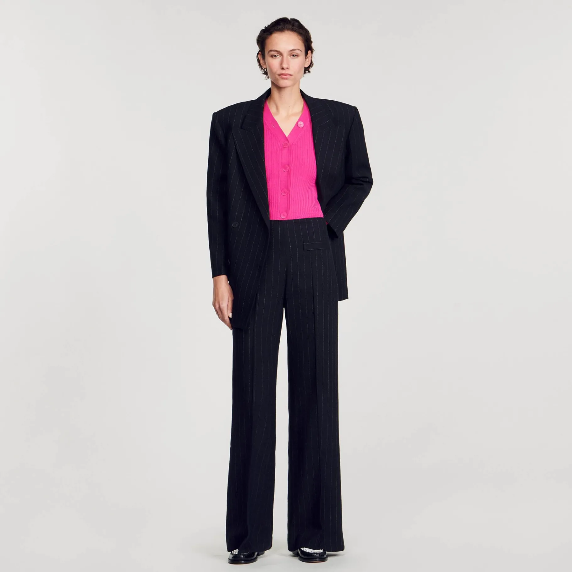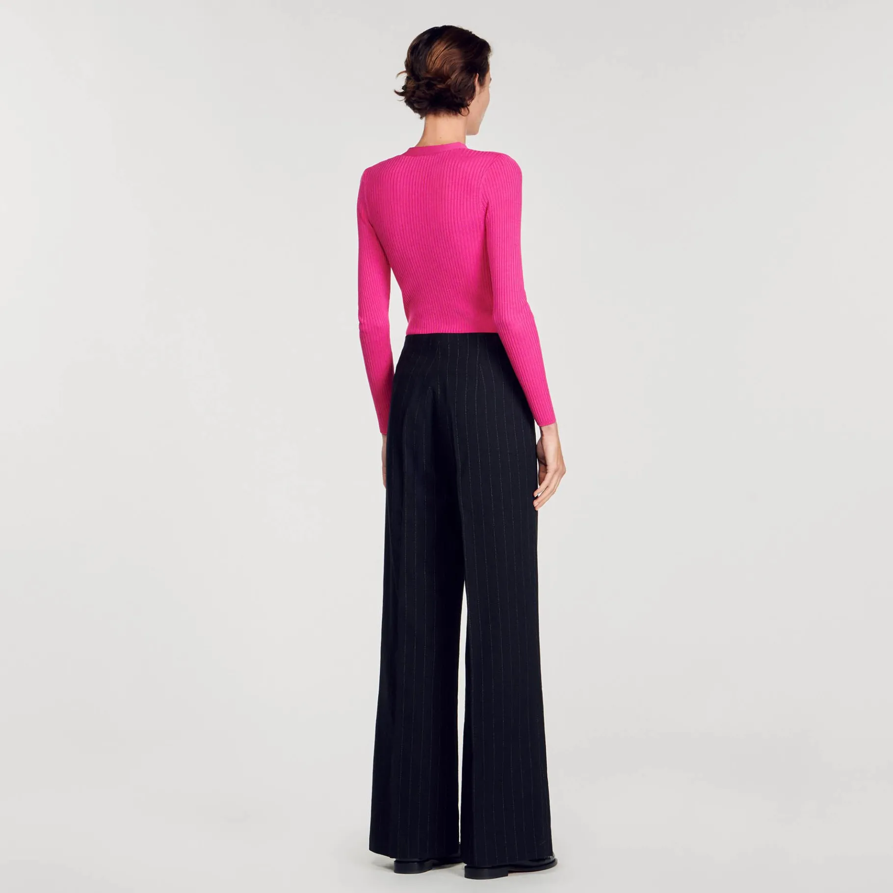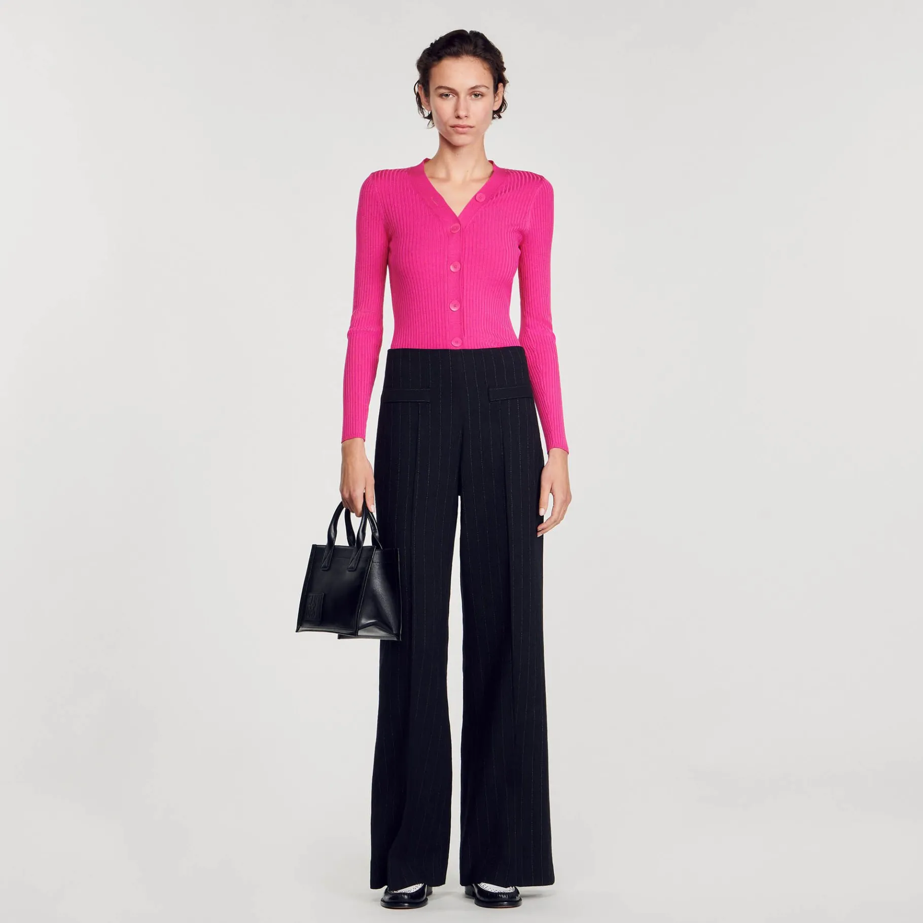 Cárdigan De Punto De Canalé Fino Con Escote En V, Cierre Con Botones Con Las Siglas De Sandro Y Manga Larga.