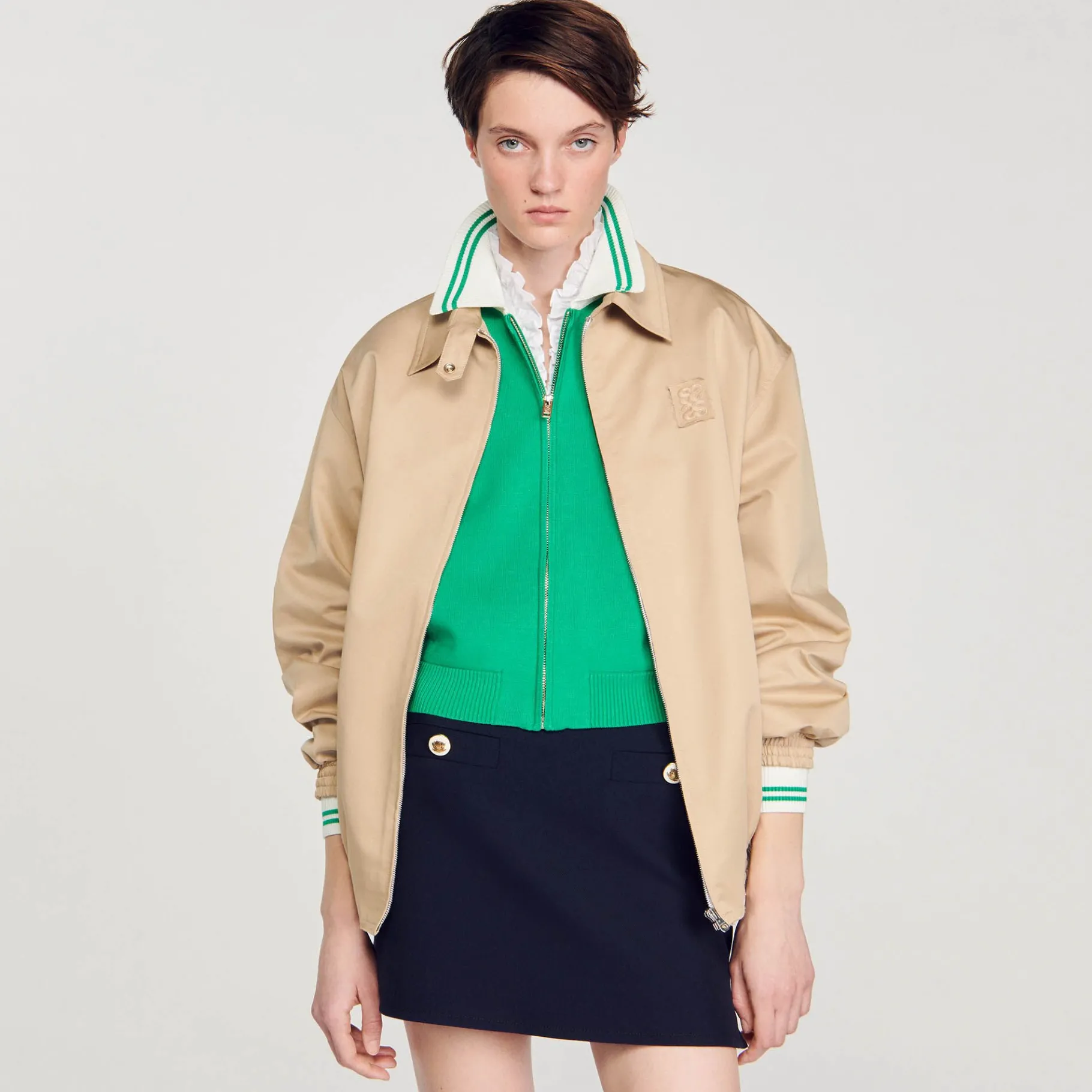 Cárdigan Estilo Chaqueta De Béisbol Con Cuello De Camisa, Mangas Largas, Acanalados A Rayas En Contraste Y Decorado Con Un Logotipo Bordado En El Pecho.