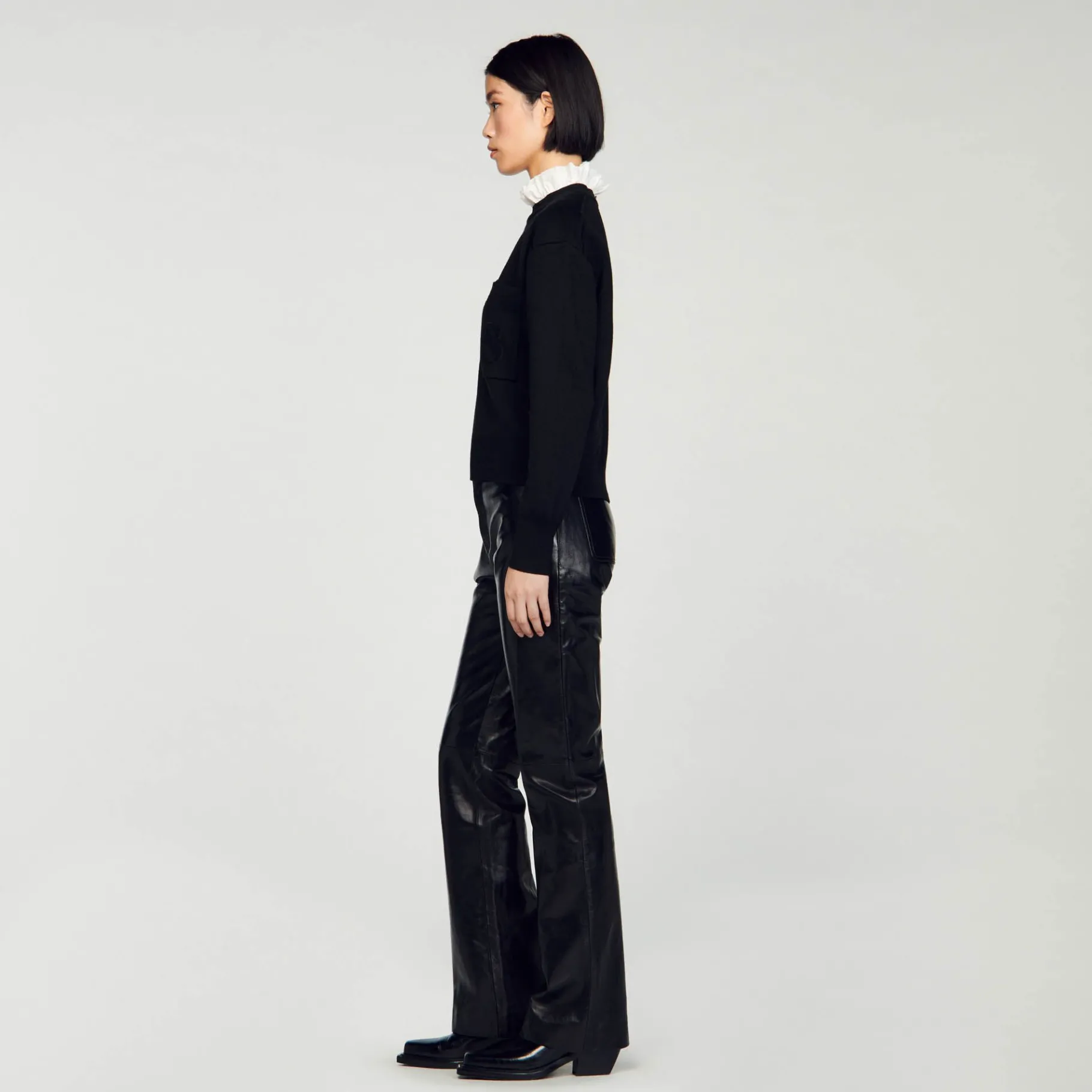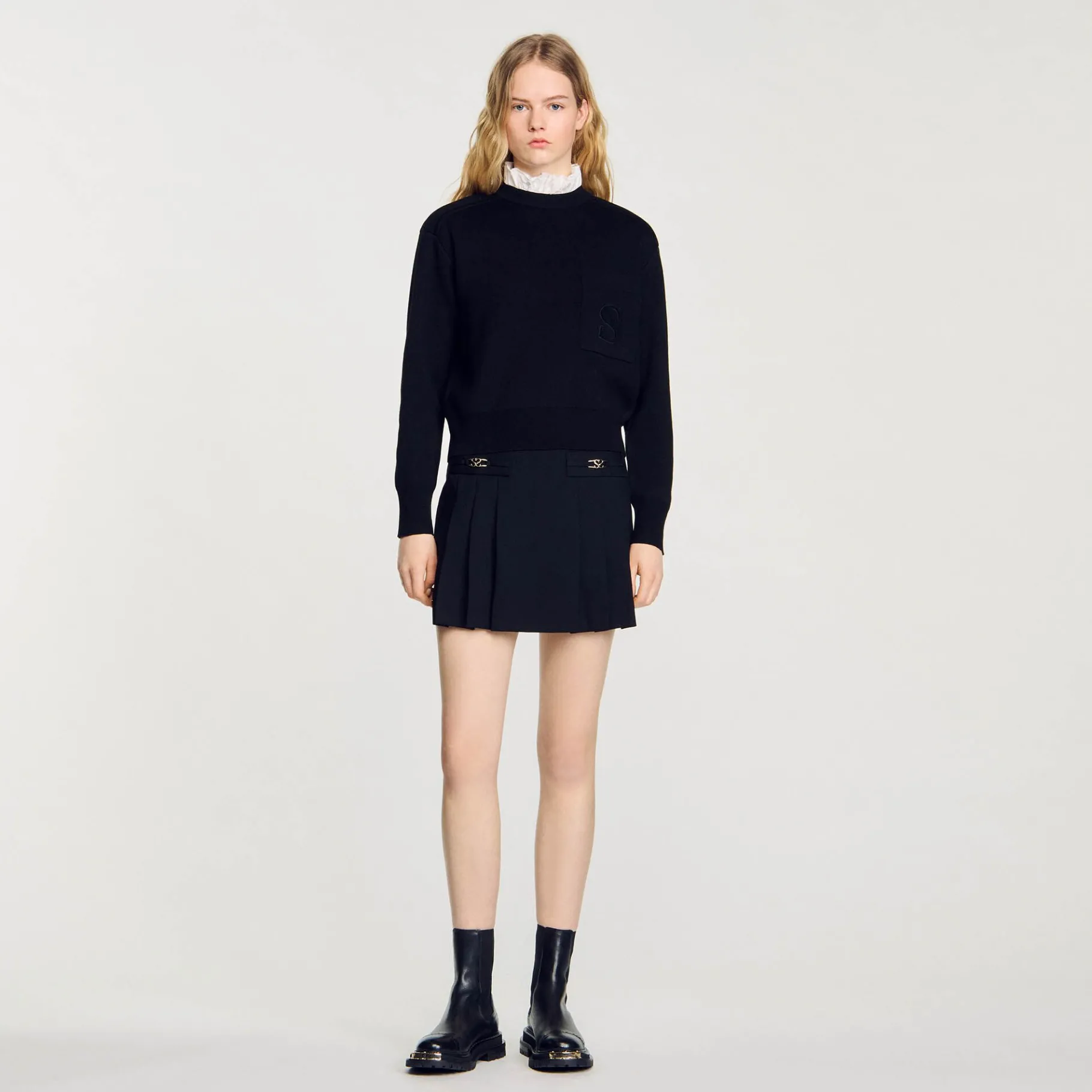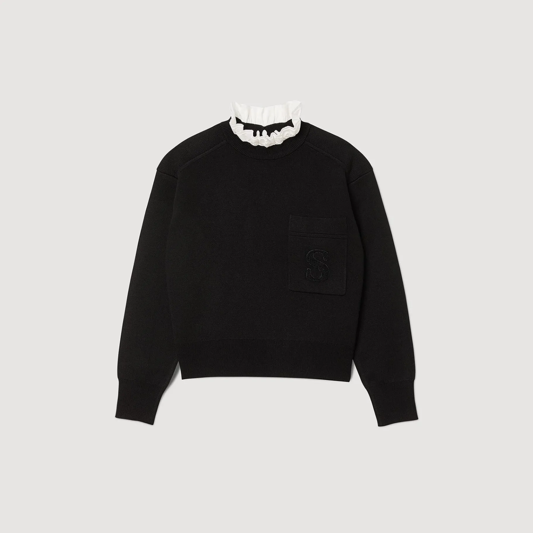 Jersey De Punto De Doble Cara Con Cuello Alto En Contraste Con Volantes, Mangas Largas Y Un Bolsillo De Parche En El Pecho Decorado Con Un Bordado De Doble S De Terciopelo.