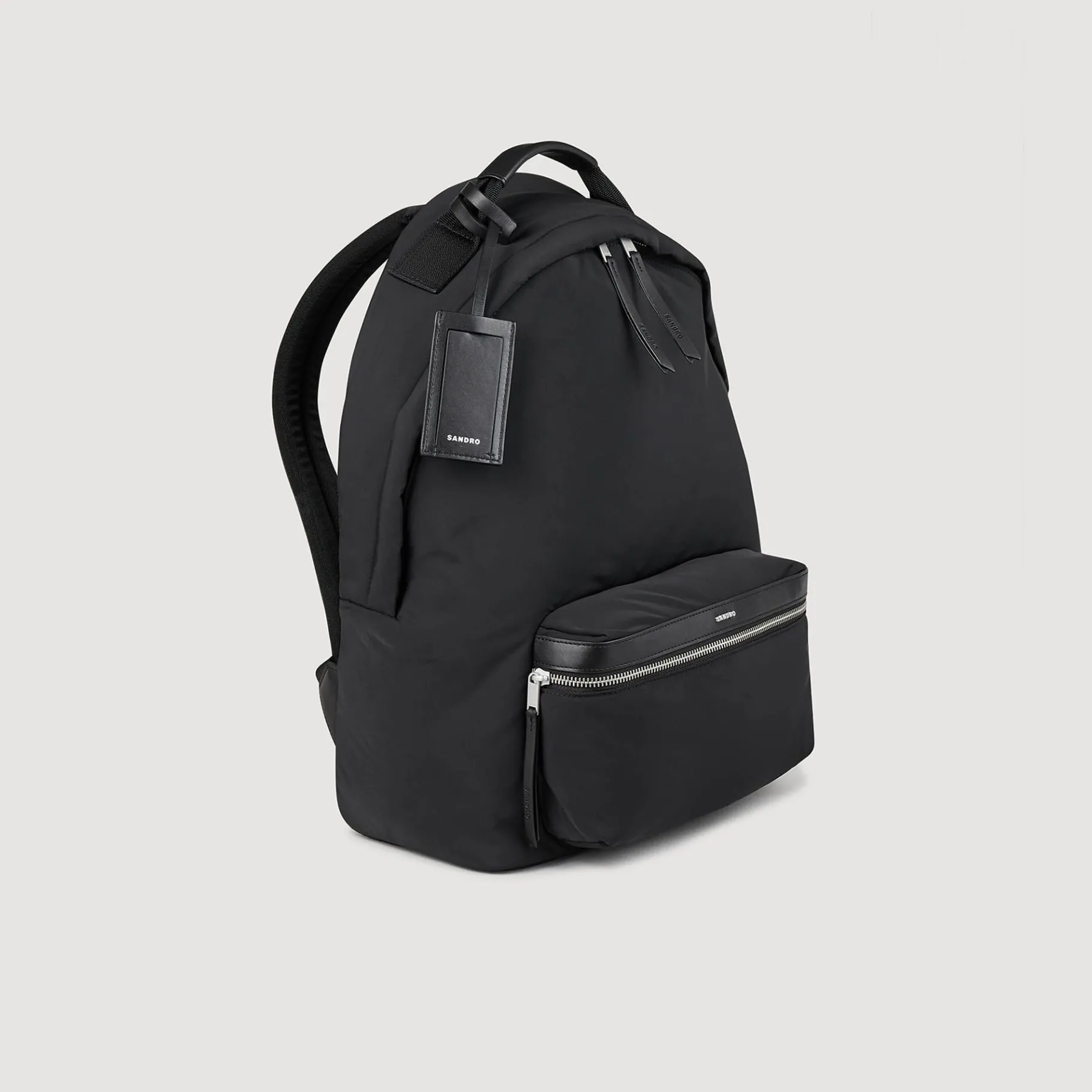 Mochila De Tela Con Detalles De Cuero, Cierre De Cremallera Con Tirador Con Relieve Sandro, Bolsillo Delantero Con Cremallera, Portaetiquetas, Bolsillo Organizador Interior Y Asas Largas Acolchadas Y Ajustables.