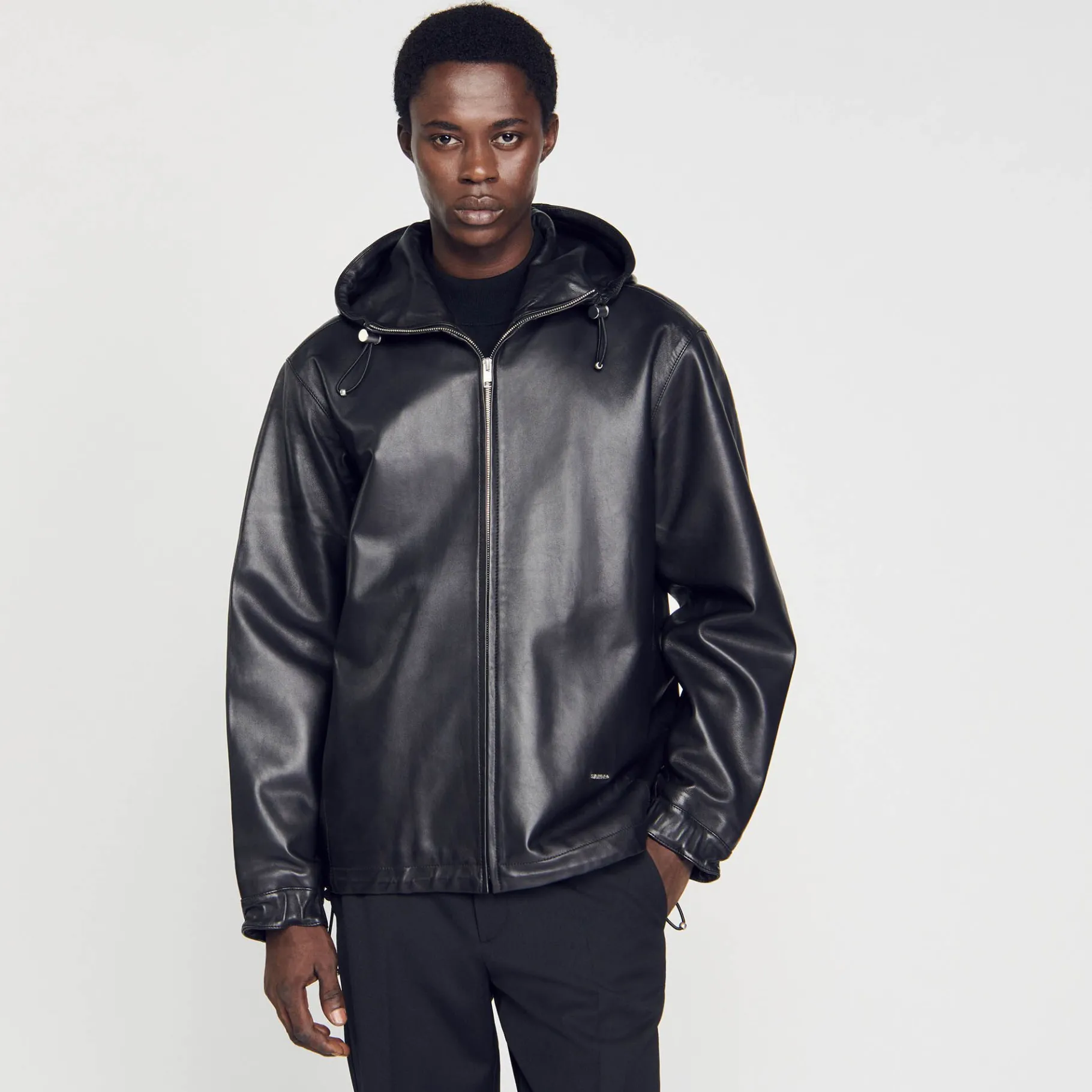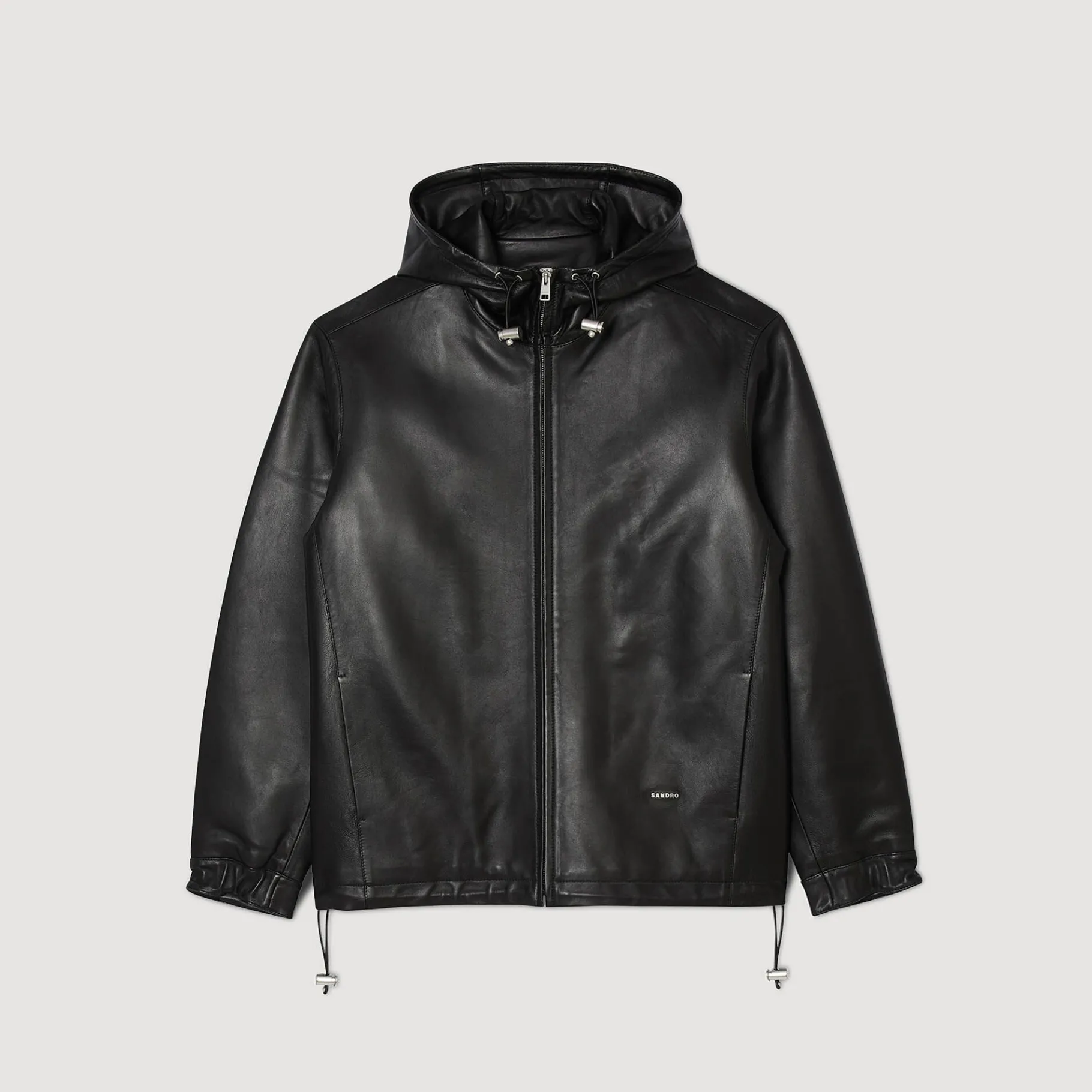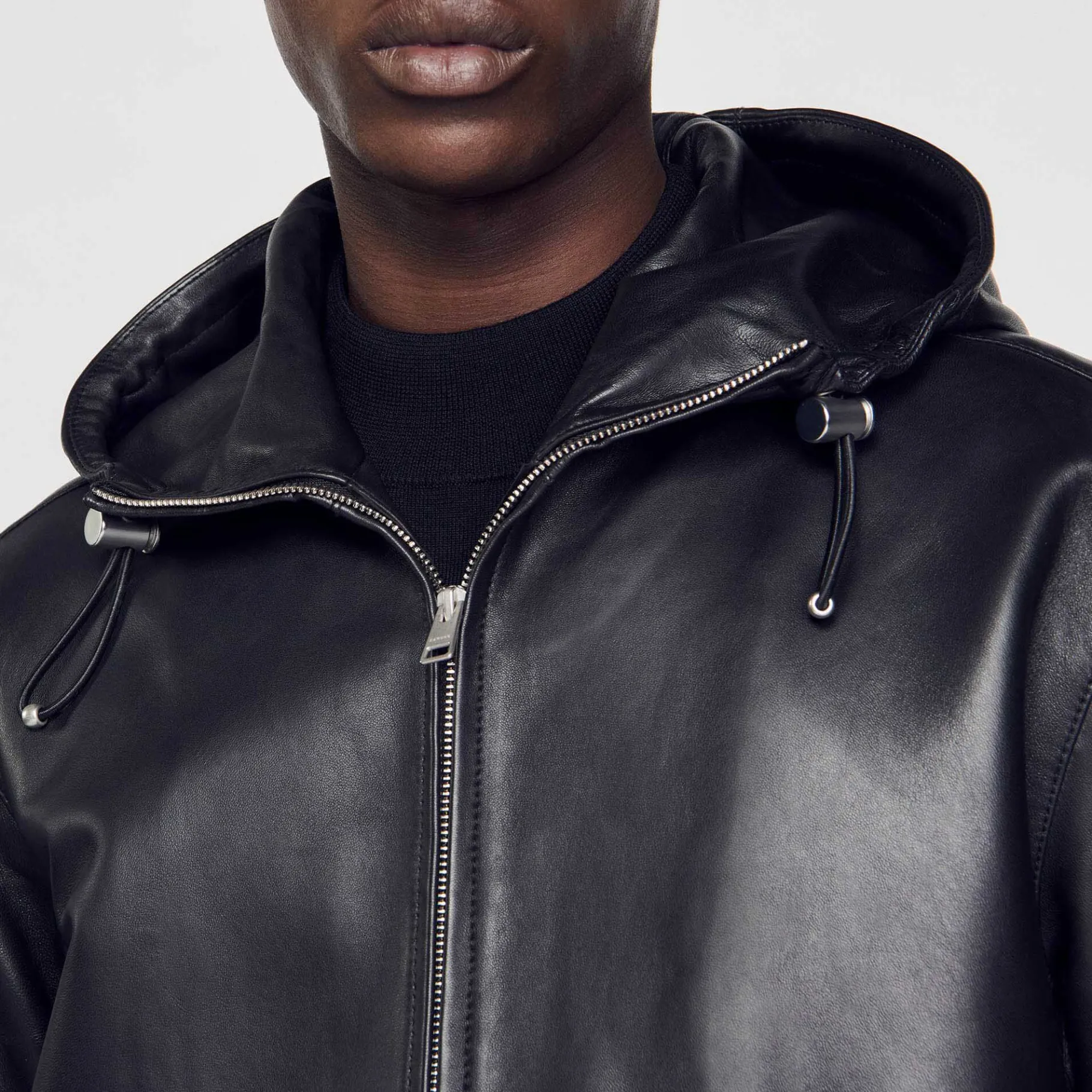 Cazadora De Cuero De Cordero Flexible, Con Una Capucha, Un Cierre De Cremallera, Manga Larga Y Cordones De Cierre.