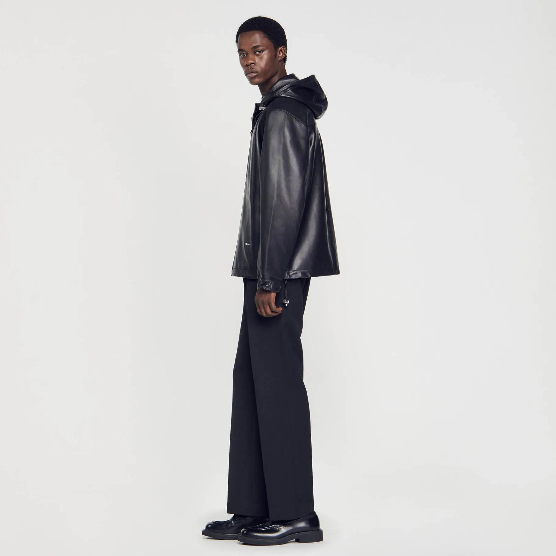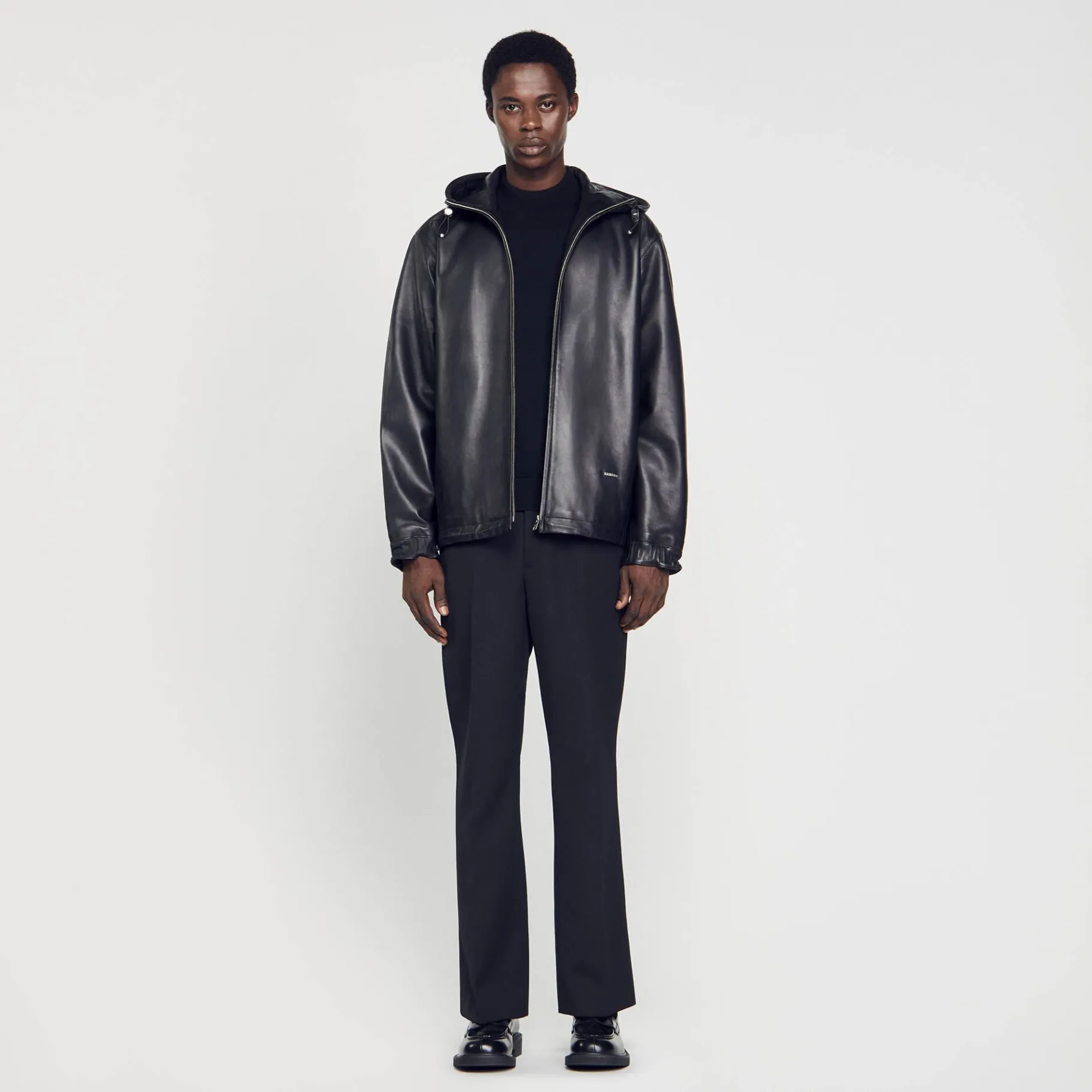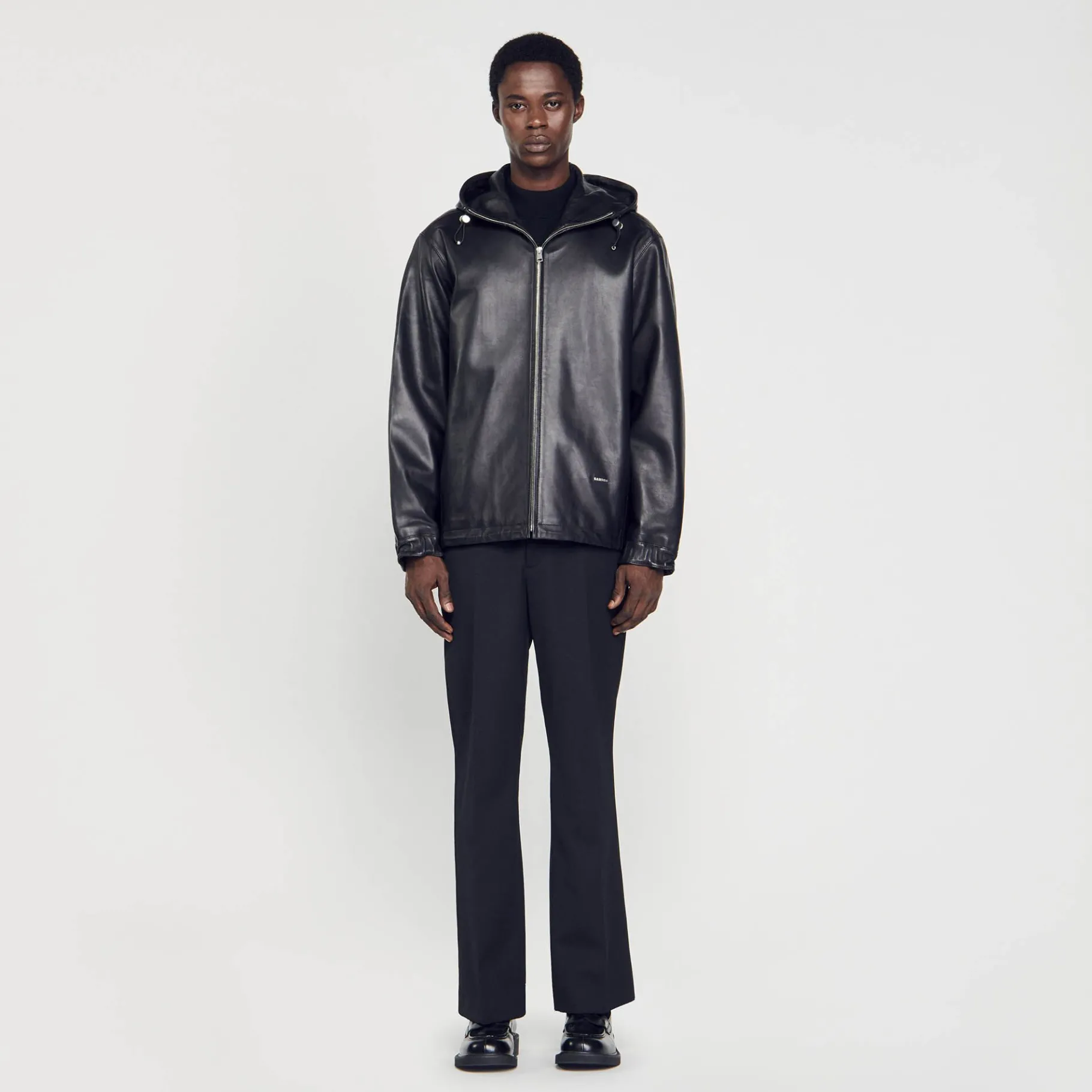 Cazadora De Cuero De Cordero Flexible, Con Una Capucha, Un Cierre De Cremallera, Manga Larga Y Cordones De Cierre.