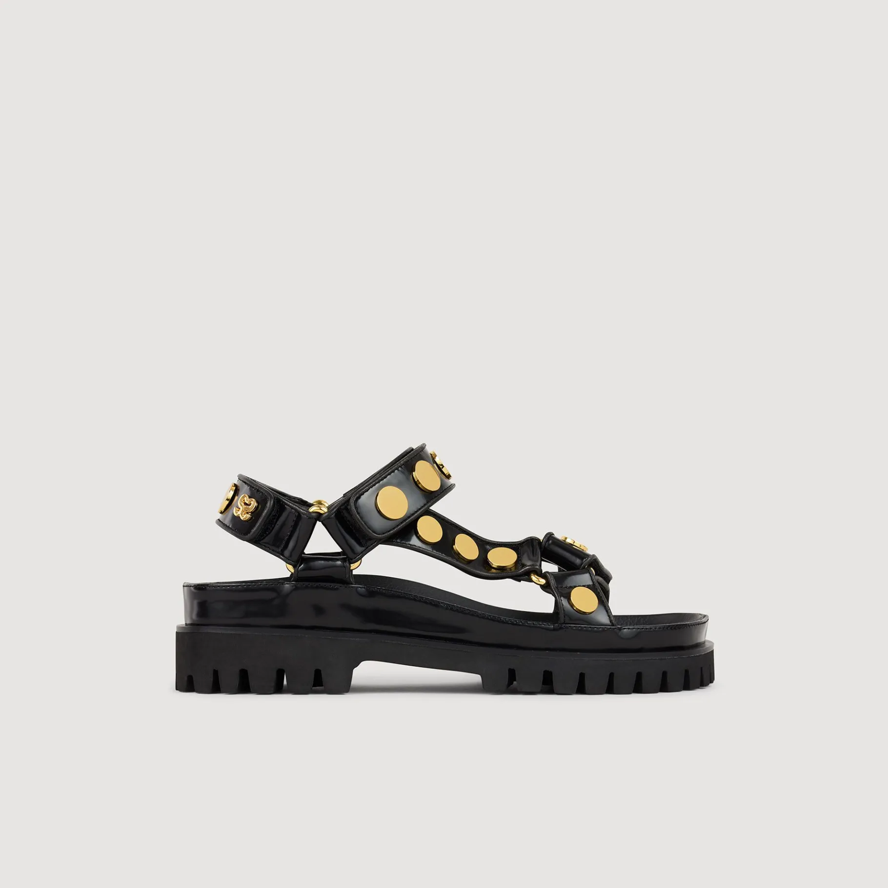 Sandalias De Cuero Con Suela Dentada Y Tiras Con Velcro Decoradas Con Tachuelas Planas Doradas.