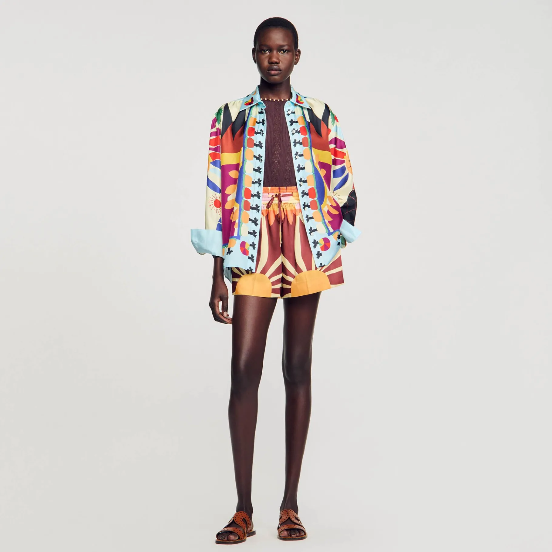 Sandro Renueva Su Colaboración Con El Artista Francés Louis Barthélemy Para Crear Una Colección Cautivadora E Inspirada En Los Viajes Que Rinde Homenaje A La Artesanía Africana. Camisa De Seda Con Cuello Clásico, Manga Larga Con Puño Abotonado, Tapeta De BotoNes Y Estampado De Árbol De La Vida.