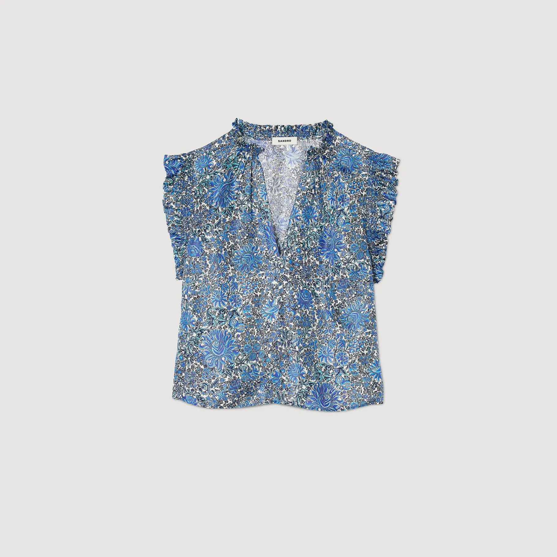 Top Fluido Con Estampado Floral, Escote De Pico Con Tiras Y Manga Fruncida. Top Con Estampado Floral Sandro Mujer Cuello…