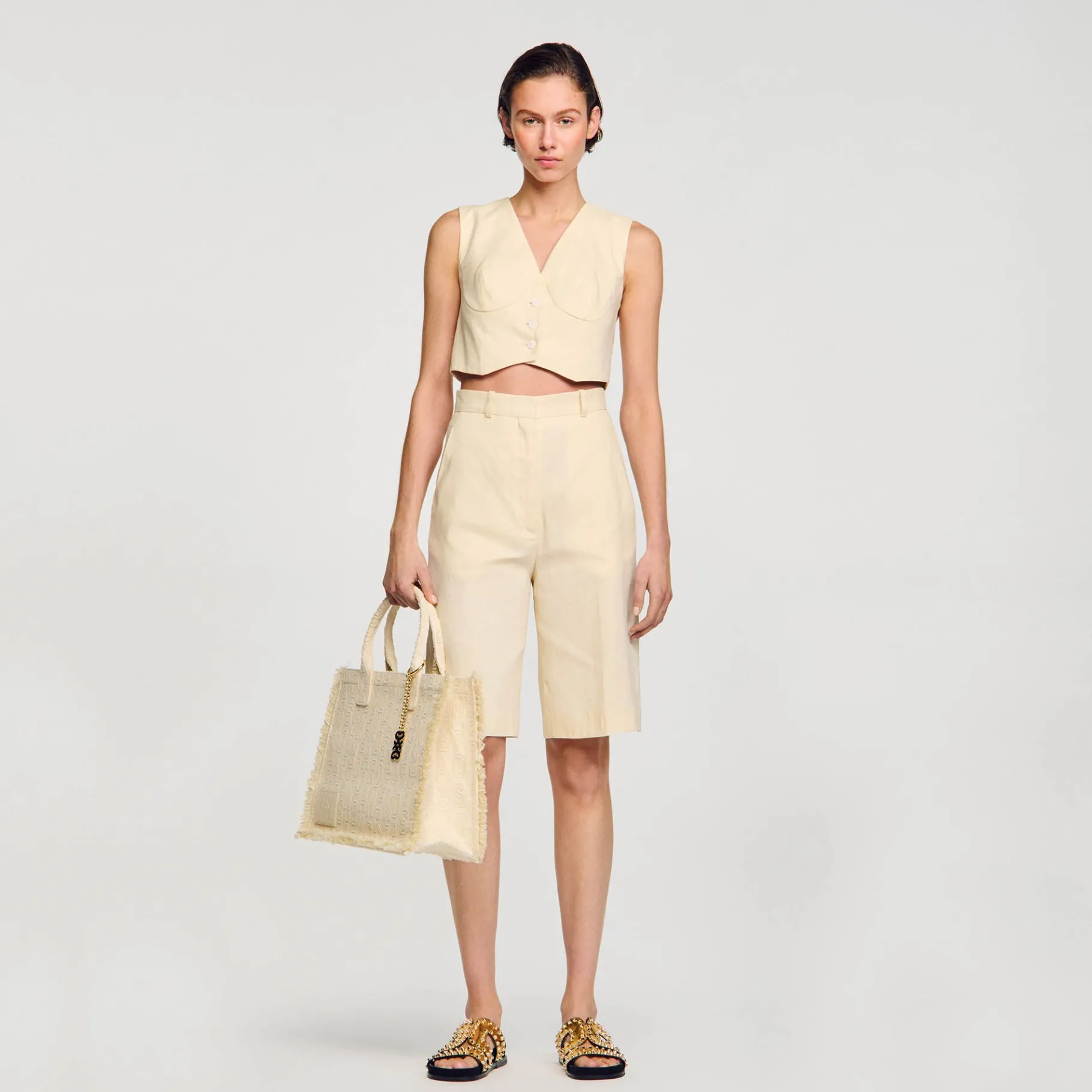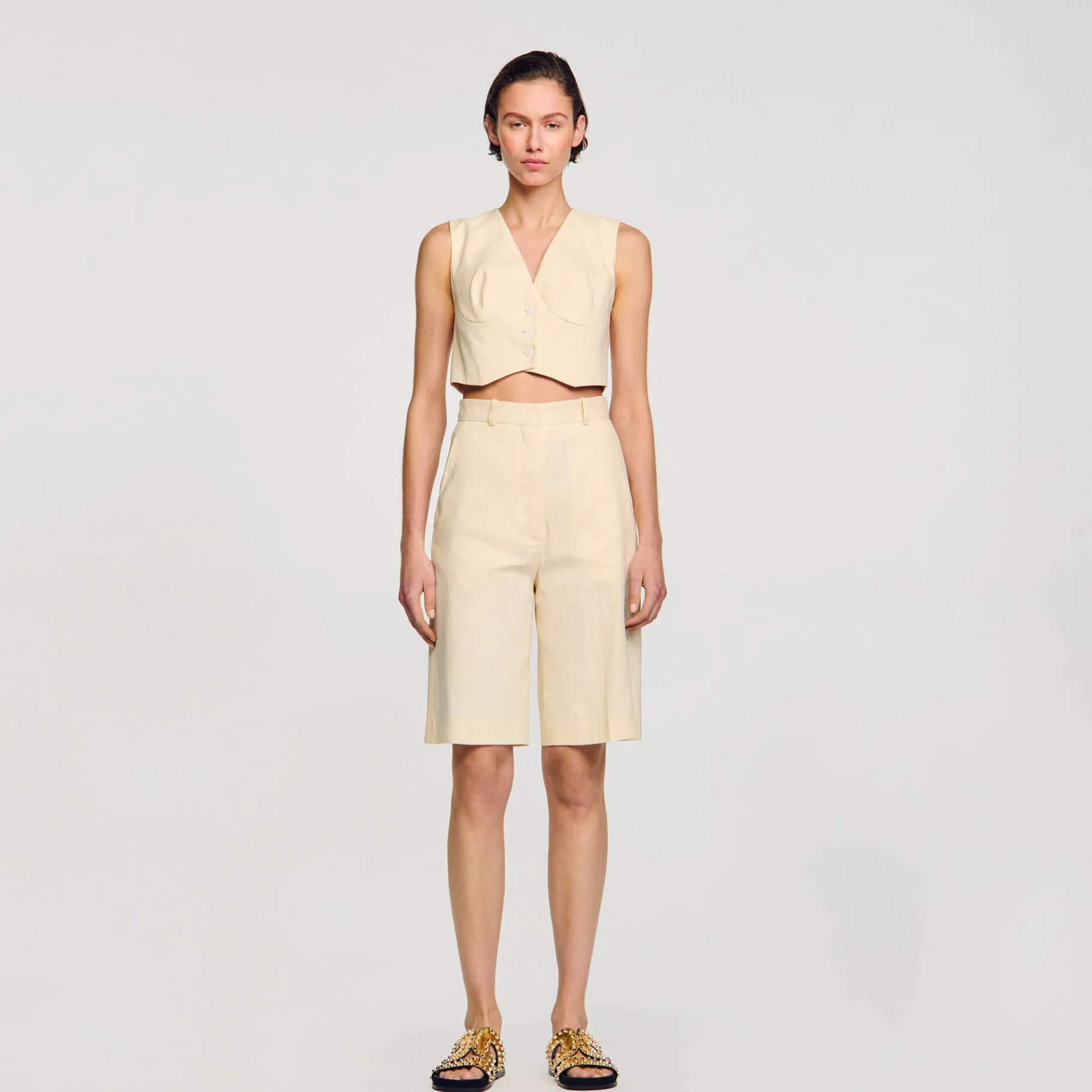Top Corto Estilo Chaqueta De Traje De Mezcla De Lino Con Escote En V, Recortes Tipo Corsé Y Un Cierre De Botones.