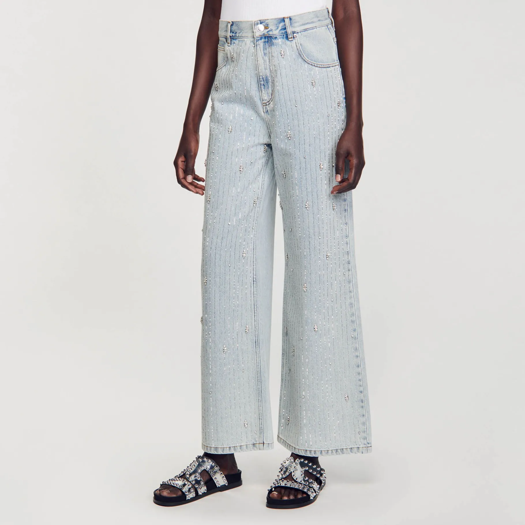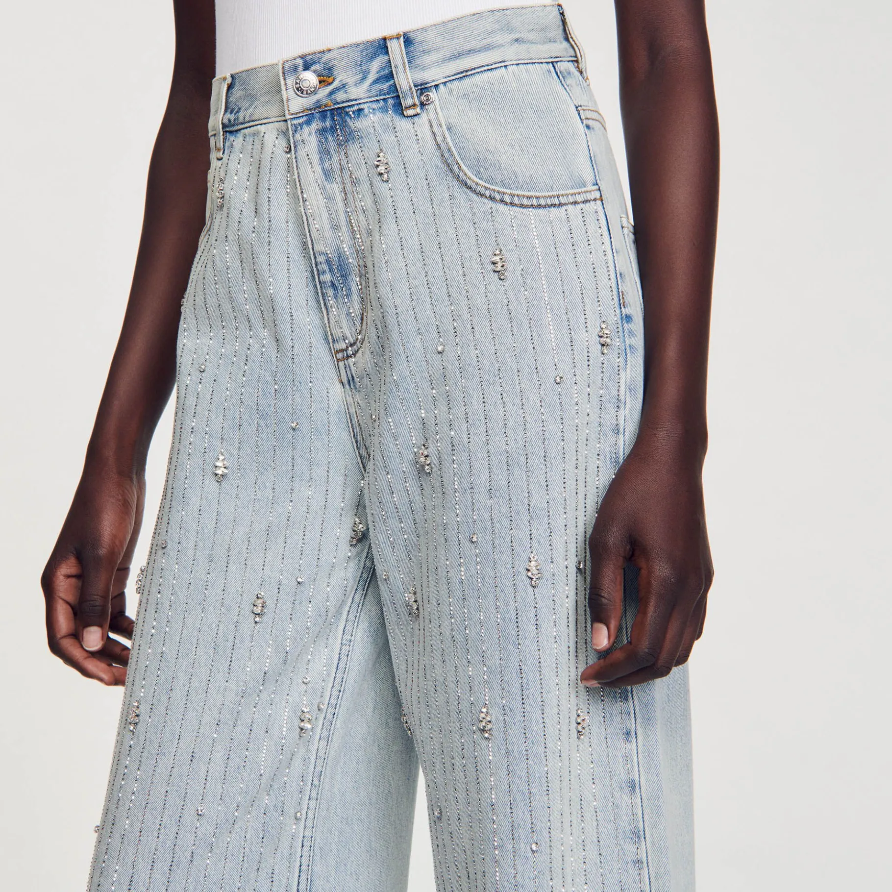 Vaquero Ancho De Tejido Vaquero Desteñido Con Bolsillos Y Trabillas En La Cintura, Decorado Con Rayas De Brillantes.