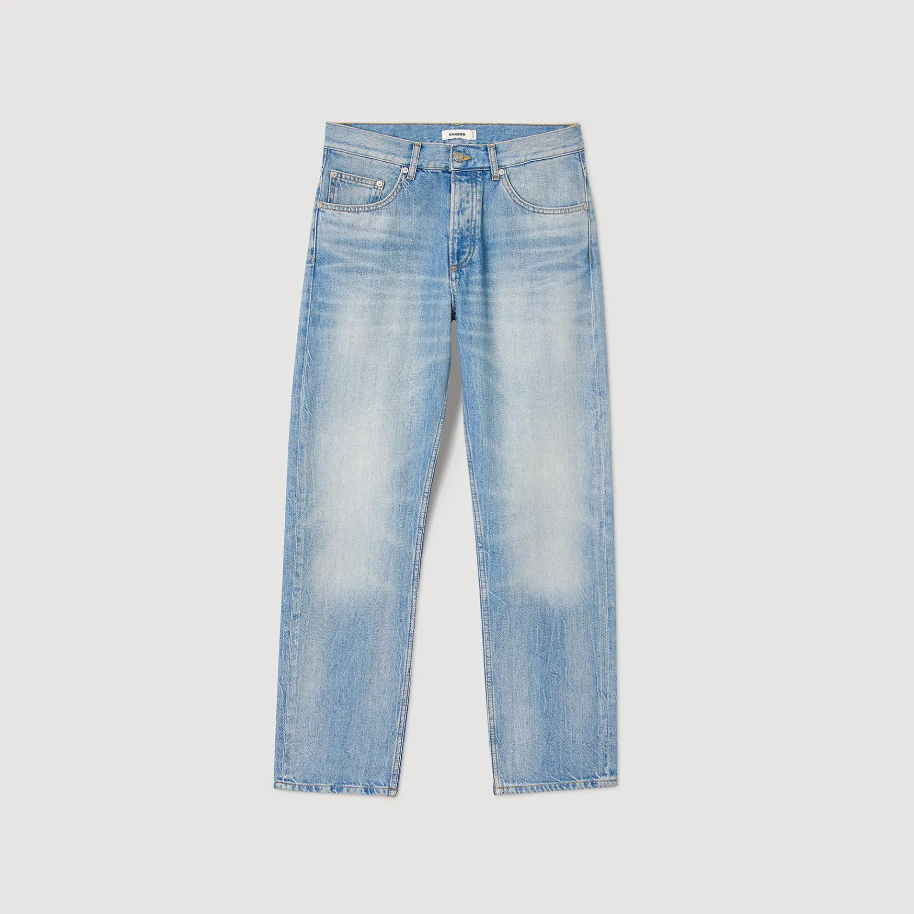Vaquero De Tejido Denim Desteñido Con Cinco Bolsillos, Trabillas Para Cinturón Y Parche En La Parte Trasera.