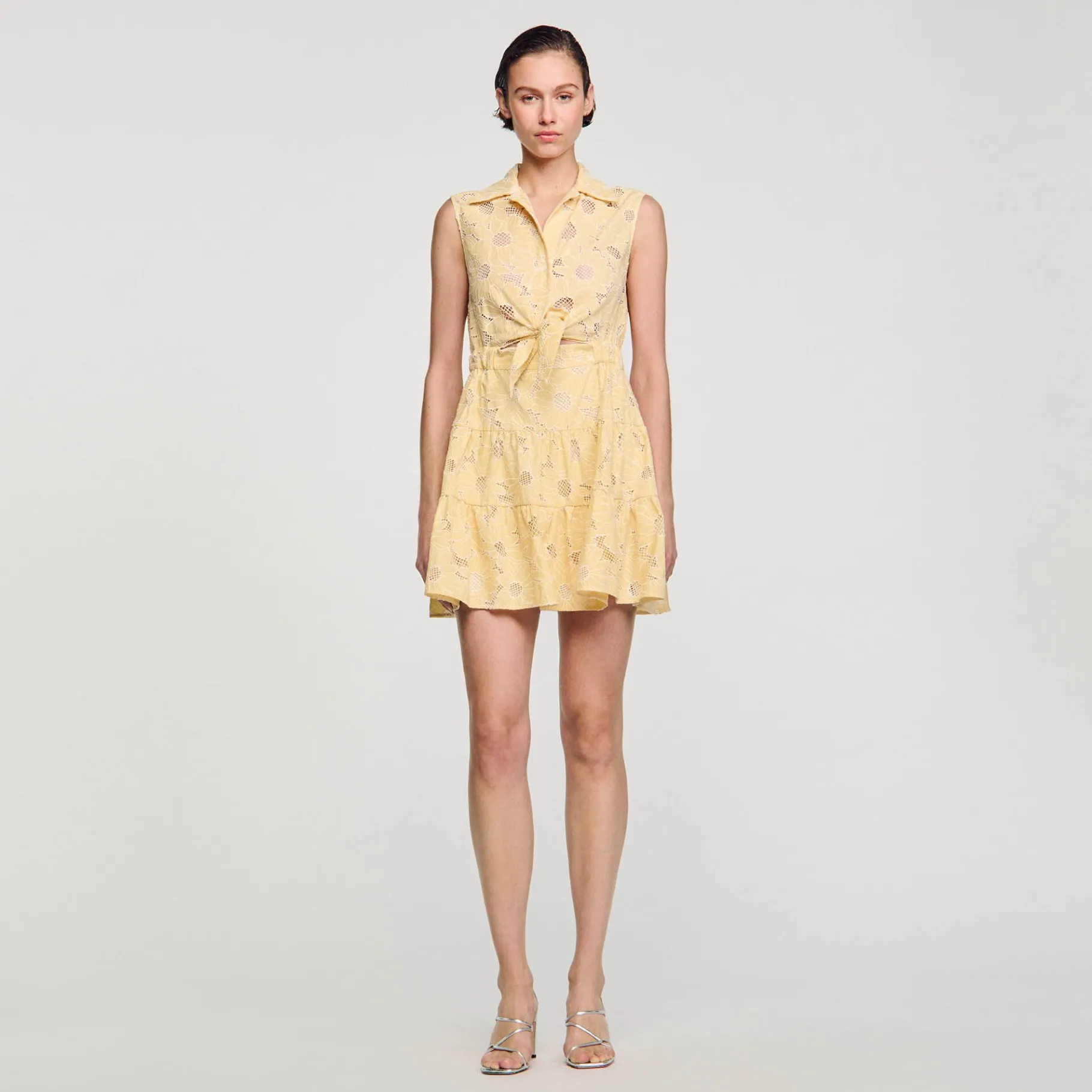 Vestido Corto Sin Mangas Decorado Con Bordados De Flores Calados, Cuello De Camisa Abotonado, Faldones Para Anudar En La Parte Delantera, Una Cintura Fruncida Y Falda Acampanada.