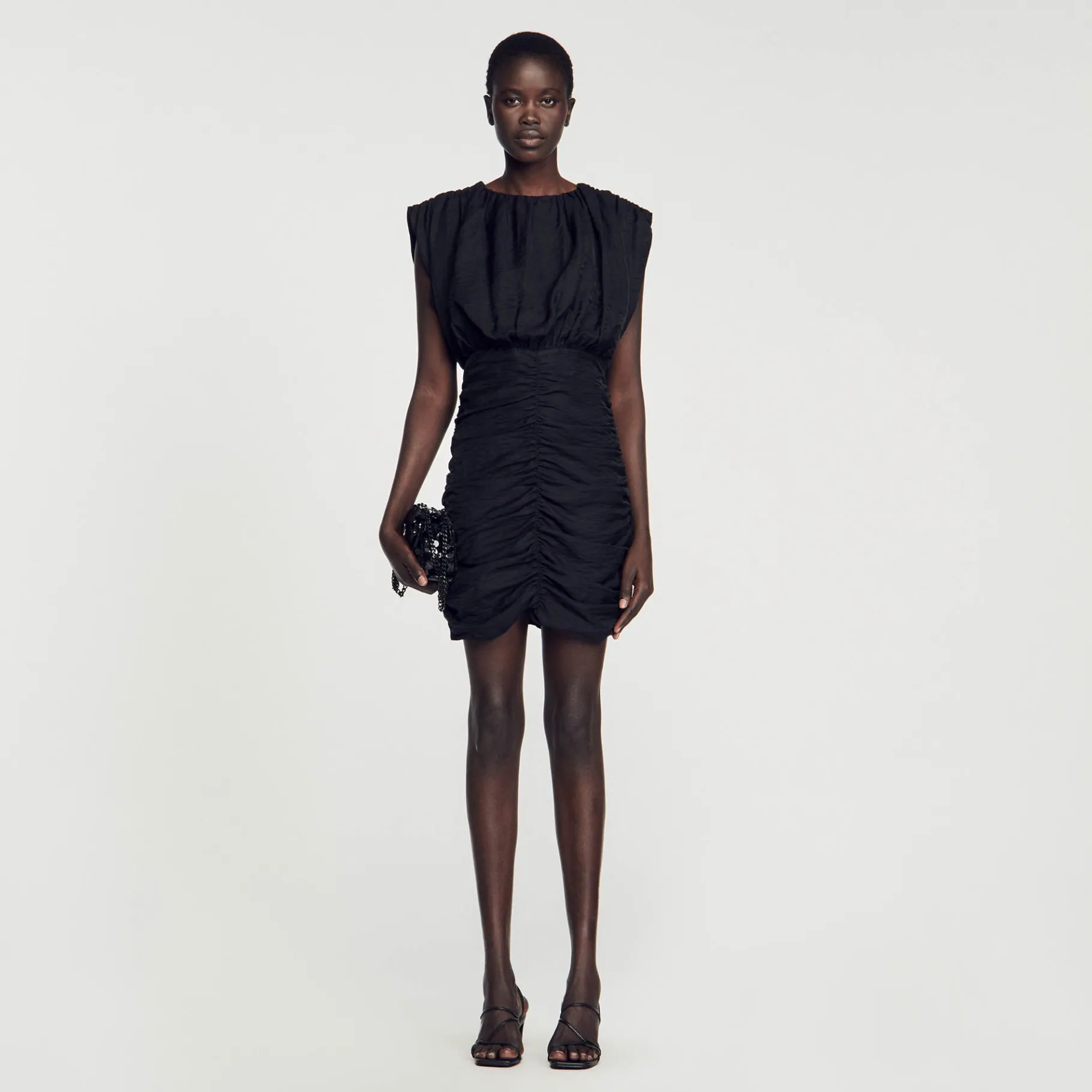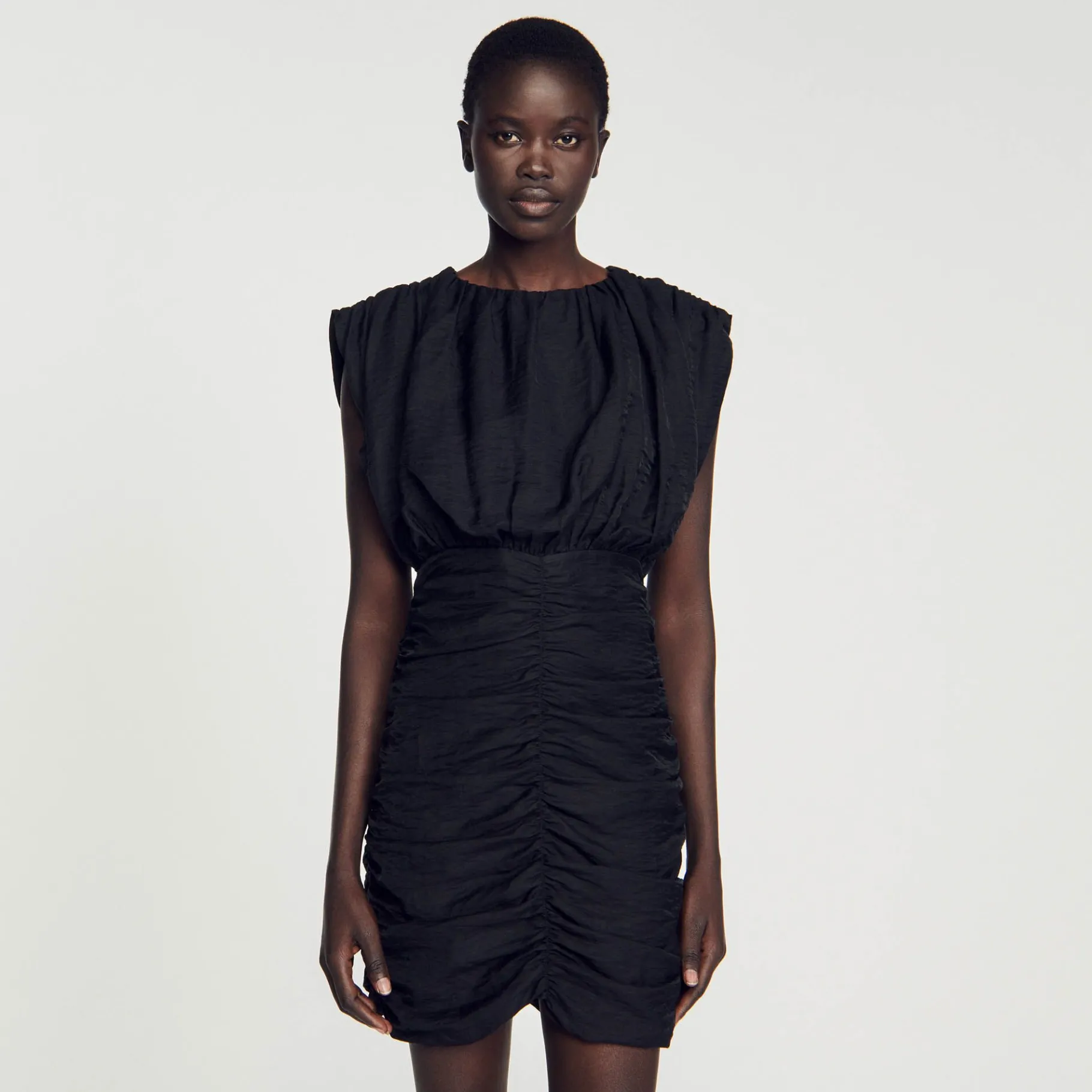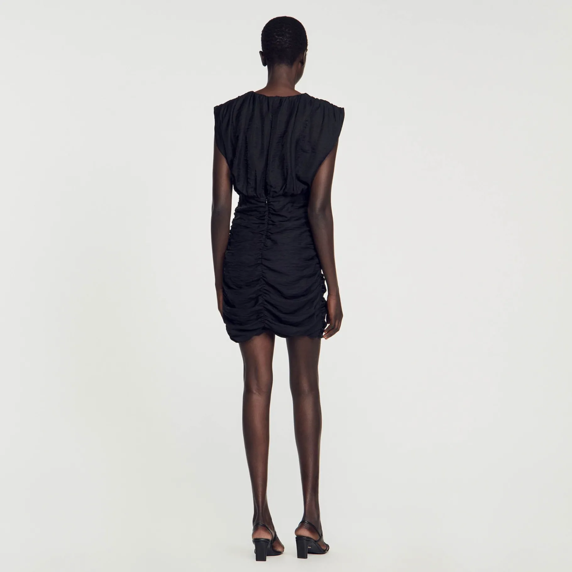 Vestido Ajustado Completamente Drapeado De Sisas Anchas Y Cuello En V, Con Cierre De Cremallera En La Parte Trasera.