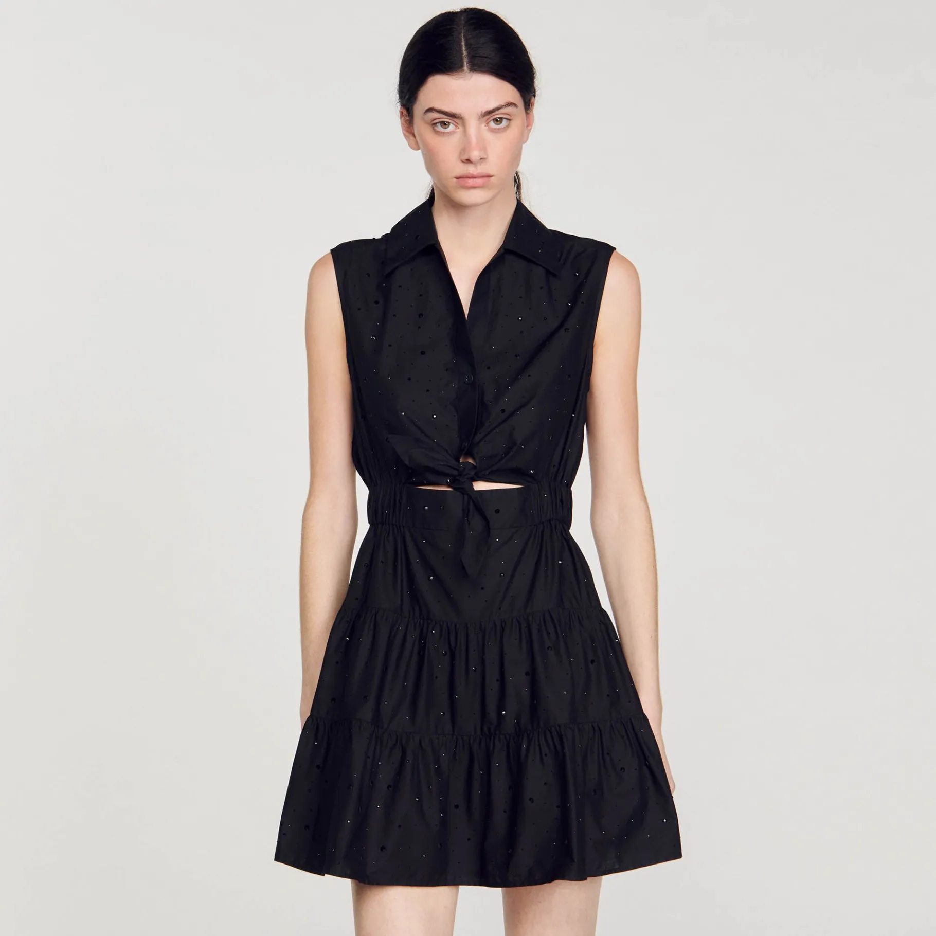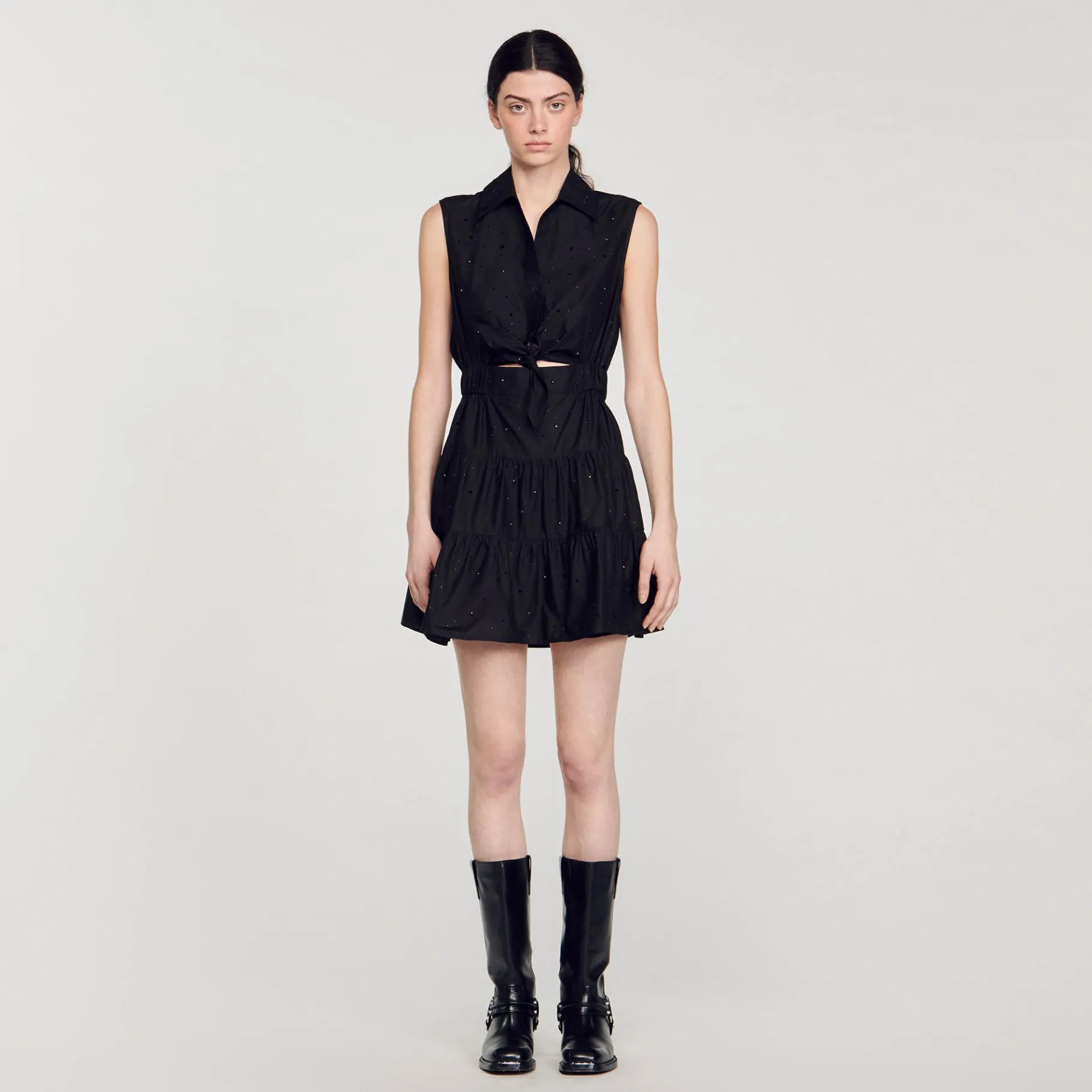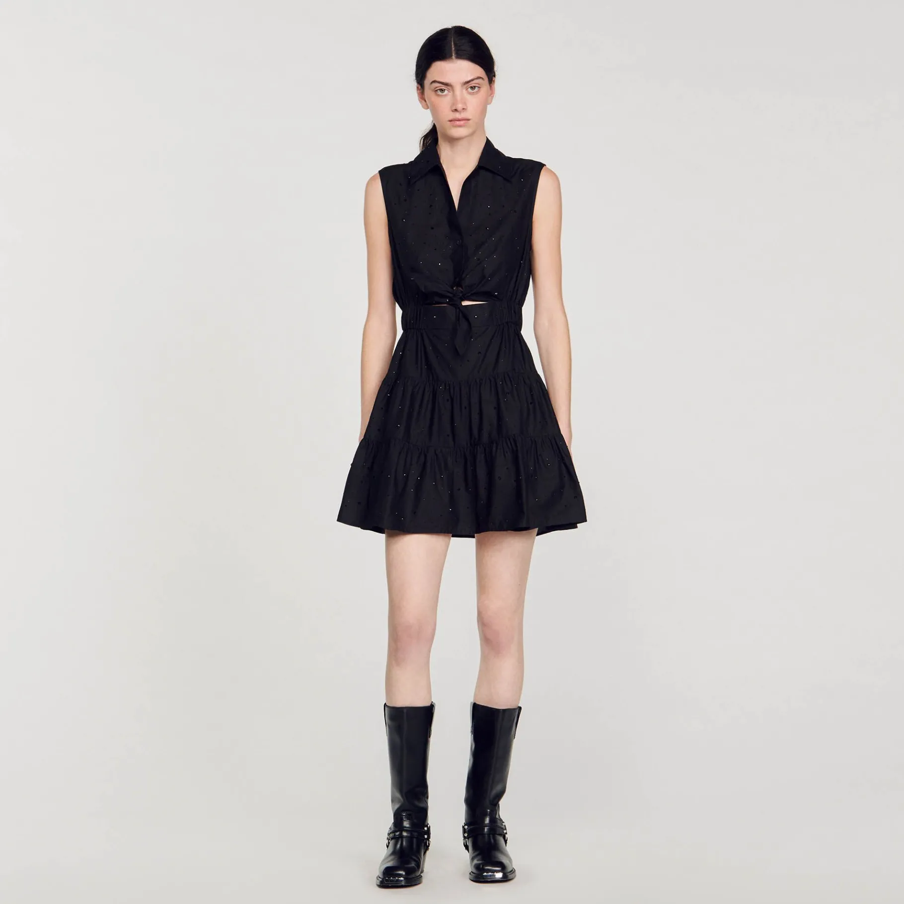 Vestido Corto Sin Mangas Decorado Con Brillantes Tono Sobre Tono En Toda La Prenda, Cuello De Camisa Abotonado, Faldones Para Anudar En La Parte Delantera, Una Cintura Fruncida Y Falda Acampanada.