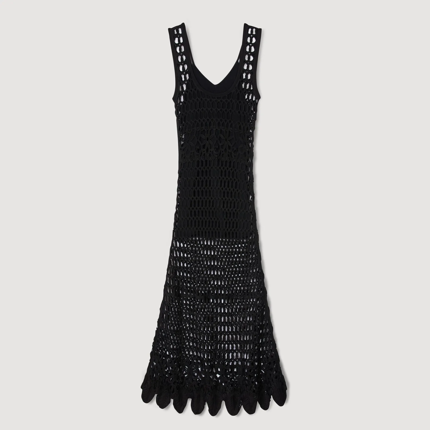 Vestido Largo De Punto Estilo Croché Sin Mangas Con Escote Redondeado Y Bajo Festoneado.