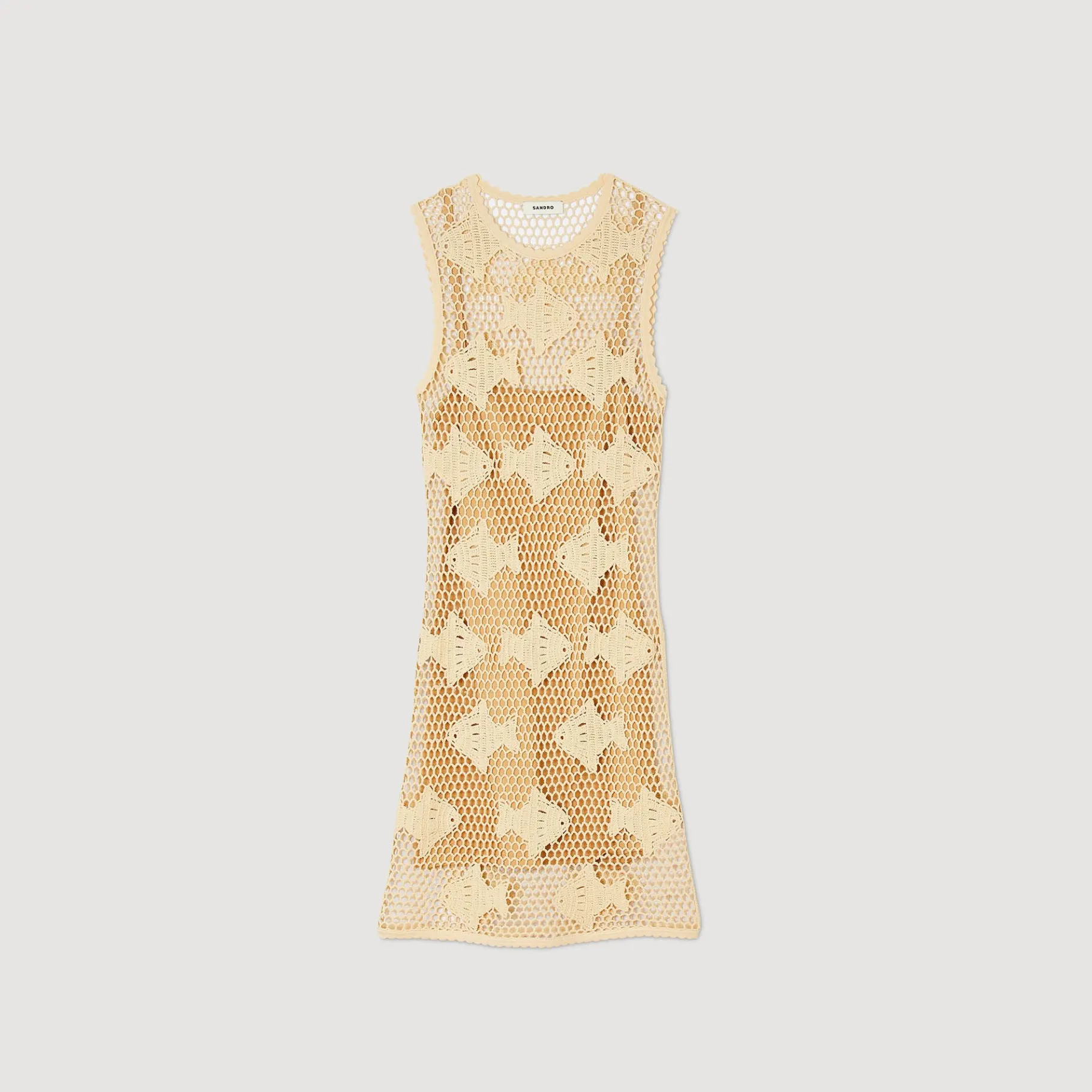 Vestido Corto Sin Mangas De Punto Bordado Con Efecto De Ganchillo Con Motivo De Peces, Cuello Redondo Y Un Forro Con Tirantes Finos.