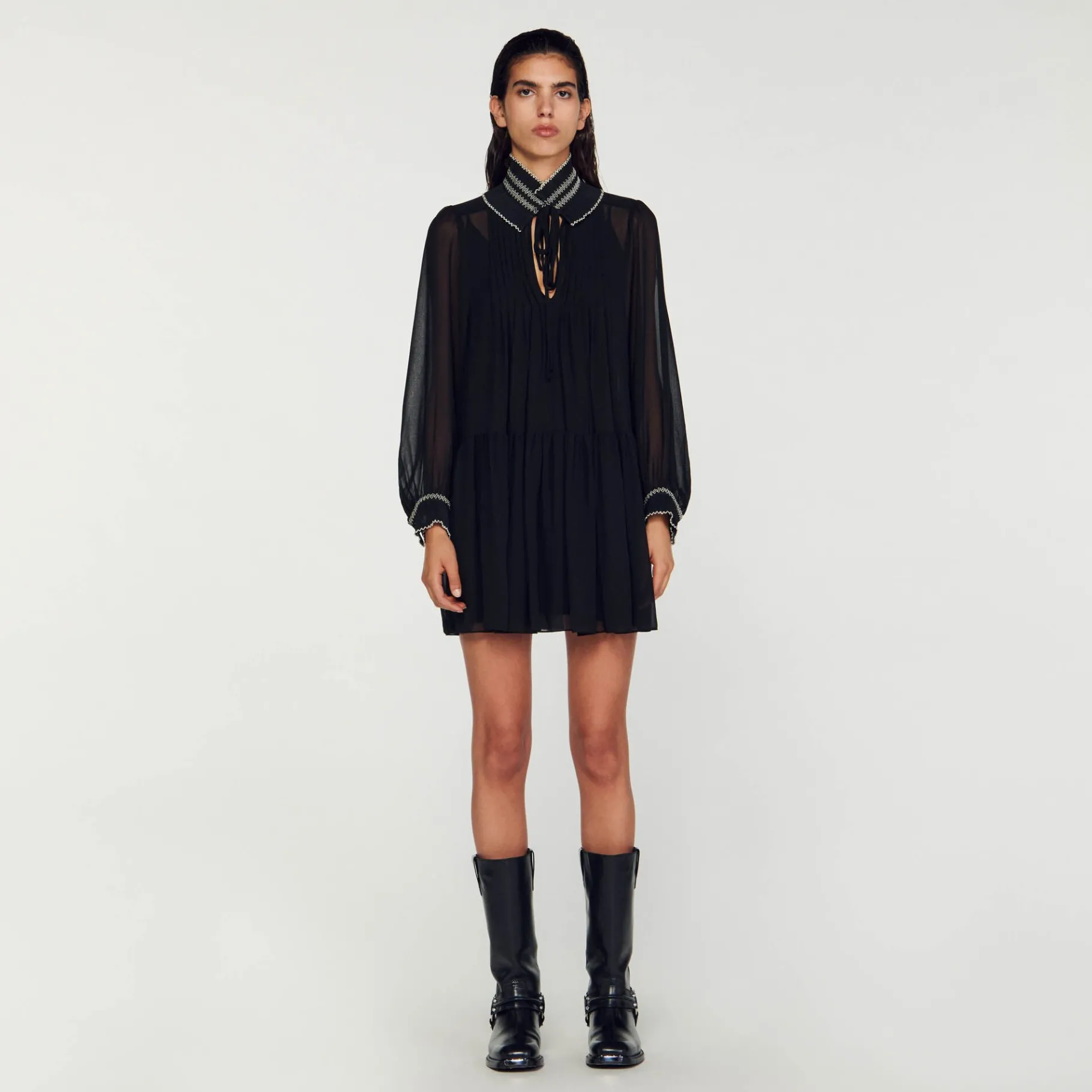 Vestido Fluido De Muselina Con Escote Anudado Y Puños Fruncidos Con Trenza Que Contrasta, Manga Larga Y Falda Con Volantes.
