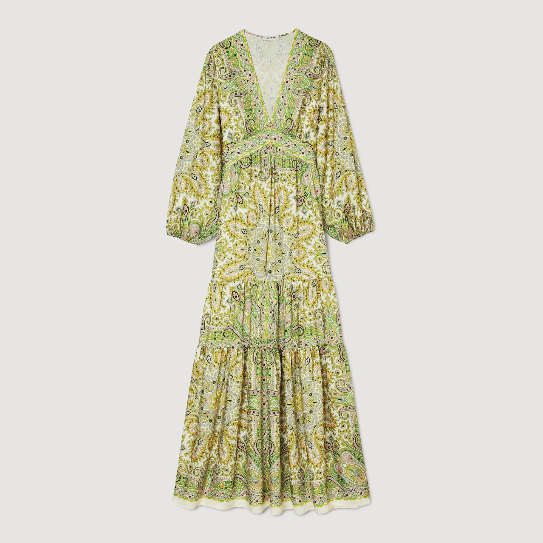 Vestido Largo, Fluido Y Satinado Con Escote De Pico, Manga Larga Voluminosa Con Puño Elástico, Falda Con Volante Y Juego De Frunces Y Estampado De Fular.
