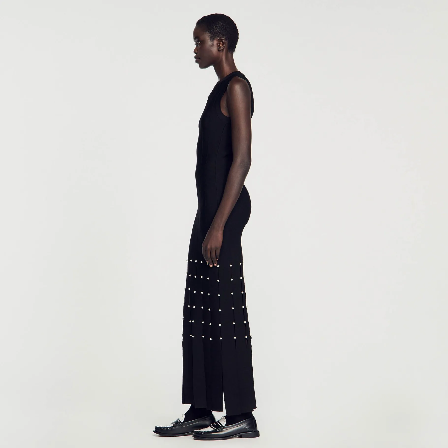 Vestido Largo Sin Mangas De Punto De Canalé Con Cuello Redondo, Raja Asimétrica En La Parte Delantera Y Decorado Con Pedrería Calada Decorada Con Brillantes De Imitación.