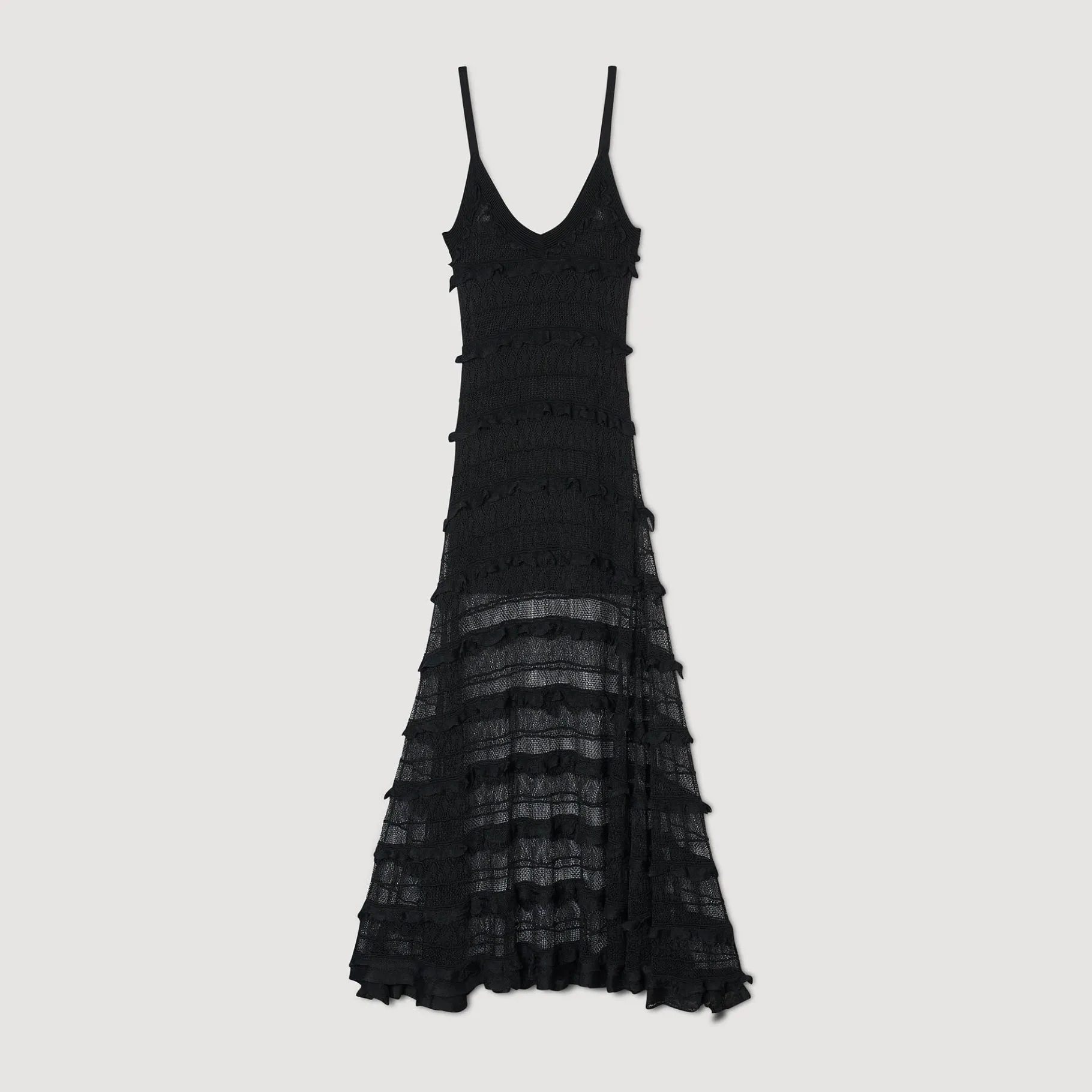 Vestido Largo De Punto Pointelle Con Volantes, Tirantes Finos, Escote De Pico Pronunciado Y Forro Corto.