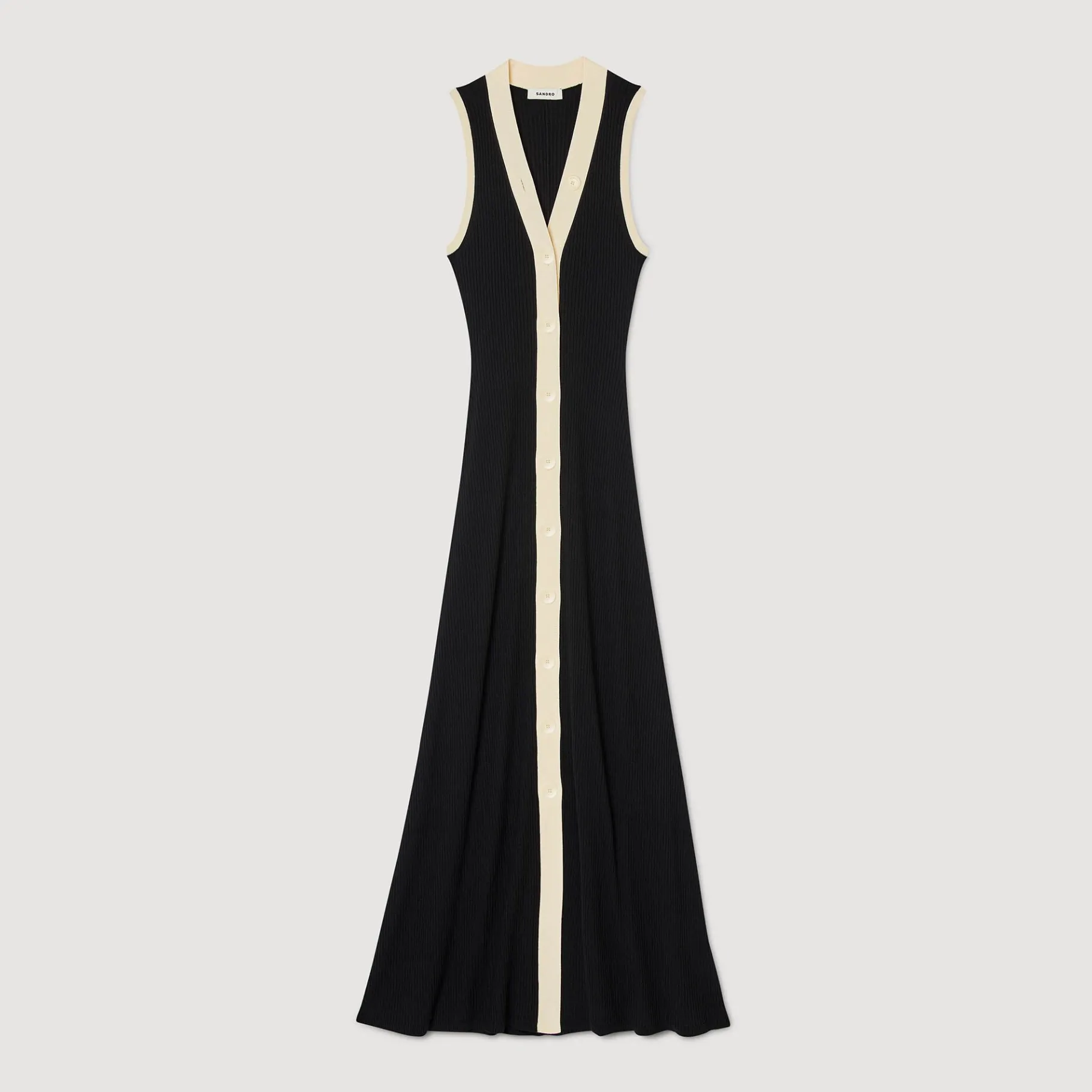 Vestido Largo De Punto Acanalado Bicolor Con Una Tapeta Con Botones Con Siglas Y Una Abertura Delantera.