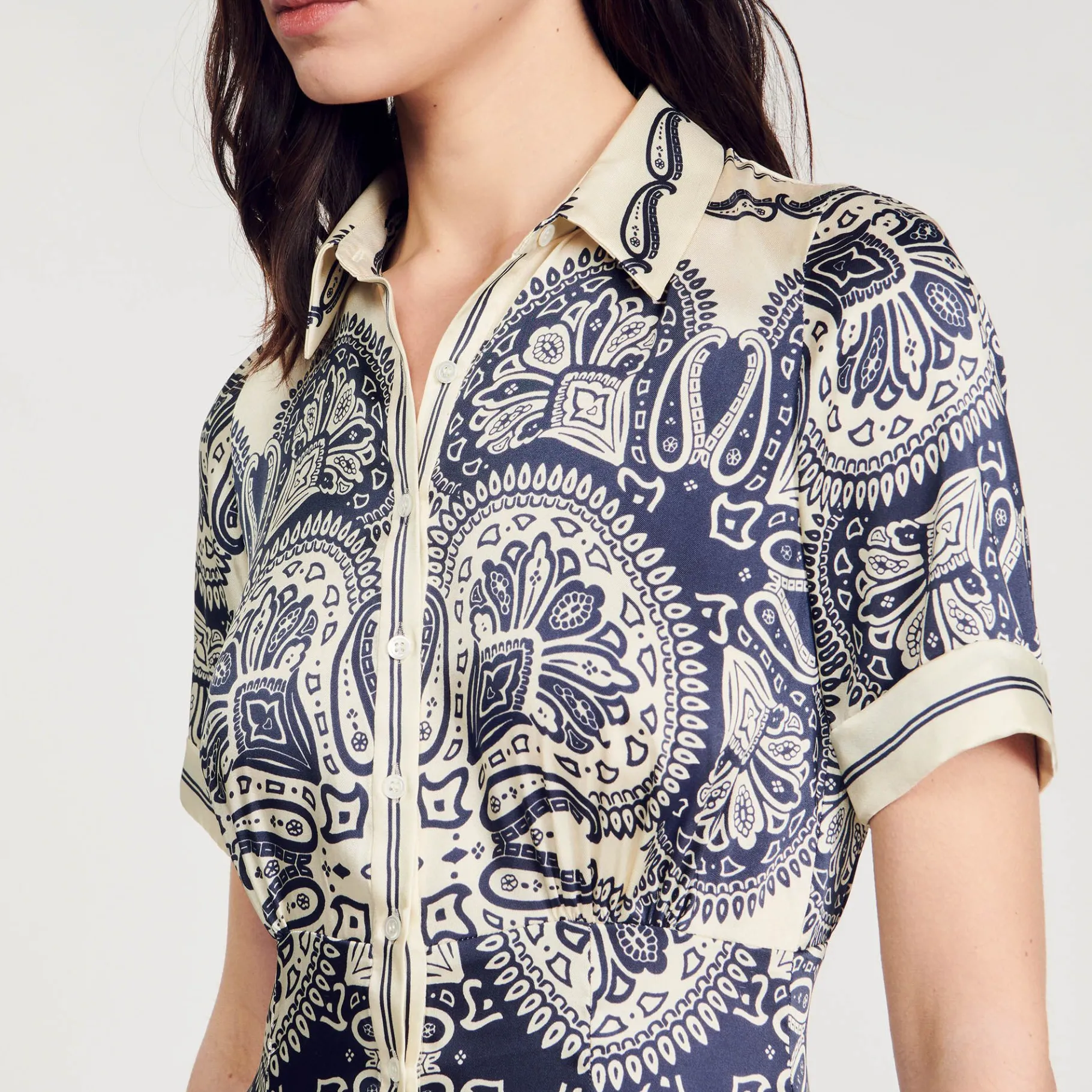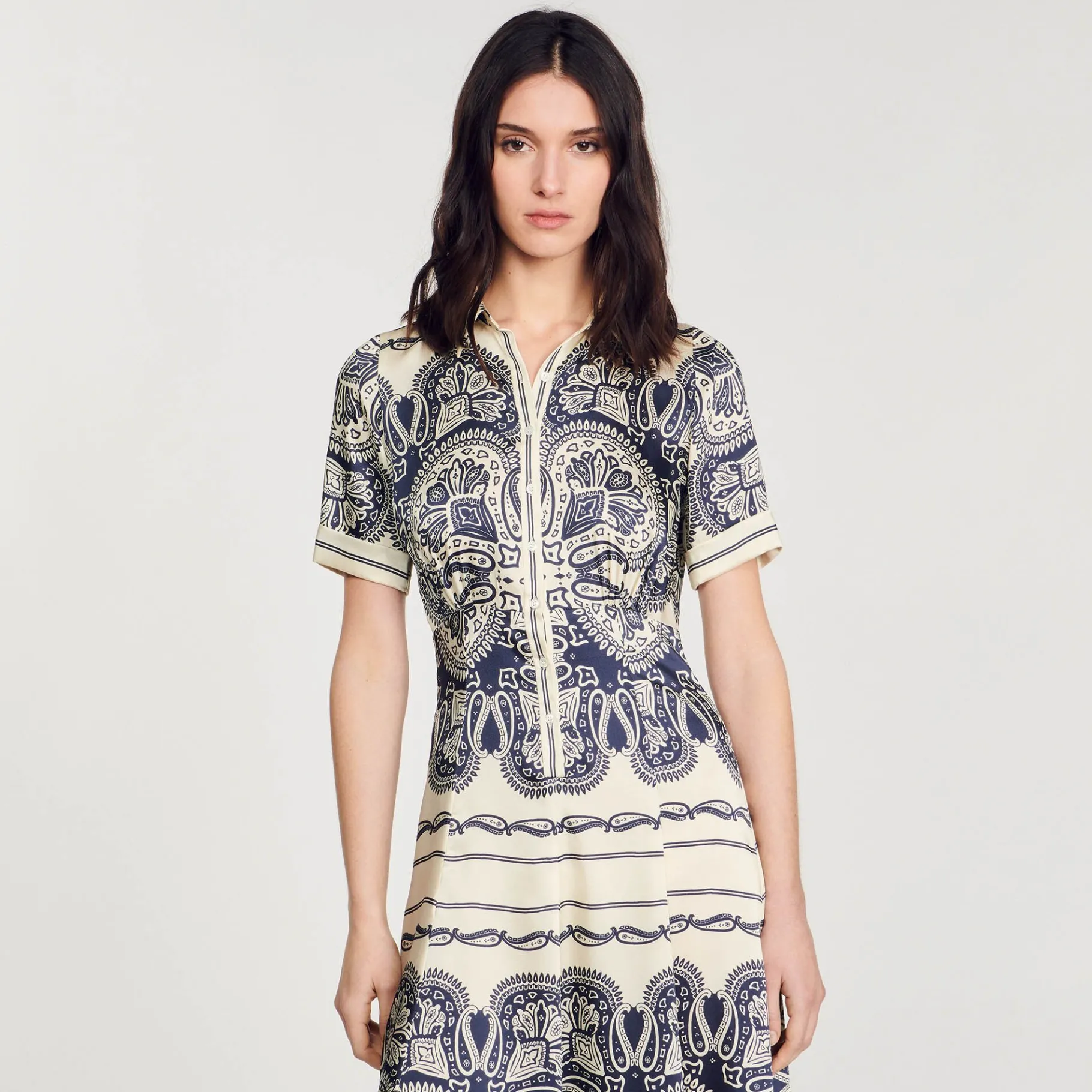 Vestido Largo Abotonado Con Cuello De Camisa, Manga Corta, Una Falda Acampanada Y Un Estampado De Cachemira.