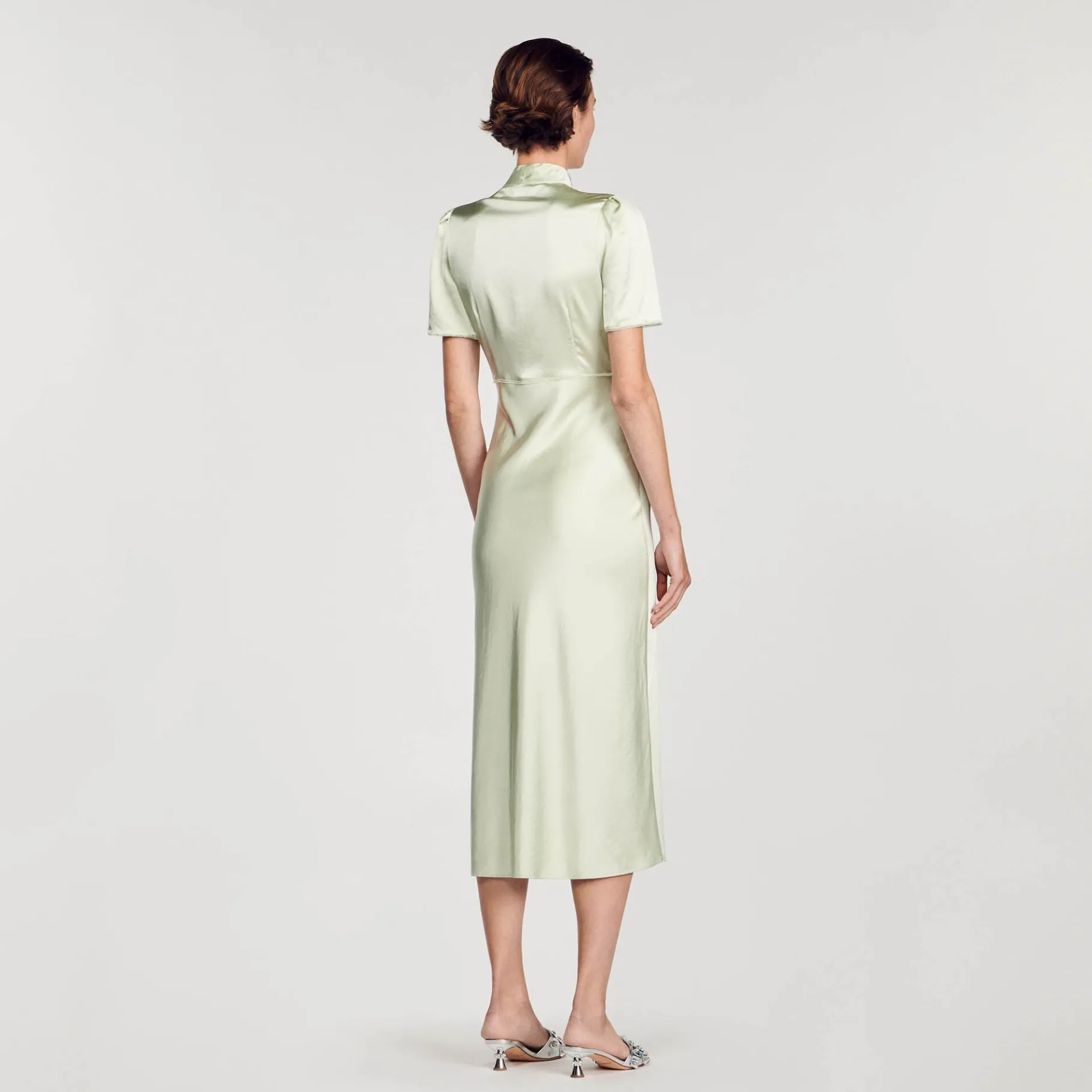 Vestido Largo Satinado Con Cuello Redondo, Manga Corta Y Decorado Con Una Abertura En Forma De Gota Fruncida En El Lateral Con Botón De Pedrería.