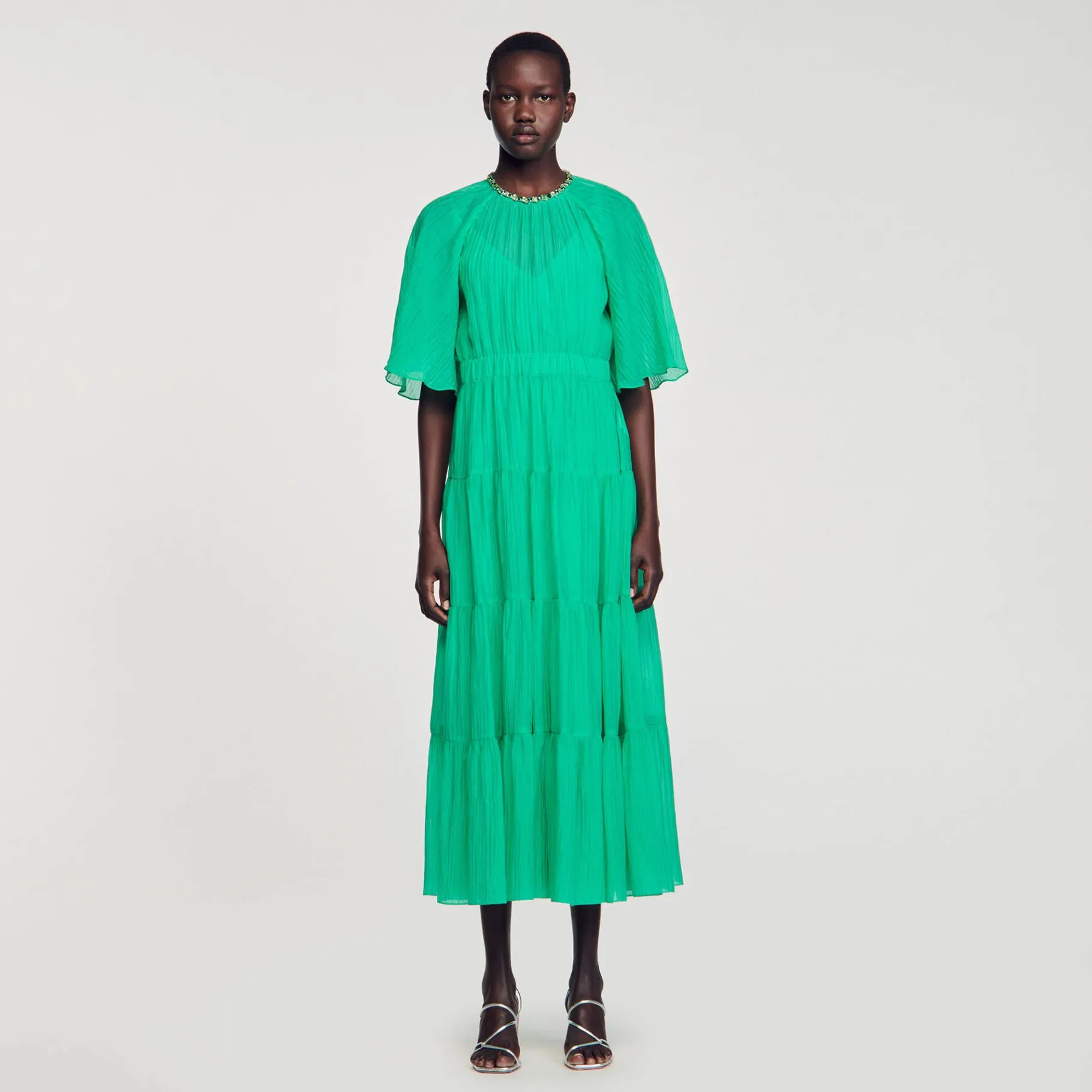 Vestido Midi Con Cuello Redondo Decorado Con Brillantes De Imitación, Mangas Cortas De Mariposa, Cintura Elástica Y Falda Acampanada.