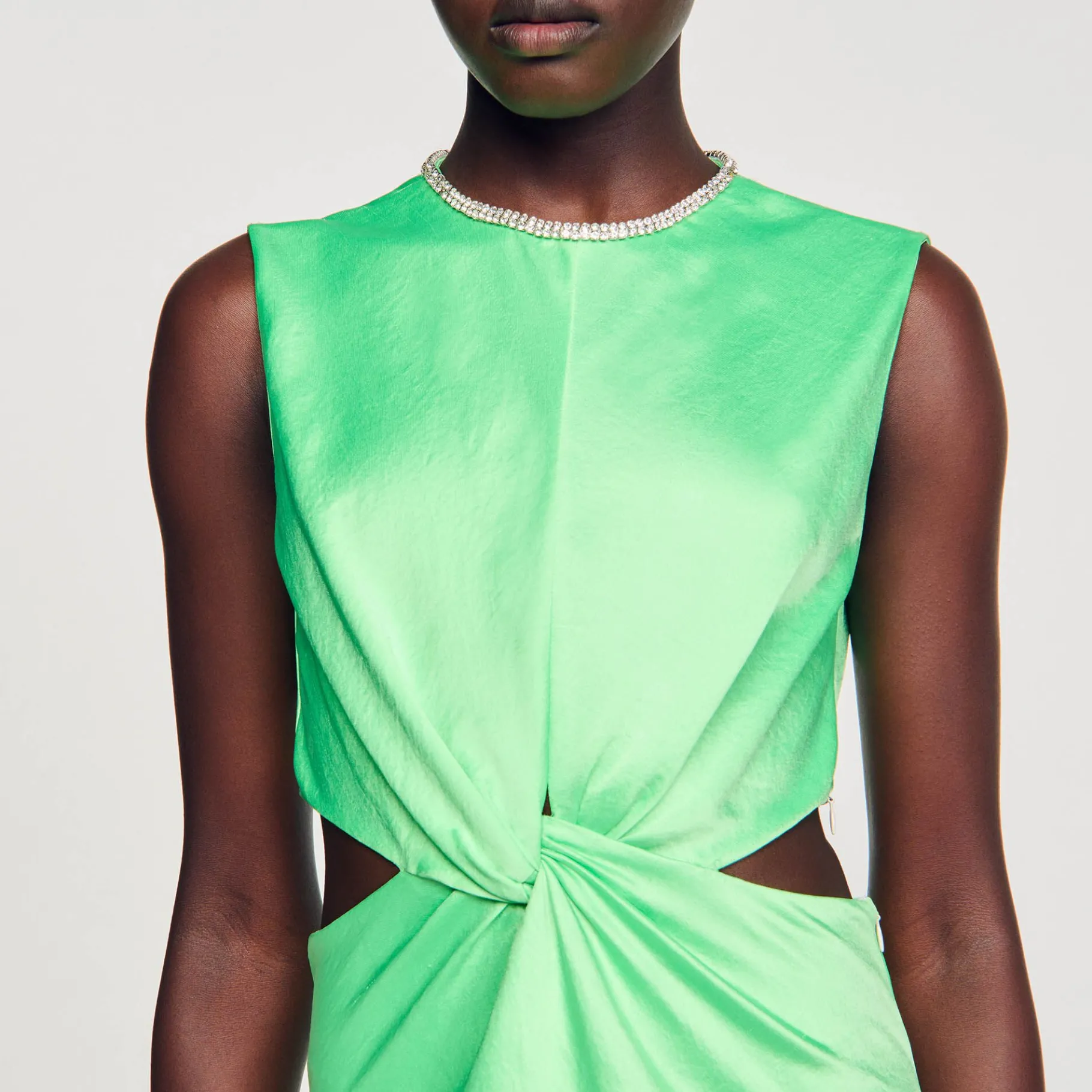 Vestido Midi Sin Mangas De Corte Recto, Con Cuello Redondo Con Detalle De Strass, Aberturas En Los Laterales Y La Espalda Y Juego De Nudos Plisados En La Cintura.