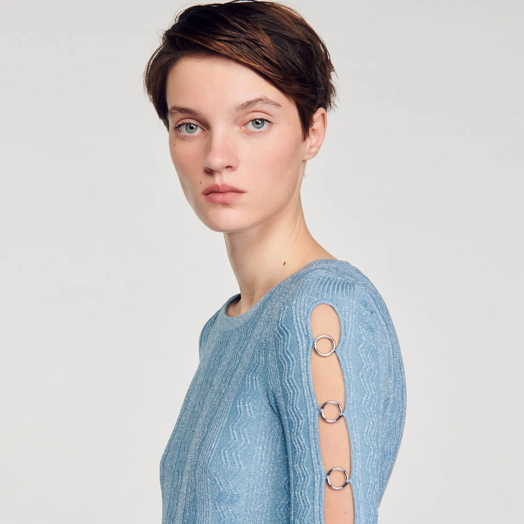 Vestido Midi De Punto Trenzado Irisado Con Cuello Redondo Y Mangas Largas Decoradas Con Anillas Metálicas A Lo Largo De Los Brazos.