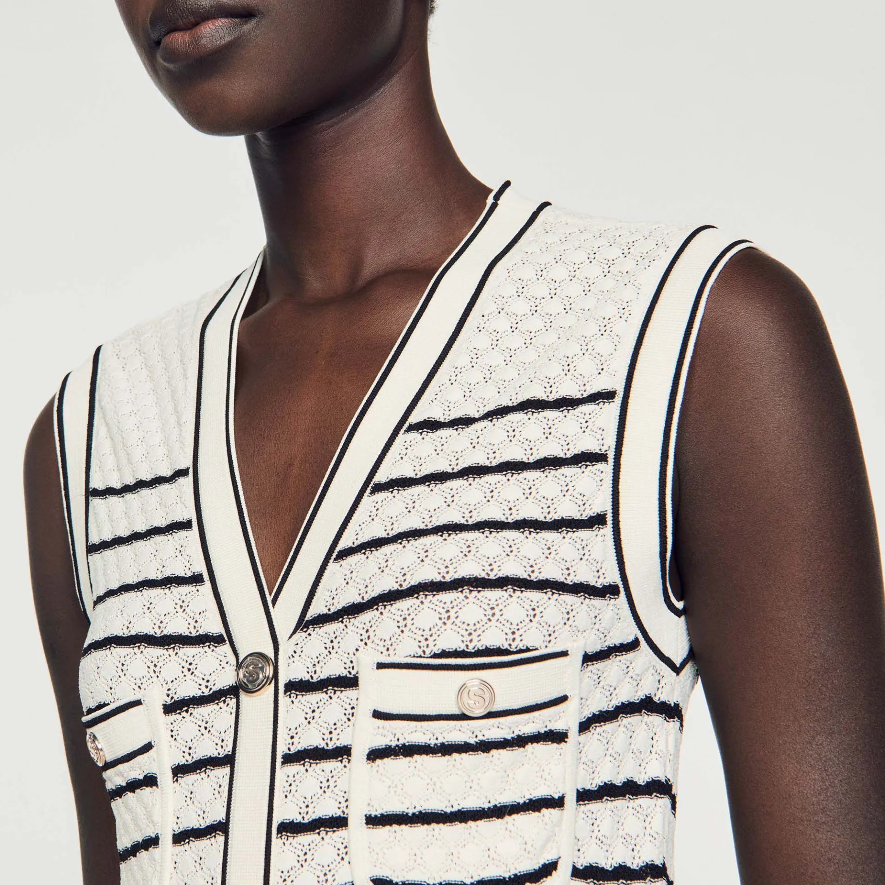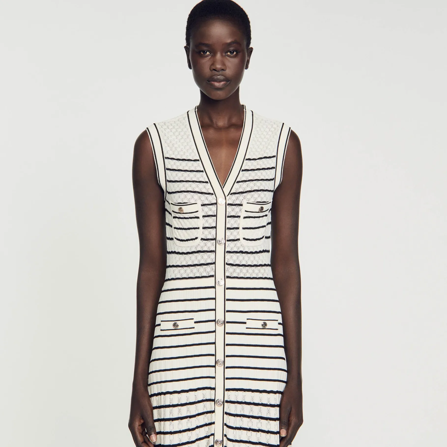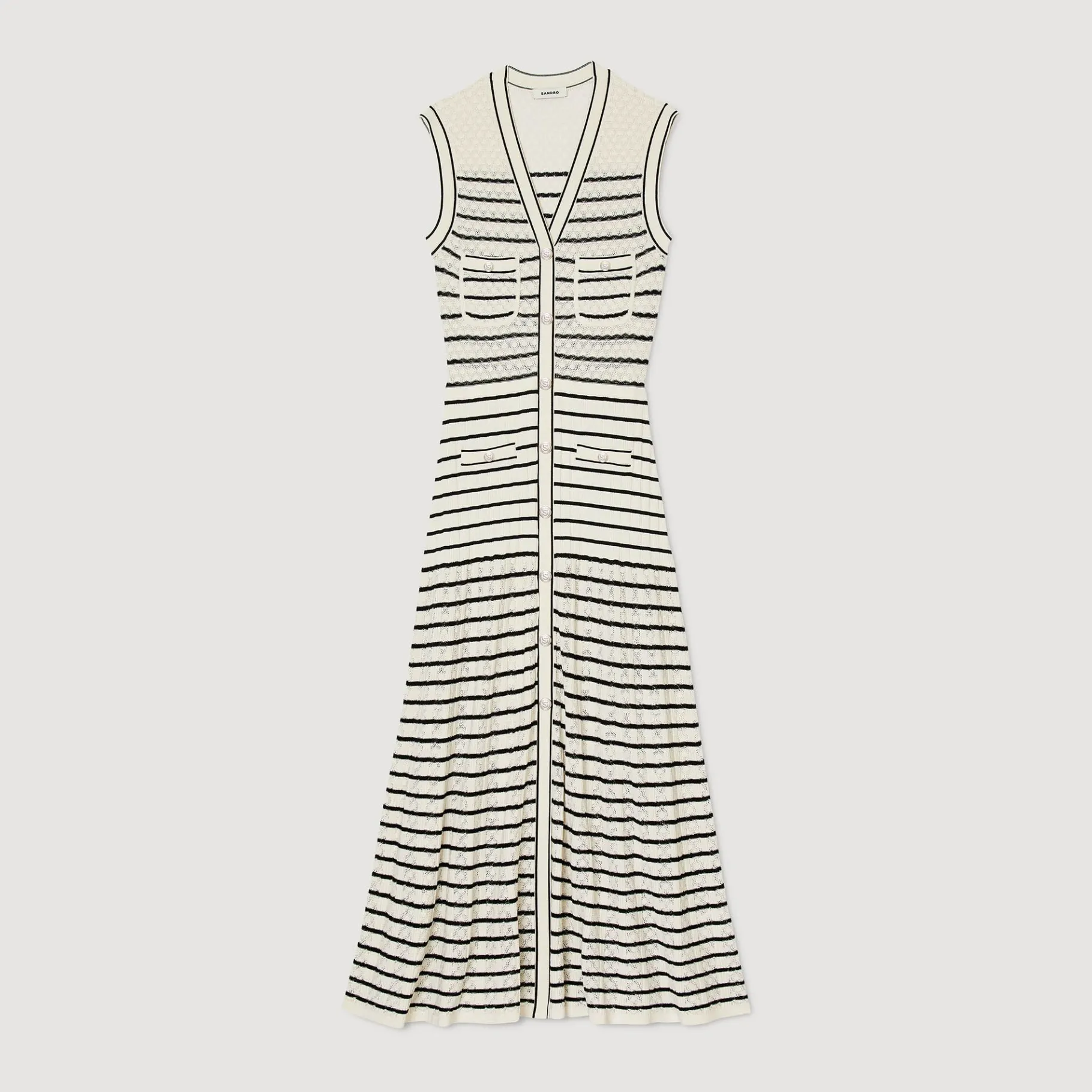 Vestido Midi De Punto De Fantasía De Rayas, Sin Mangas, Acampanado En La Parte Inferior Con Un Cuello De Pico Con Botones Y Bolsillos Tipo Parche.