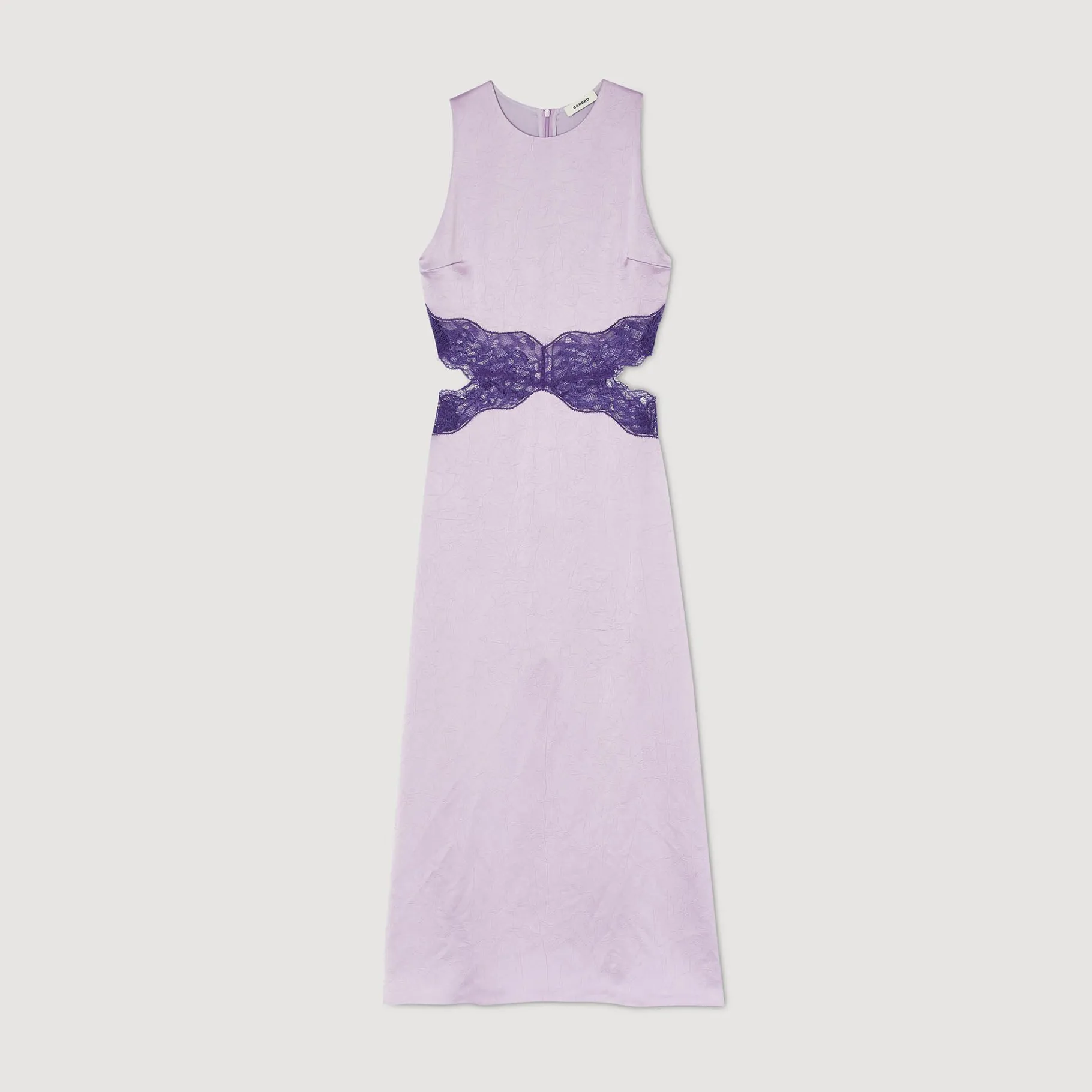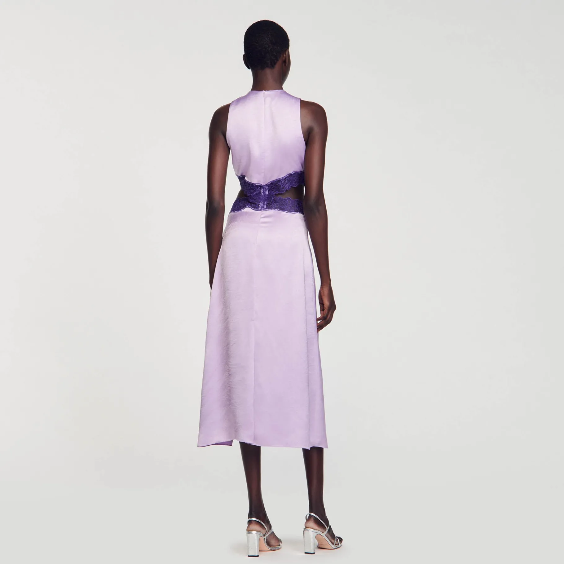 Vestido Midi Satinado Sin Mangas, Decorado Con Un Cinturón De Encaje En Contraste E Insertos Calados En La Cintura.